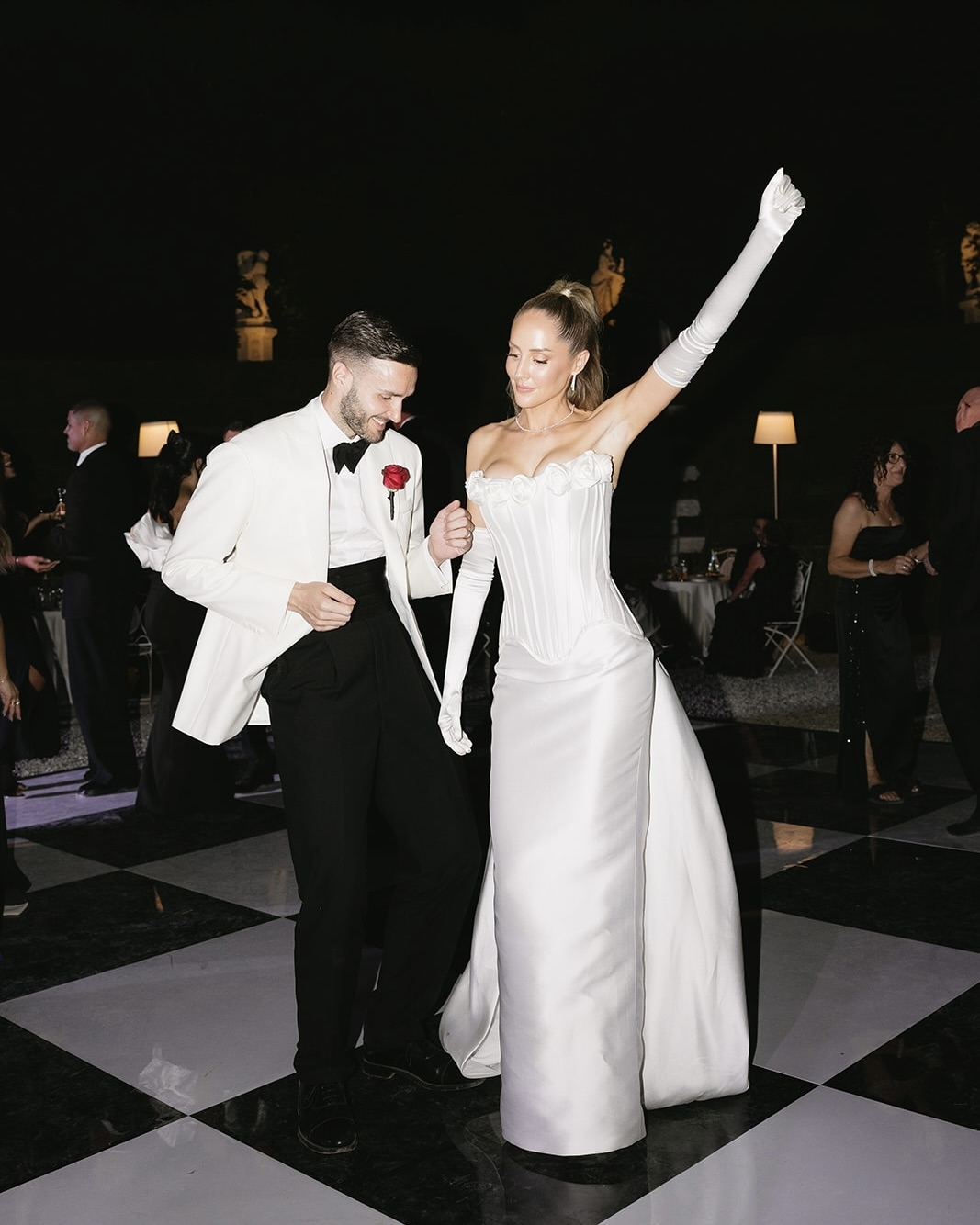 Ellie’s live vocals gave dinner the warmth of a dinner party while keeping the atmosphere romantic. The evening flowed perfectly—ideal weather, heartfelt speeches, and unforgettable Italian food. After dinner, we changed outfits while the amphitheatre was transformed with a black-and-white chequered dance floor. We re-entered to fireworks for our cake-cutting, followed by our first dance under the night sky. Trays of fresh cannoli and gelato fuelled the party before guests moved inside to dance until 2 a.m., ending with late-night pasta.