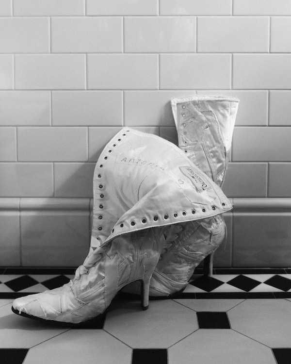 Later on I changed into a dress from my friend Zofia, that we worked on together for a while. It’s been made out of old Polish, lace tablecloths and patched together, creating a unique, asymmetrical design. My shoes were from Madomorpho, and they were created from white ballerina pointe shoes. It was very sentimental for me, as I used to dance professionally in the past, so it just felt right.
