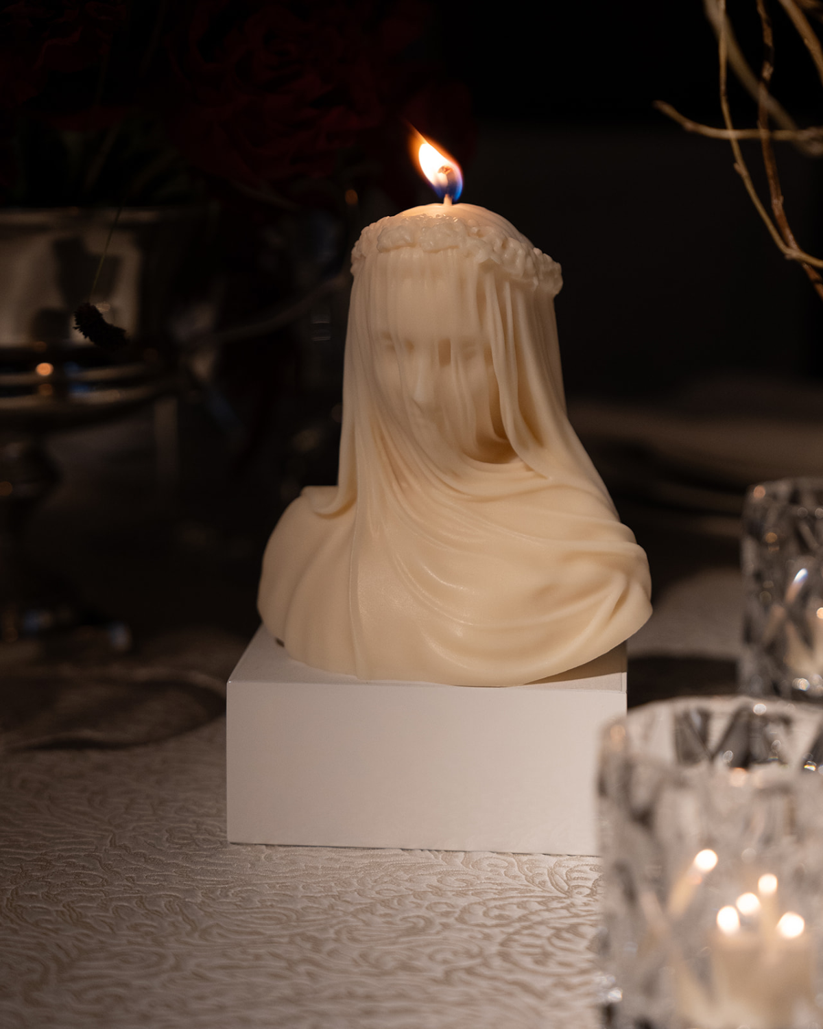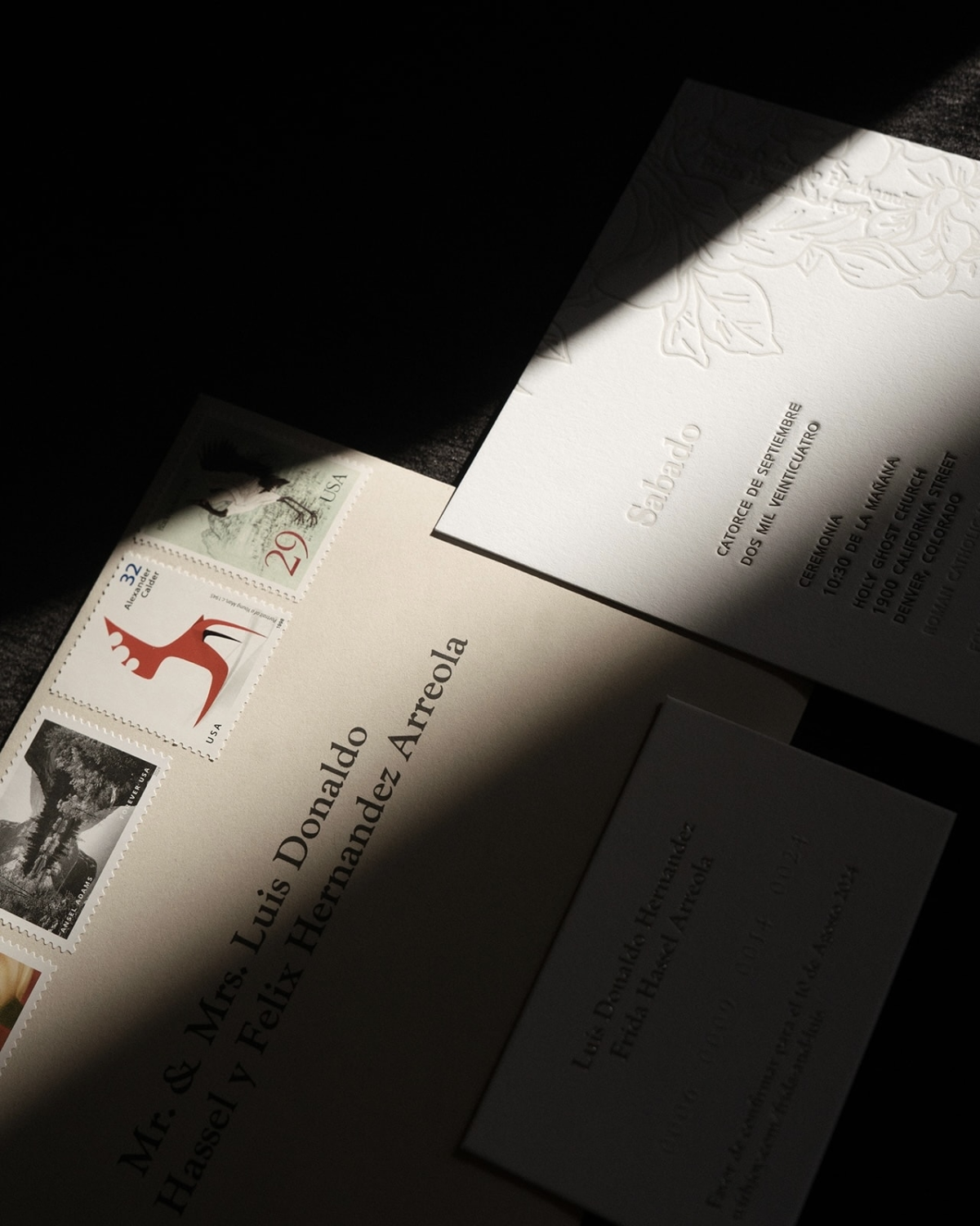 Our reception space at The University Club of Denver was completely transformed with dramatic draping, otherworldly florals, and religious iconography candles. The centerpiece of the evening's events was a large draped screen where we projected core life memories on film. Our paper goods by the amazing Birdsong Design House were in English and Spanish to reflect our upbringing in Mexico. Mike Yung, my husband’s favorite singer, flew in from New York to perform our first dance song and a private set. Our cake by Intricate Icings was the size of an entire table and was decorated to mimic my custom headpiece. And of course, the overall theme was a reflection of our favorite designer, Maison Margiela.