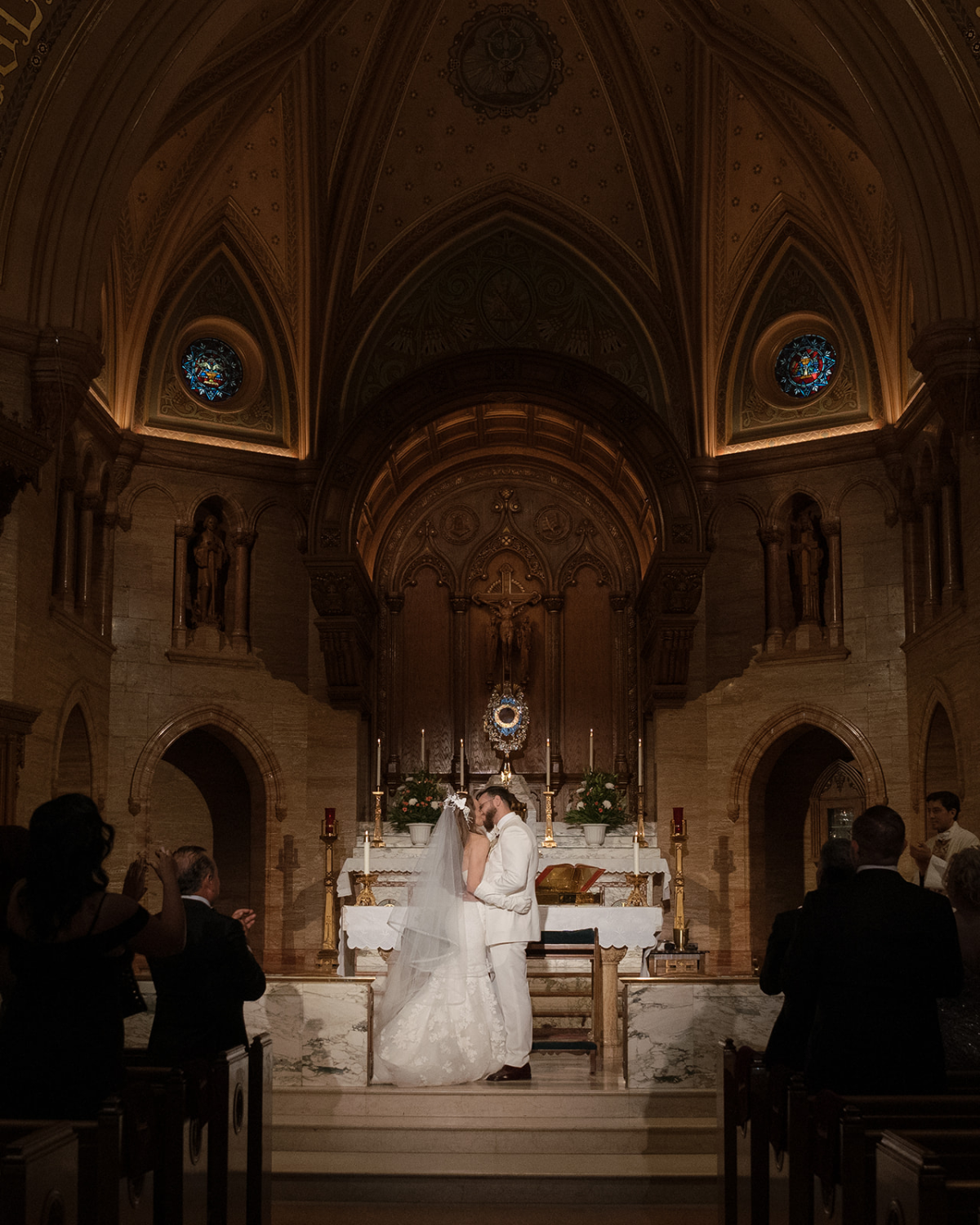 Our ceremony was held in a historic catholic church in the middle of Denver. It was the perfect backdrop for such a sacred part of the day, and it was also uniquely aligned with our overall vision that harkened back to Maison Margiela's runway shows in the 90s. Downtown Denver has a grungy and in certain places gothic feel, and it felt creatively interesting and expansive to hold such a lux event amidst all that history. Rosemary Floral, our incredible florist, created a showstopping arch of lilies at the church's exit, which set the backdrop for our recessional and celebratory moments with friends and family post-ceremony.