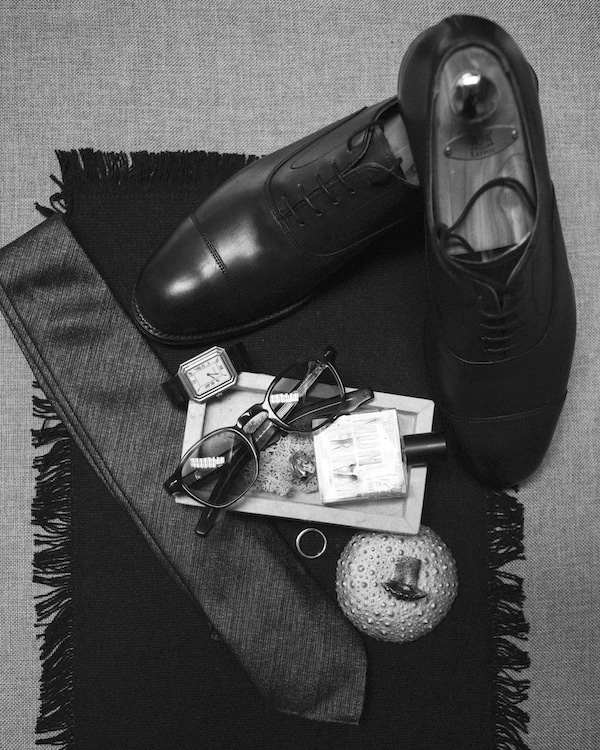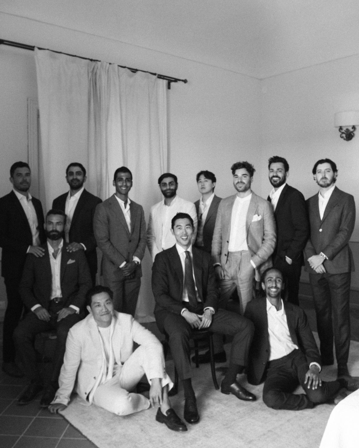 Alvin wore a Nanushka crochet shirt and seersucker trousers from Stòffa for the welcome party. On the wedding day, he wore a custom gray suit from The Armoury and a vintage Cartier Cristallor watch. And for the after-party, he changed into a fun and comfortable Issey Miyake outfit.