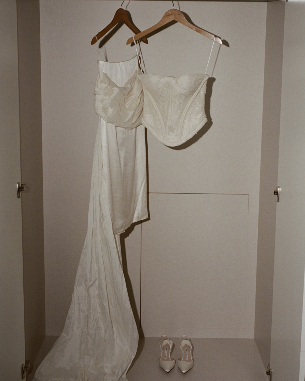 I wore an archived Oscar de la Renta gown with a drop waist and waterfall train. My veil was also Oscar and had a thick lace border. For my second look, I wore a Danielle Frankel set featuring a corset top and a silk slip-style skirt with a draped train. I always knew the type of dress I wanted: strapless, simple, and clean-cut.
