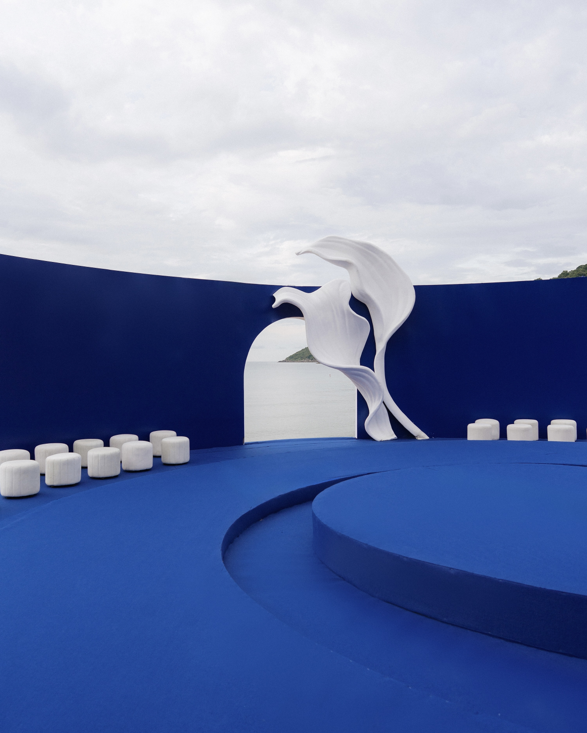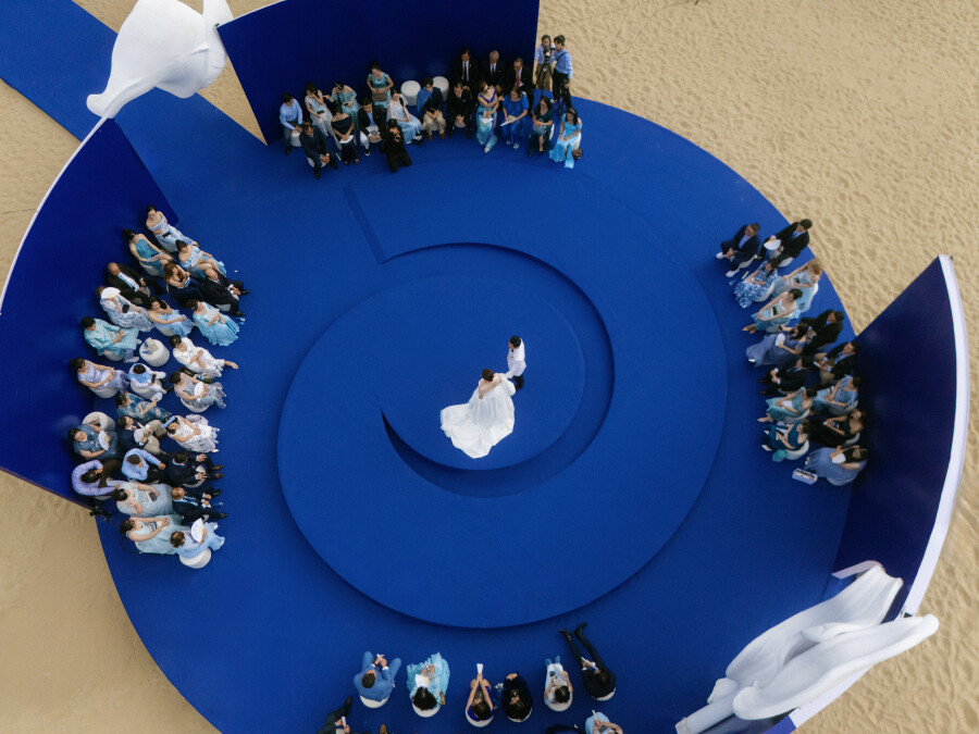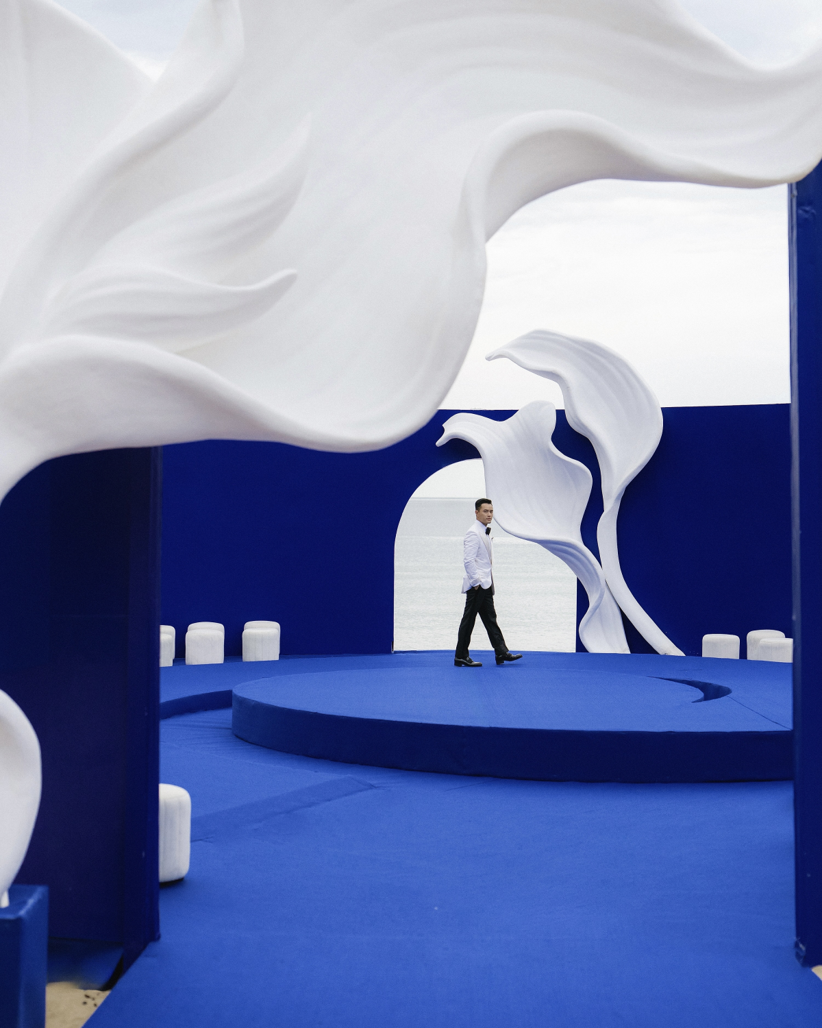 Our ceremony at Barefoot Beach featured a sculptural round stage in cobalt blue—minimal yet dramatic. The only flowers were calla lilies, a gentle contrast in the flowerless theme, reflecting us: simple and quiet on the outside, bold and unique within.