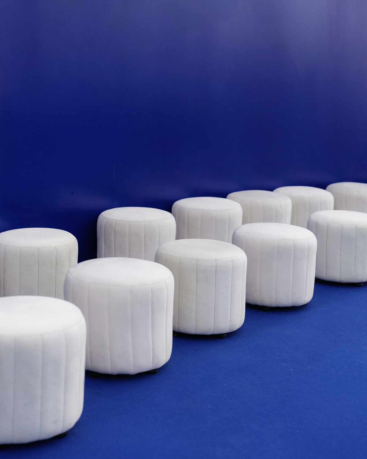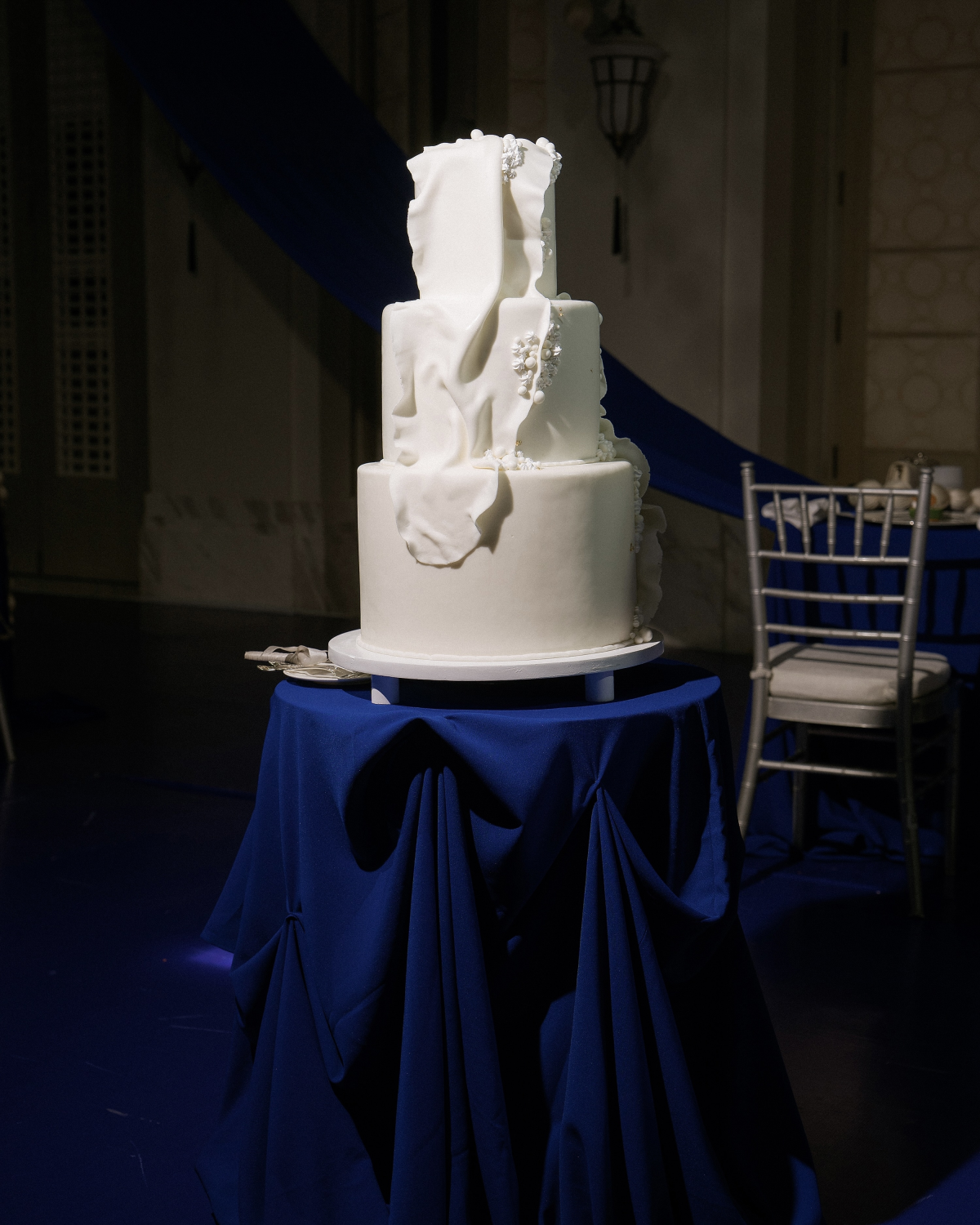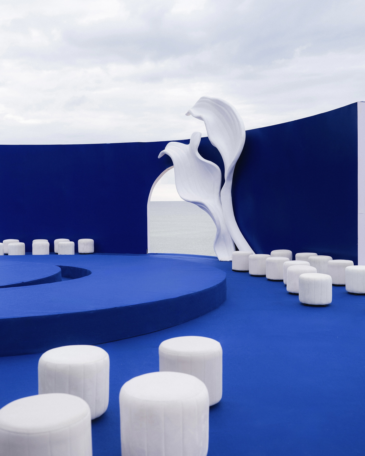 Our ceremony at Barefoot Beach featured a sculptural round stage in cobalt blue—minimal yet dramatic. The only flowers were calla lilies, a gentle contrast in the flowerless theme, reflecting us: simple and quiet on the outside, bold and unique within.