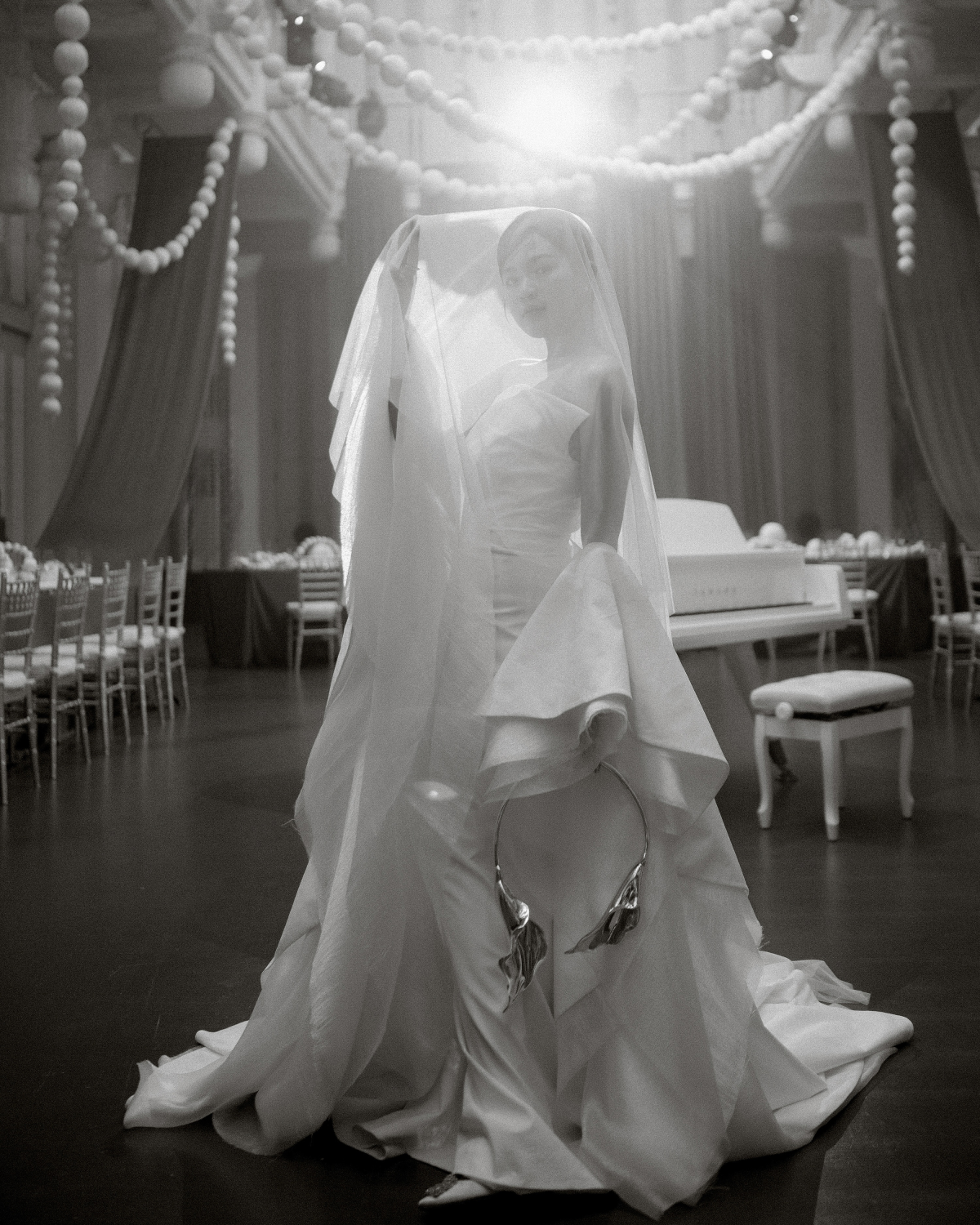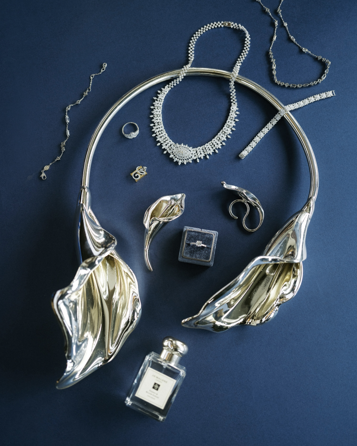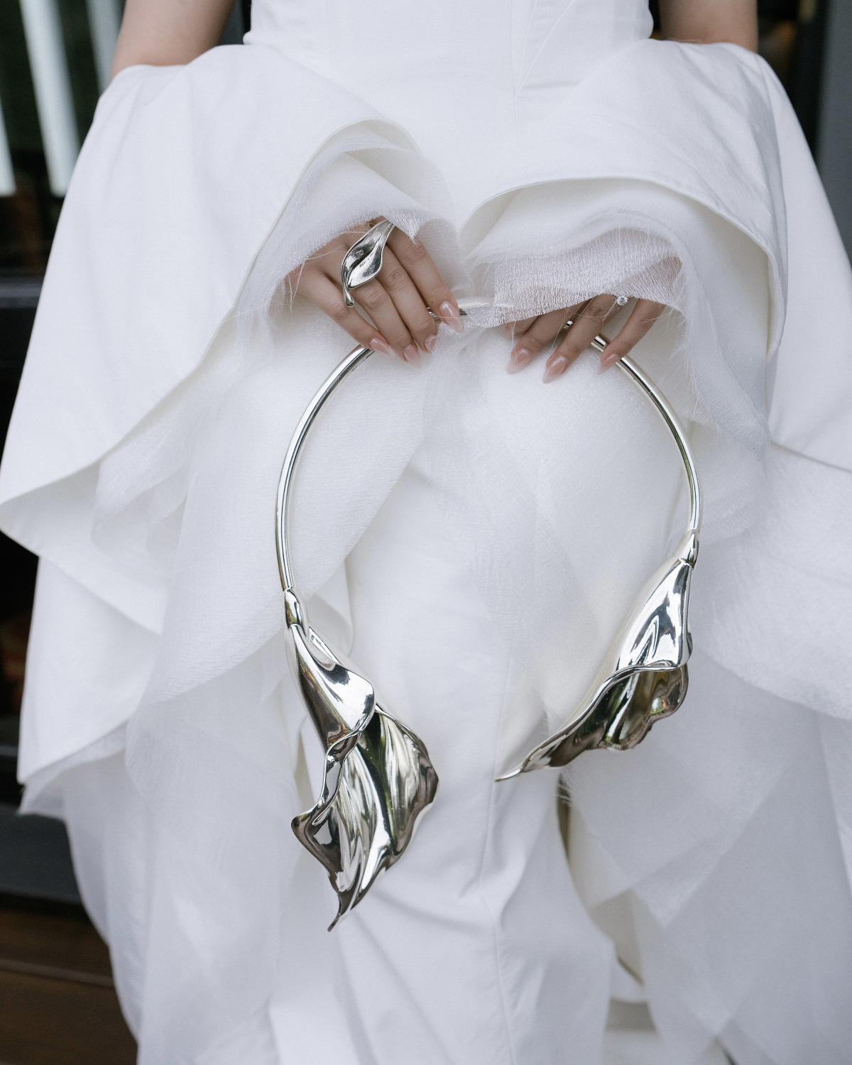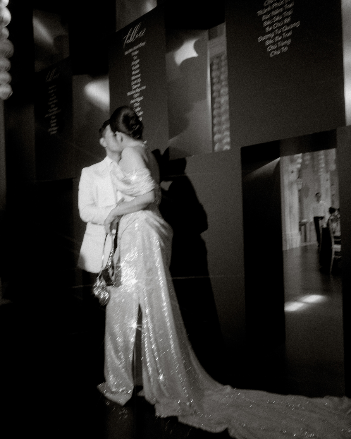 Instead of a traditional bouquet, I carried sculptural metallic calla lilies—bold, modern, and in perfect harmony with our no-flower décor theme. The bouquet itself became an artistic statement: unconventional yet deeply symbolic. For the reception, I transformed into a vision of glamour with a shimmering sequin gown by Barcadee, designed to make me the center of attention. The dress caught the light with every movement, creating a dazzling effect that felt both modern and celebratory. To elevate the look, I paired it with a diamond necklace and bracelet from Ngọc Thẩm Jewelry—pieces that added timeless sophistication and a touch of brilliance. Together, the ensemble struck the perfect balance between bold sparkle and refined elegance, ensuring the evening look was as memorable as the day. Bringing all of these elements together was The Gallerie.Styled. With a masterful eye for detail, he curated not only the fashion but also the makeup, accessories, and overall styling. His vision ensured every piece—gown, shoes, bouquet, beauty—formed a cohesive look that felt true to me and to the spirit of the celebration.