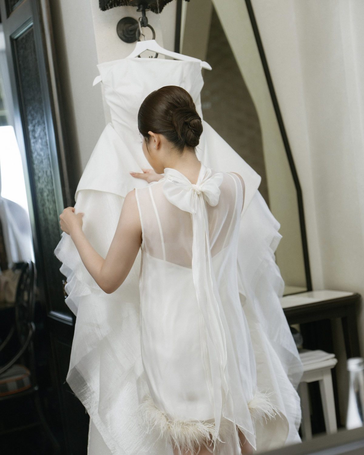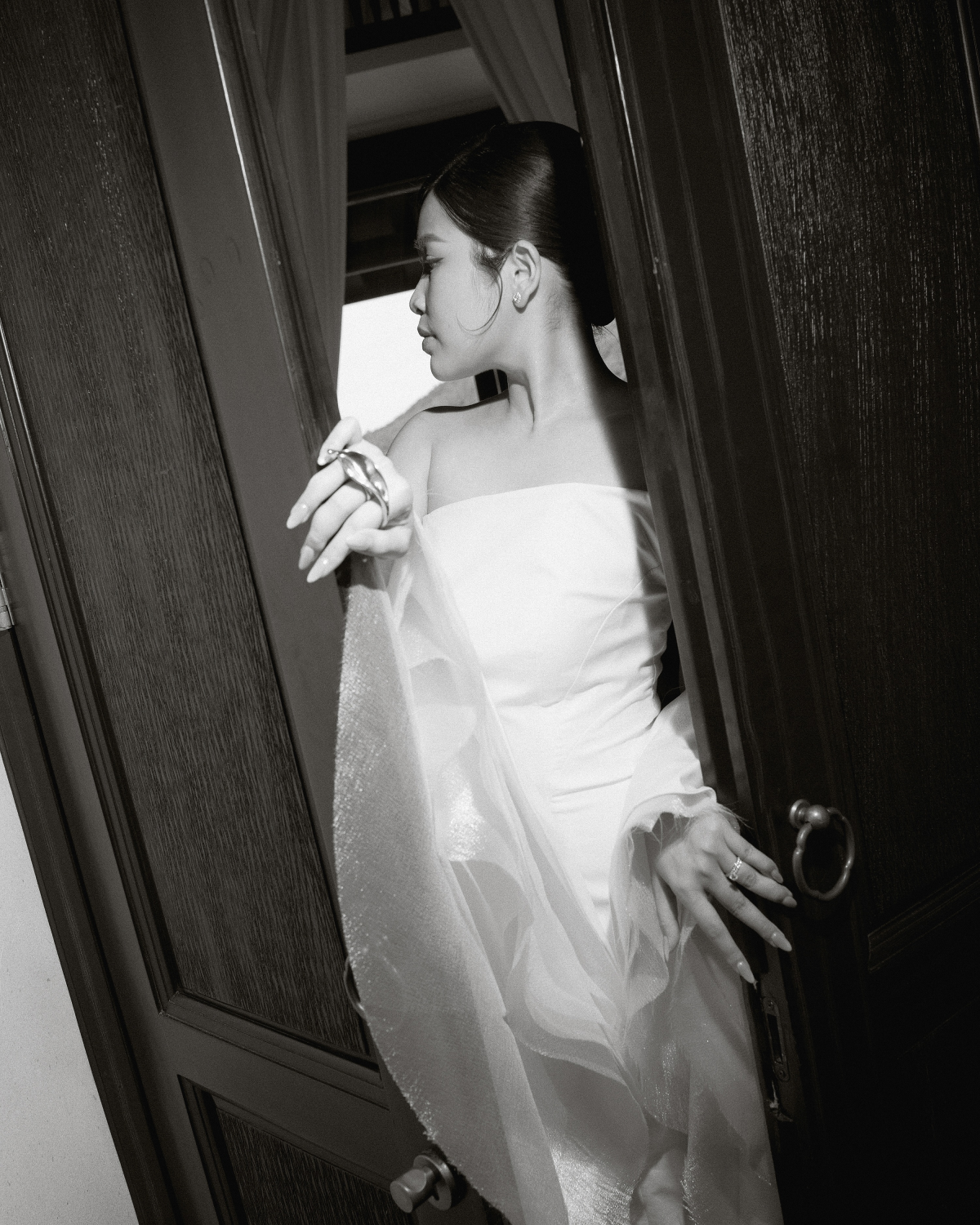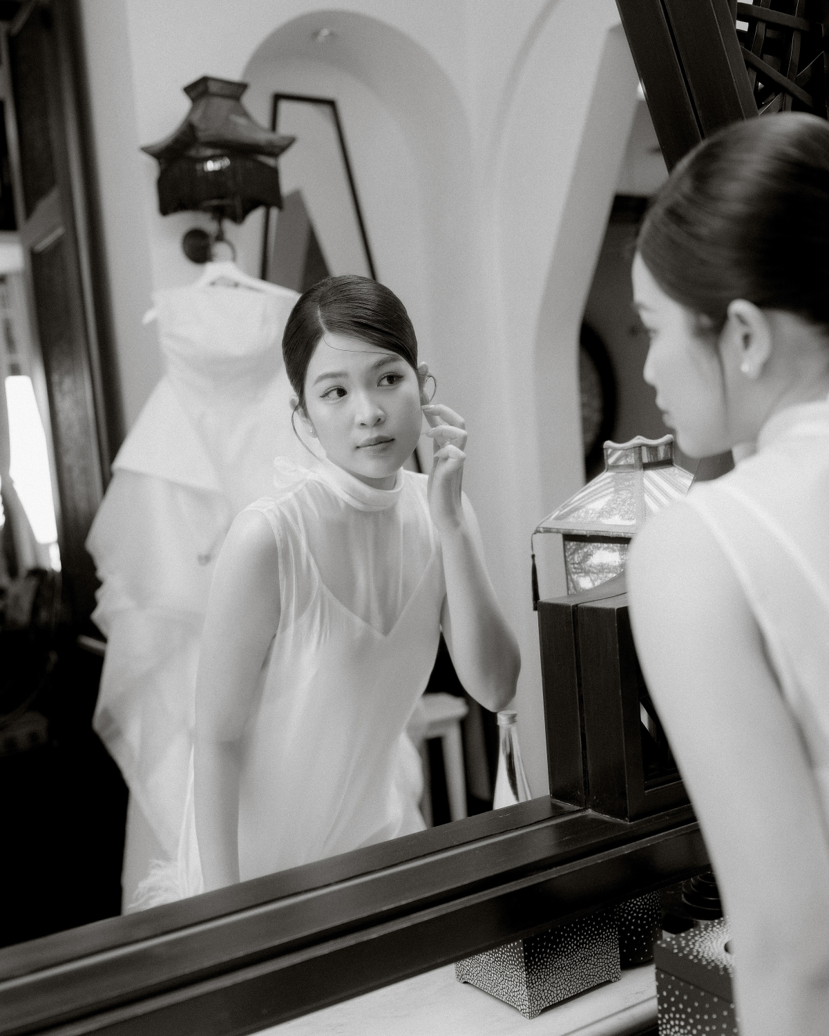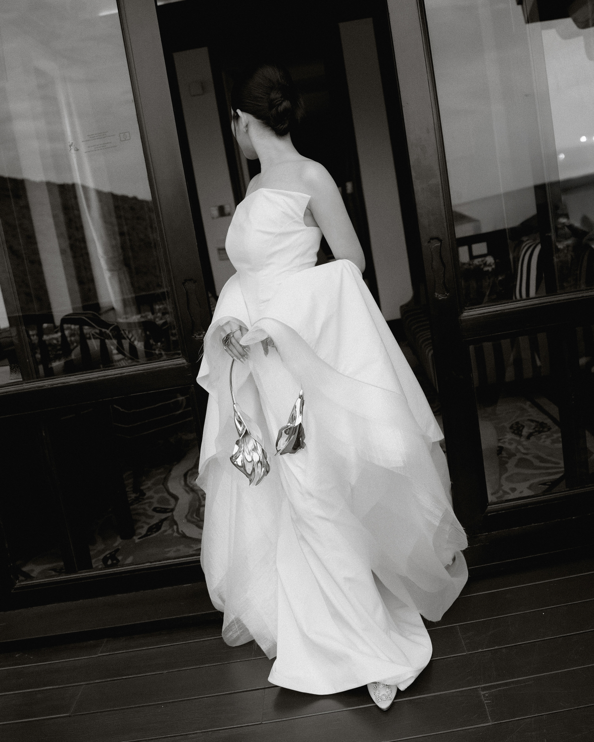 For the ceremony, I wanted to embody timeless elegance—classic, refined, and seamlessly tied to the wedding theme. My gown, designed by Phan Đăng Hoàng, was a true work of art. Inspired by the calla lily—the signature flower of the ceremony décor—he reimagined its graceful silhouette into cascading layered sleeves that draped softly, evoking petals unfolding in bloom. The structured bodice balanced the fluidity of the sleeves, creating a silhouette that was both romantic and architectural. Beauty was entrusted to MUA Quí Đoàn and Hair Stylist Eric Nguyễn, who highlighted my natural radiance with care and precision, creating a fresh, elegant look. To complete the look, I chose Manolo Blahnik’s iconic white satin pumps with a blue jewel buckle. More than just shoes, they carried the “something blue” tradition while adding a touch of sparkle that caught the light with every step.