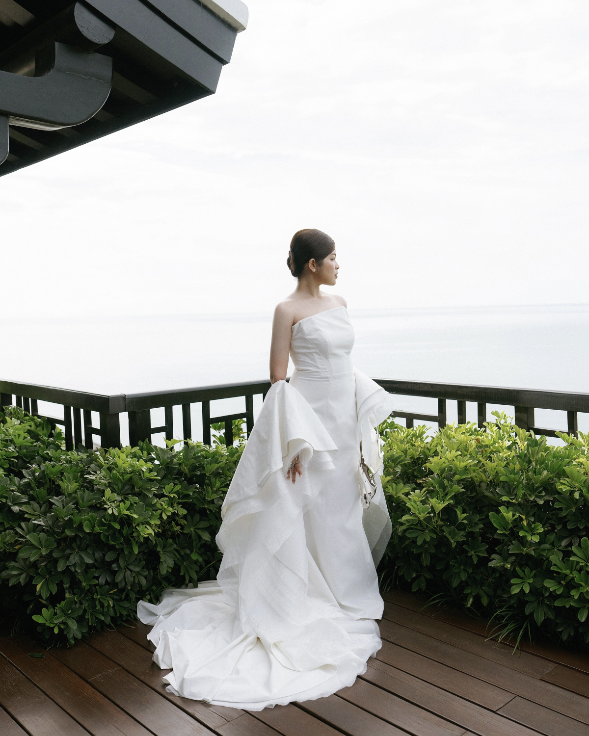 For both the ceremony and reception, Hieu embodied classic elegance in a made-to-measure Tom Ford chalk tuxedo, impeccably tailored and paired with a bold butterfly bow tie and polished tuxedo shoes, also from Tom Ford. A Rolex Datejust 41 Sundust watch lent the perfect touch of timeless refinement. His look captured the essence of a true gentleman—sophisticated yet traditional, confident yet understated—standing in perfect harmony with the bride’s bold and graceful style.