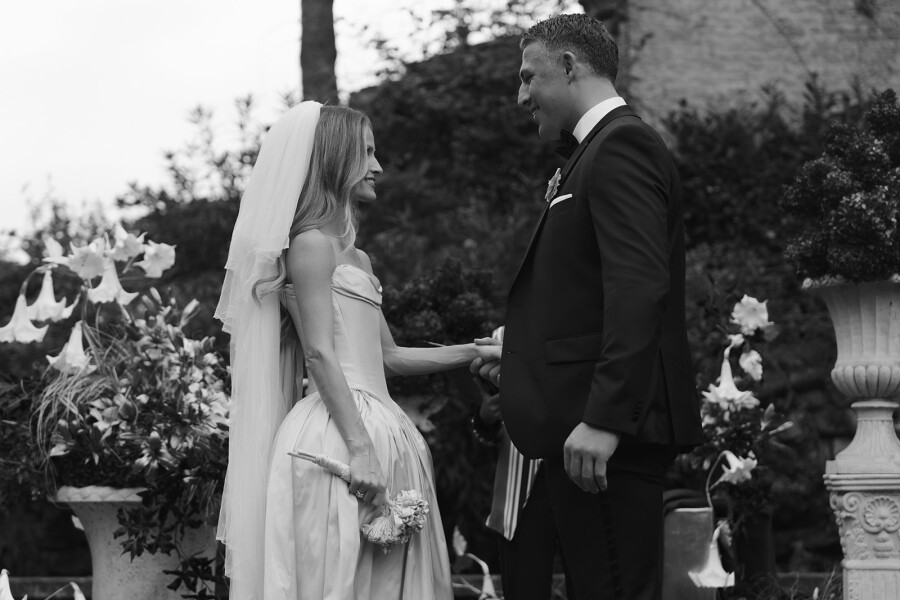 Set outdoors in a secret garden overlooking the city of Rome, every detail was carefully woven into the magic of the day. The garden was decorated with metallic-sprayed lilies and deep wine-hued hydrangeas, adding warmth to the setting. Majestic pillars framed the ceremony space, creating a timeless, intimate atmosphere. We kept the ceremony short and wrote our own personal vows, exchanging them with meaning, a few tears, a touch of humor, and heartfelt promises.