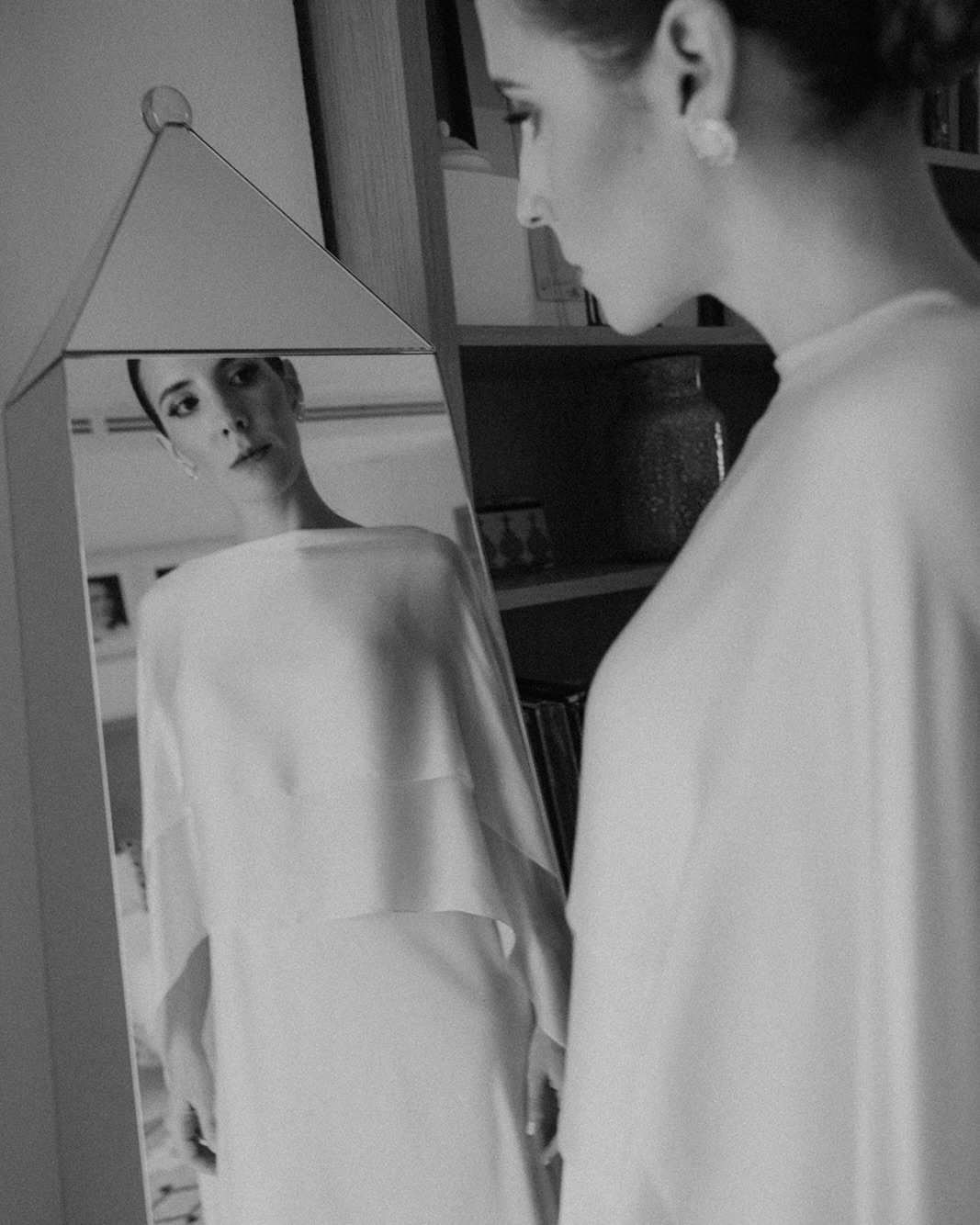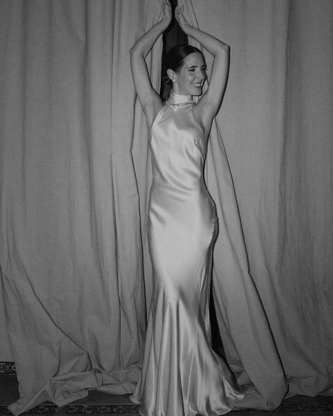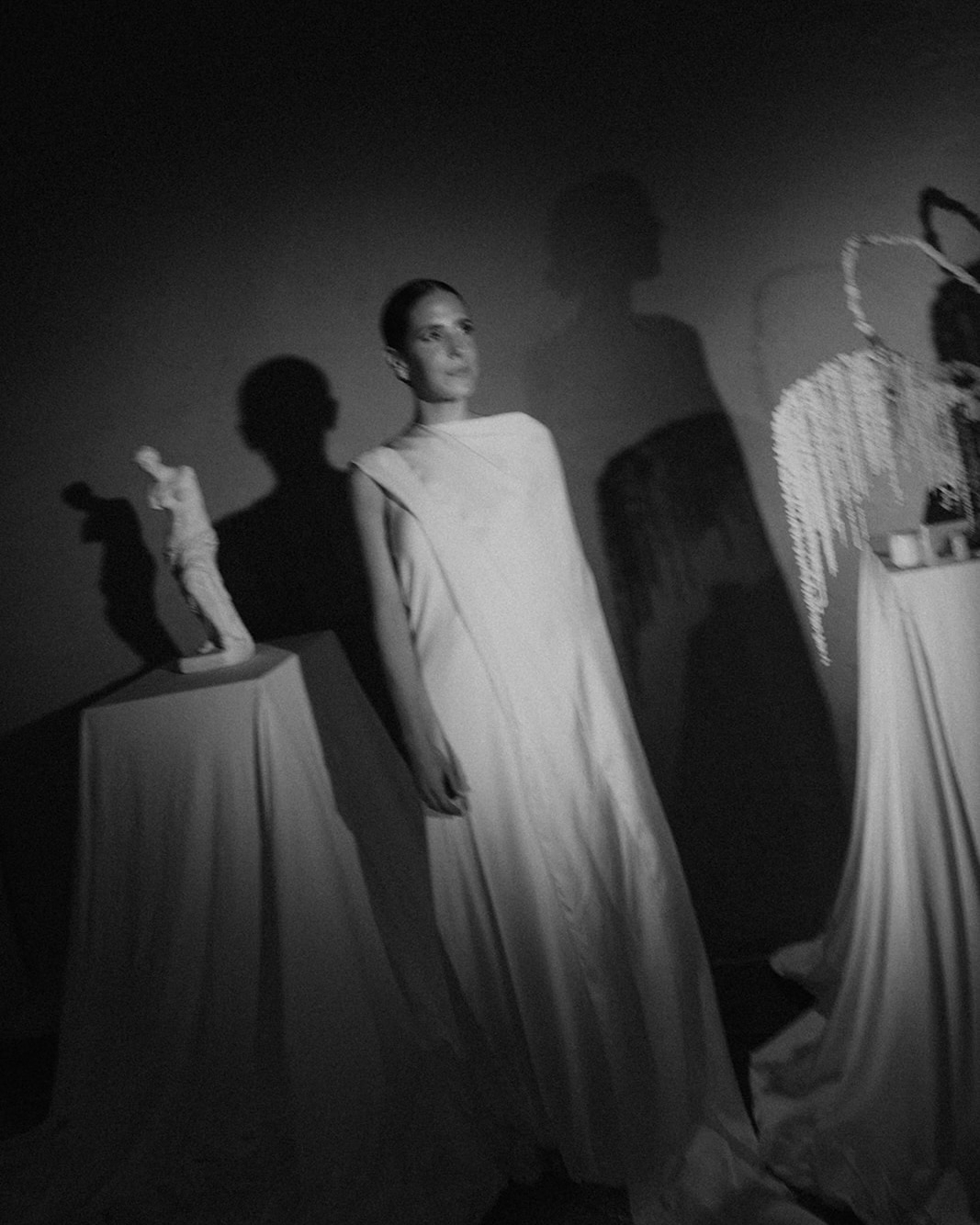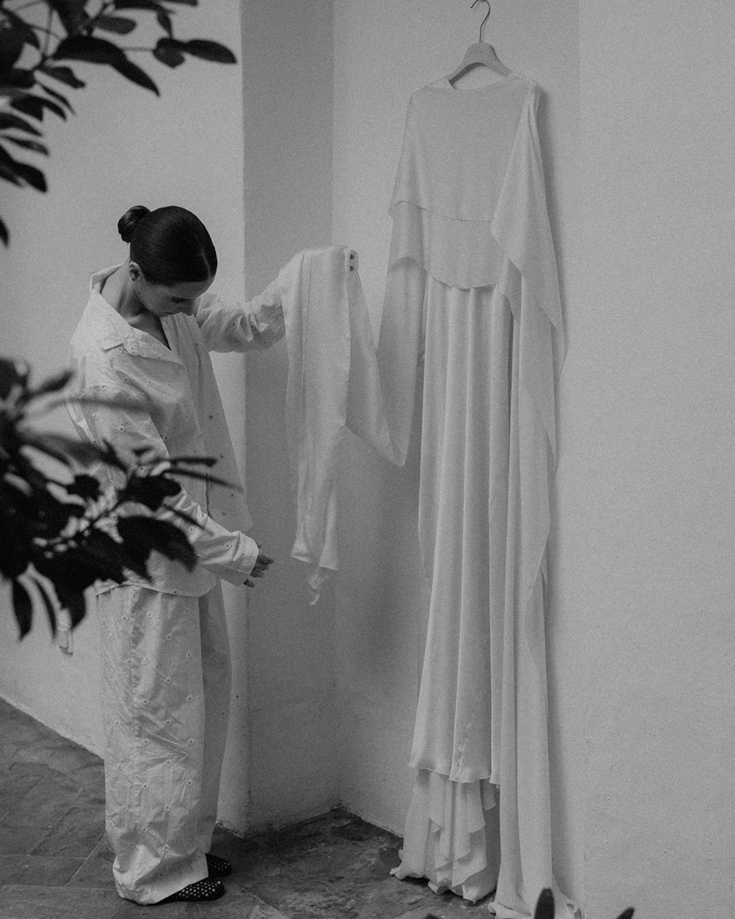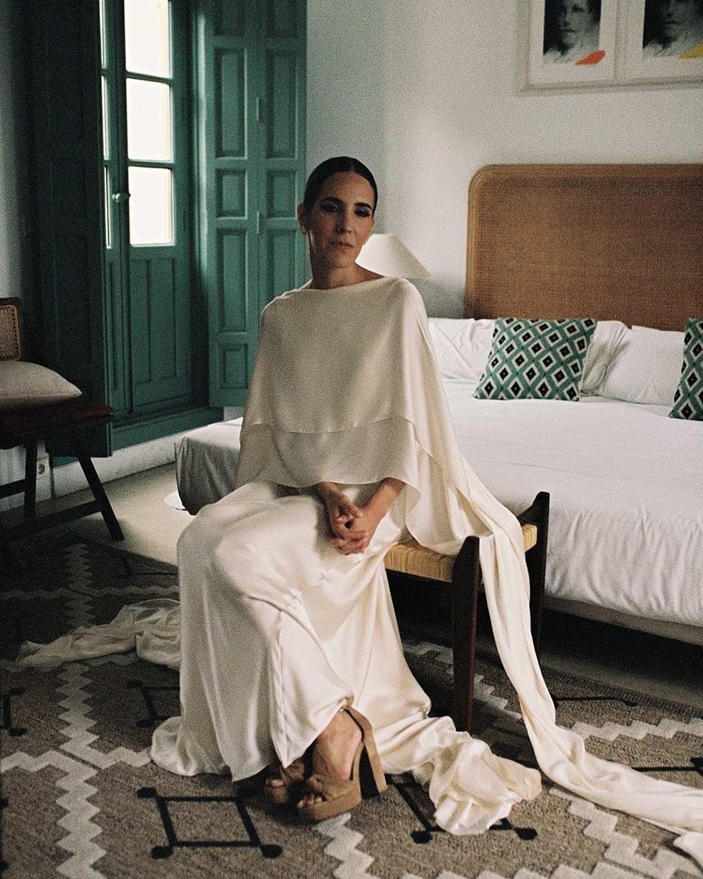 I chose a Cortana dress made of three layers of natural silk in an elegant ivory color, with a fine, graceful drape and movement. The dress allowed for multiple styling options, which I adjusted throughout the wedding. For the religious ceremony, I wore the silk cape draped over my shoulders.