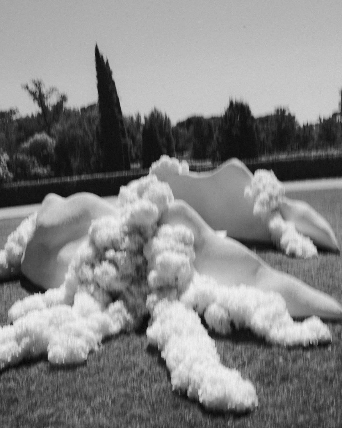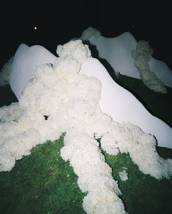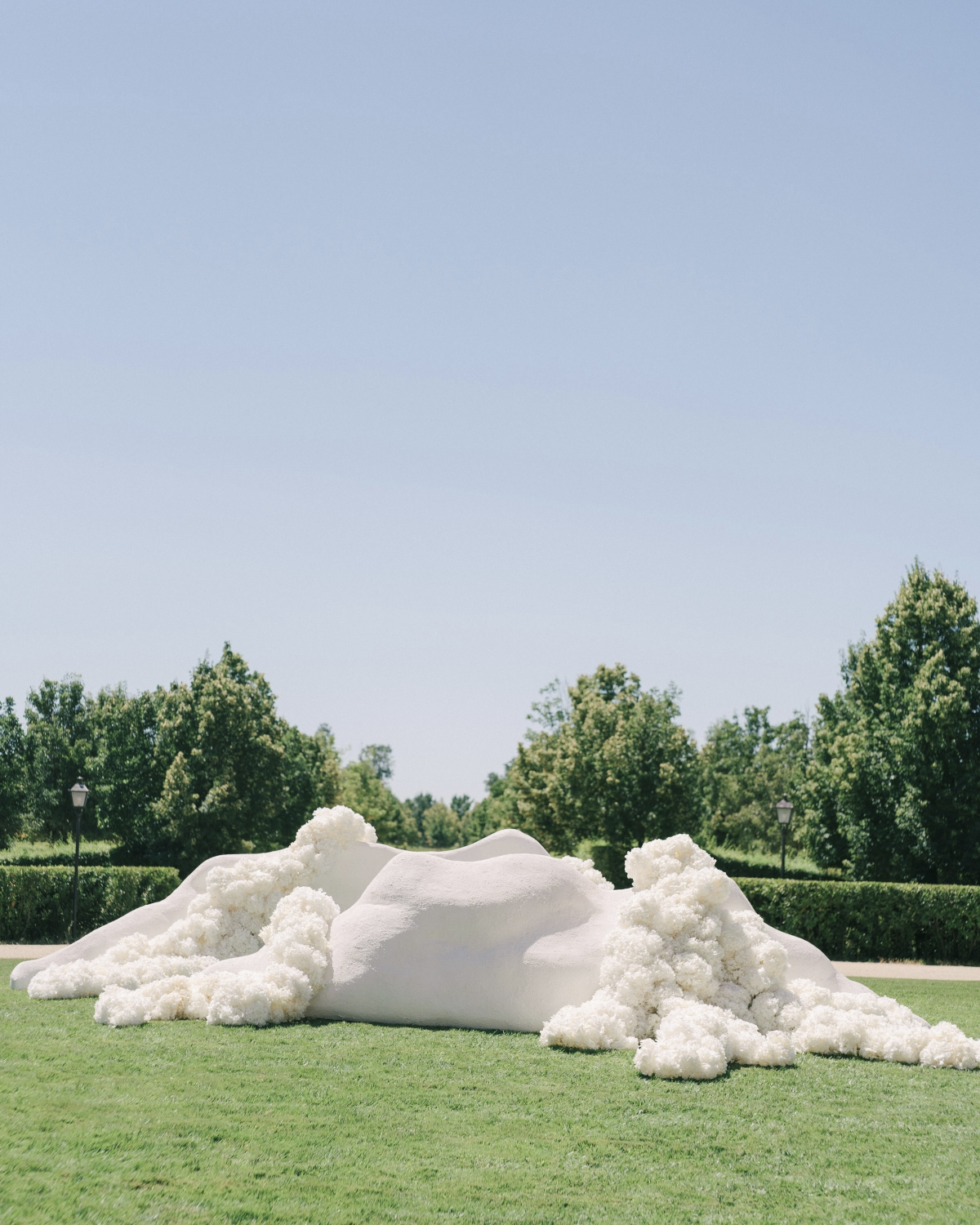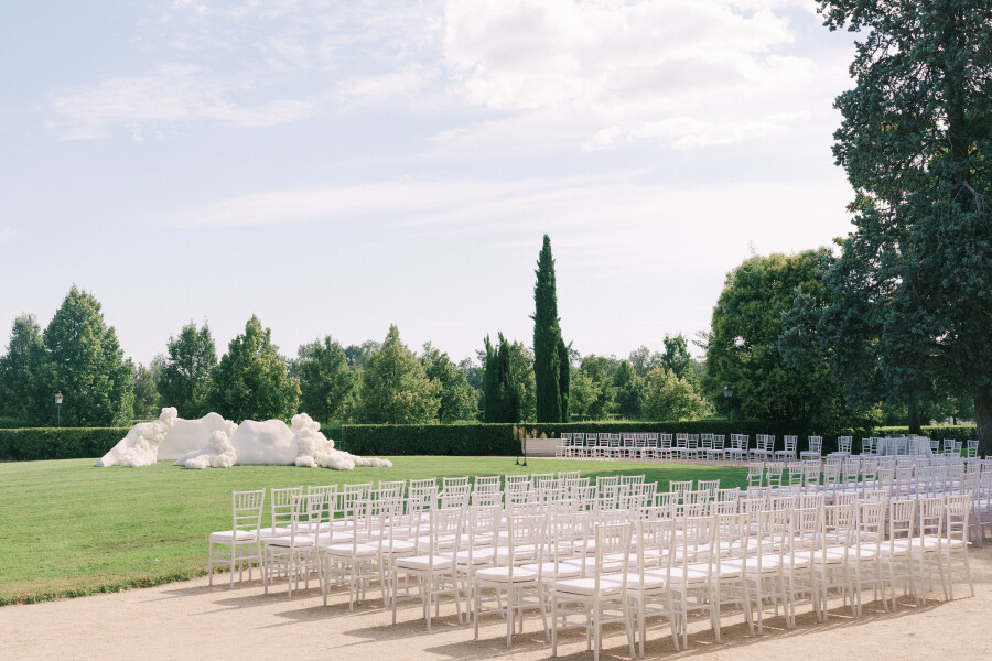We designed two wrap-around structures with curved shapes that acted as an altar, framing the couple in an elegant crescent design. Viewed from above, these structures replicated the layout of the tables, creating a perfect visual harmony throughout the space. Hydrangeas added life and a touch of romance to the composition, enhancing every detail. The guests were arranged in a wrap-around arrangement with sufficient distance between them, giving them a 360-degree perspective and creating a very theatrical atmosphere. Each structure had two strategically placed entrances, facilitating the movement of the officiant and the couple, and ensuring a smooth flow during the ceremony.