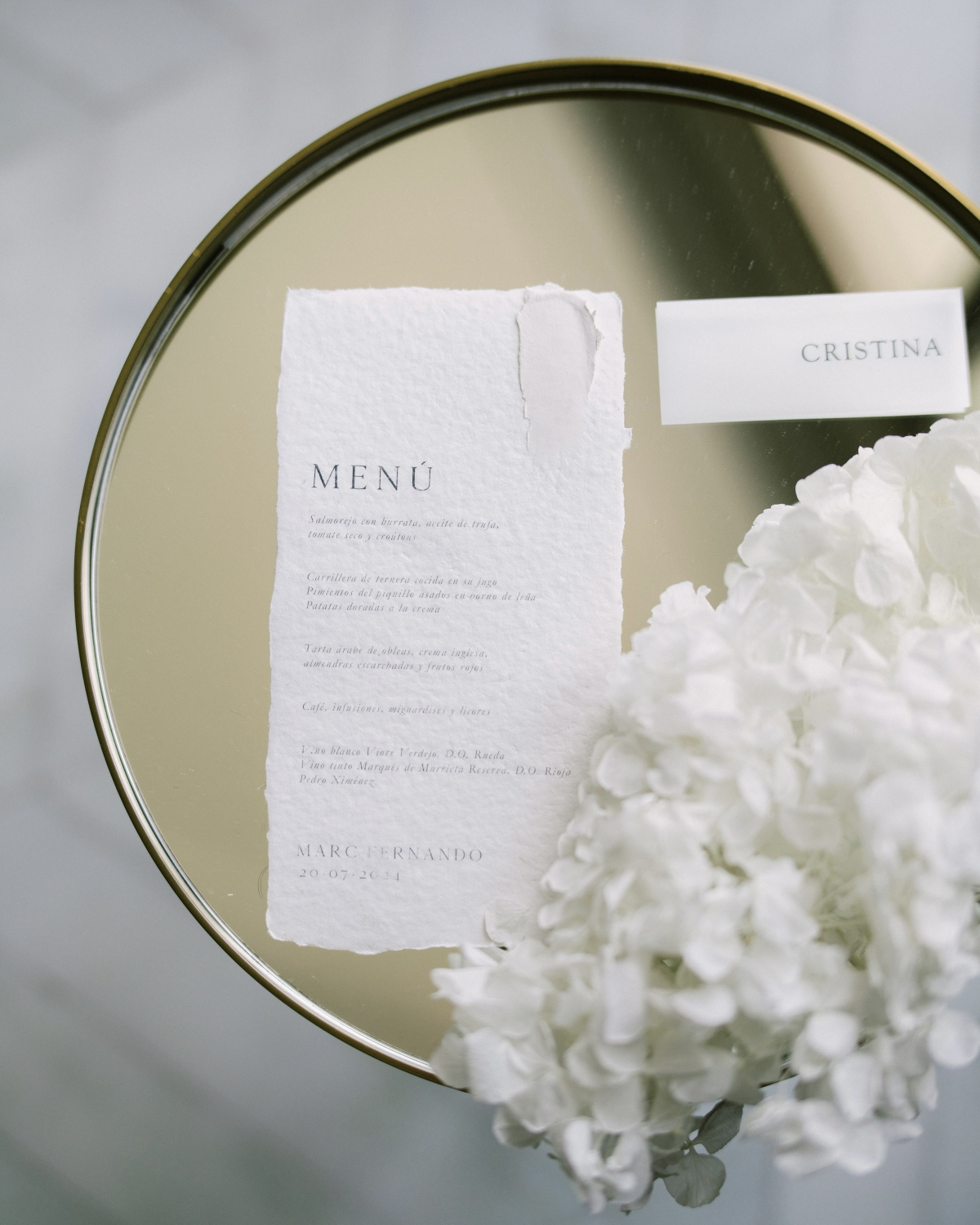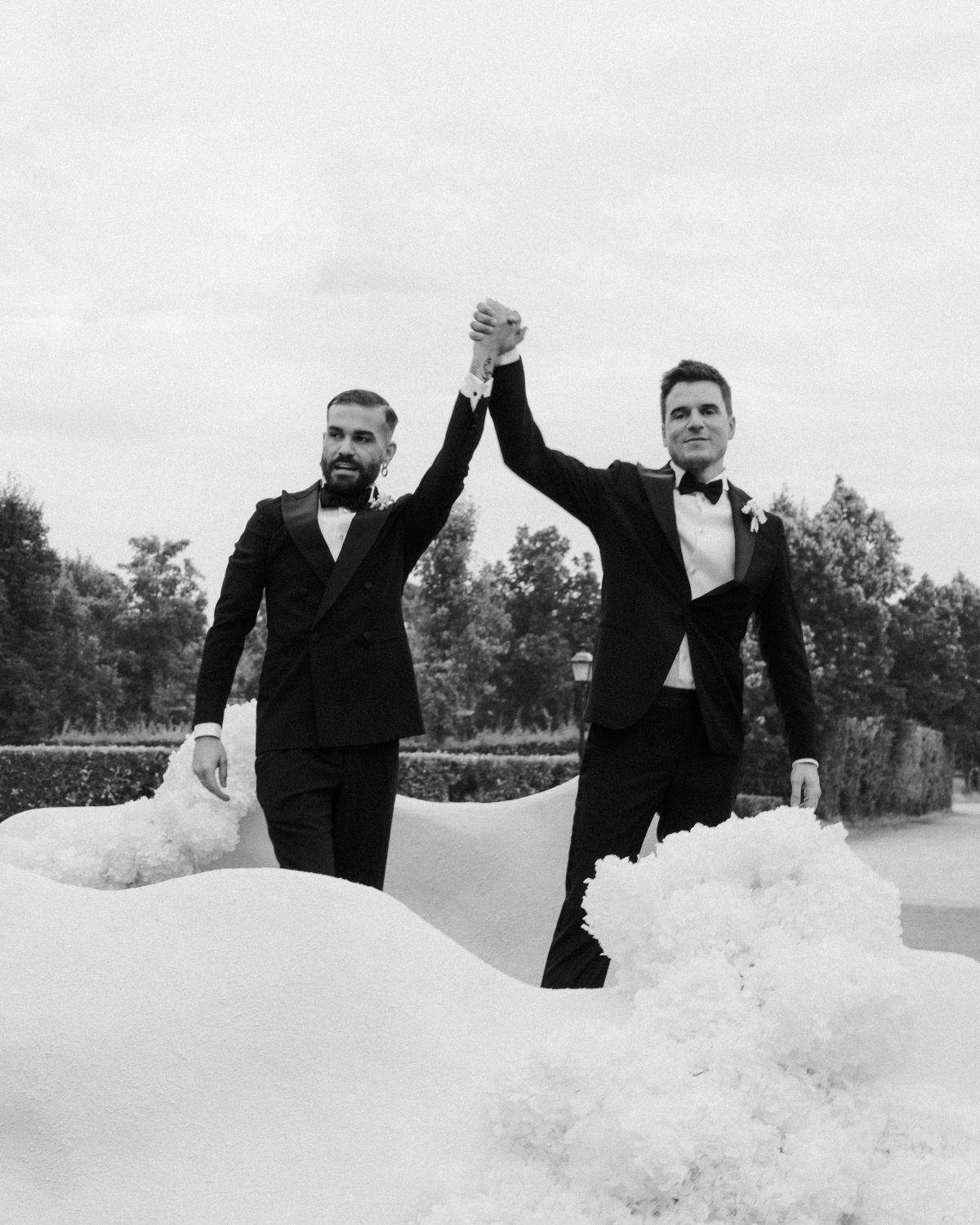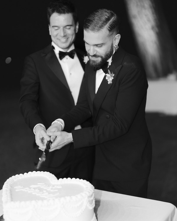 Marc and Fernando’s Madrid wedding was nothing short of a masterpiece – unique and surprising, yet brimming with elegance. From the moment guests stepped into the venue, they were greeted by an atmosphere that combined the sophistication of an art gallery with the warmth of a deeply personal celebration. Curves became the central motif, weaving through every element of the design, adding a sense of fluidity and effortless grace to the occasion. At the heart of the ceremony stood two breathtaking white structures, their soft, curving forms creating an ethereal altar. It was light and airy, with natural white blooms cascading delicately across the scene – a nod to nature's purity. Every detail was full of refined opulence, as gold accents delicately highlighted the space, elevating the decor to a level of understated luxury. Marc and Fernando in their matching Emporio Armani suits, exuded true chic elegance.