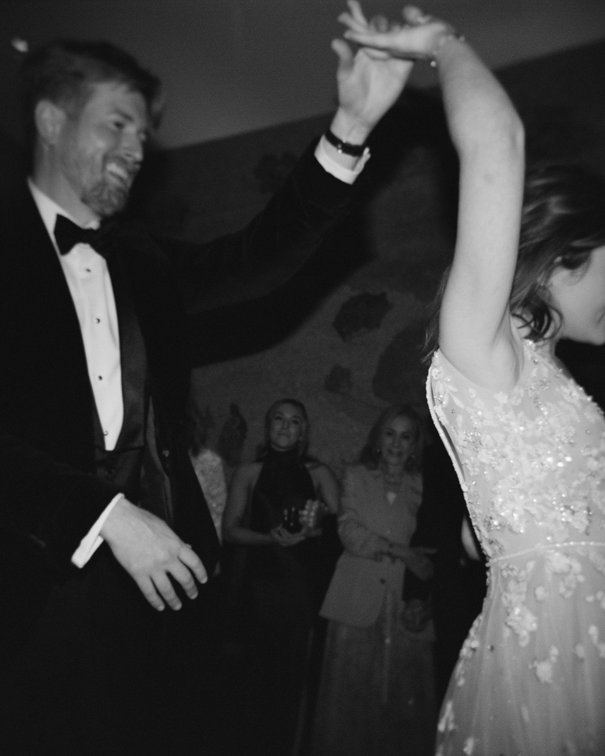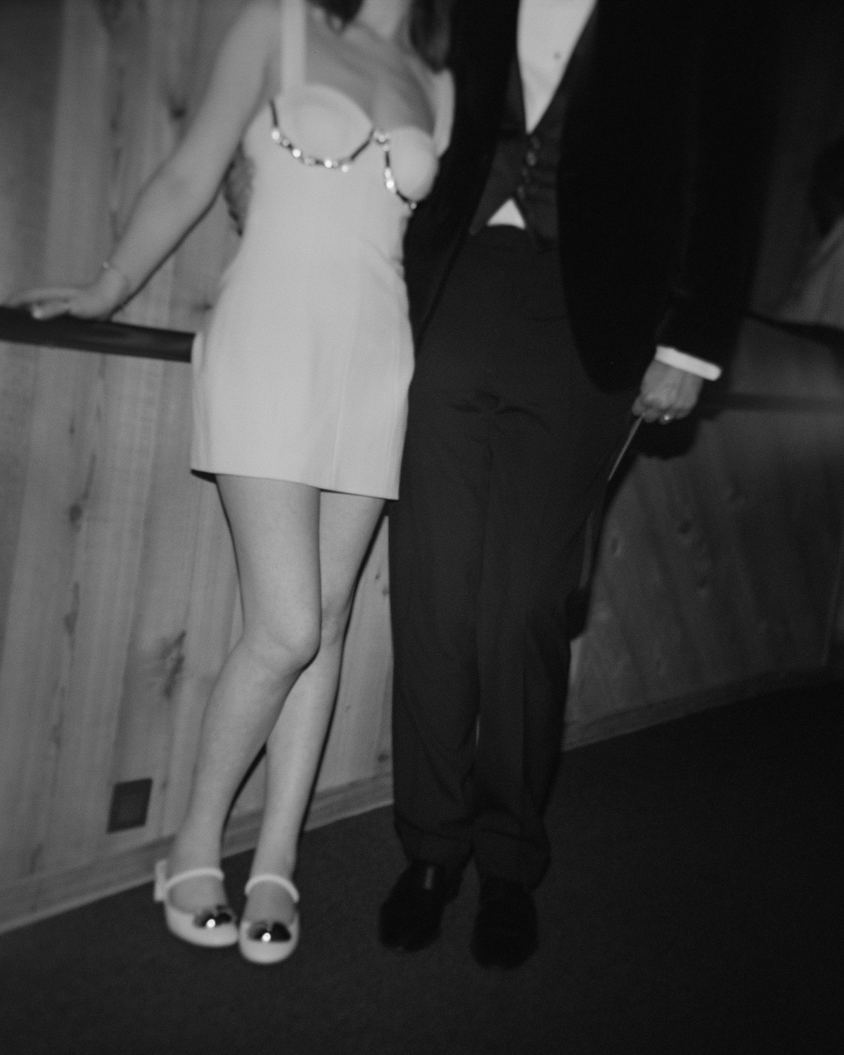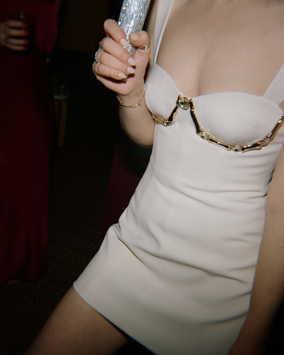 On the morning of the wedding, my mom gave me my grandmother’s anklet that my grandfather gifted her when they were teenagers. She also gave me her own wedding band to wear on my right hand. My grandparents were together for their entire lives, and my parents are coming up their 45th anniversary. Wearing such sentimental pieces was such an honor and blessing. I wanted something really different and fun for a party dress, especially since I decided not to bustle my wedding dress. I wanted something comfortable, with shoes that I could really run around in. I chose a dress from AREA that gave me Schiaparelli vibes, with fun kitten heals from Gianvito Rossi.