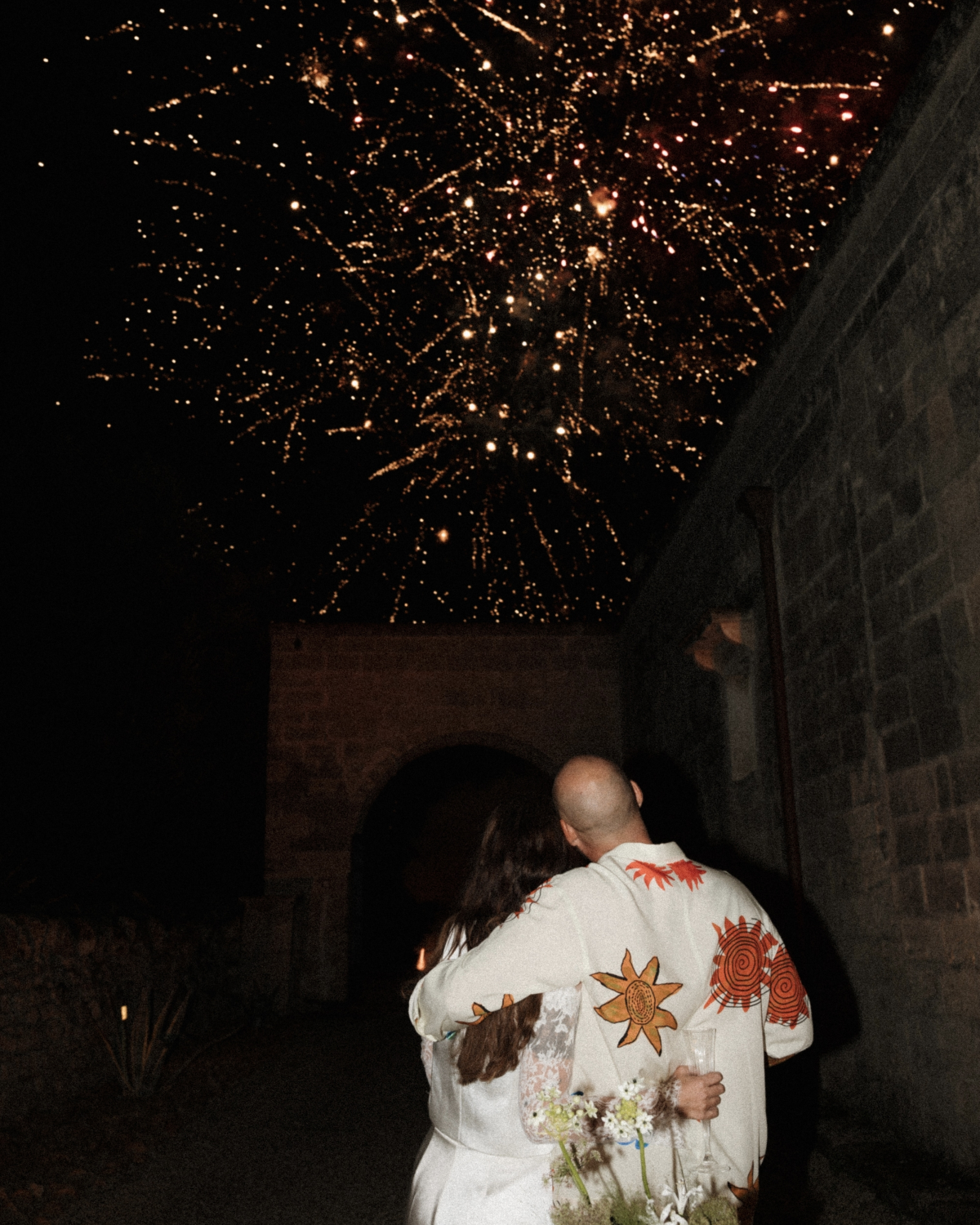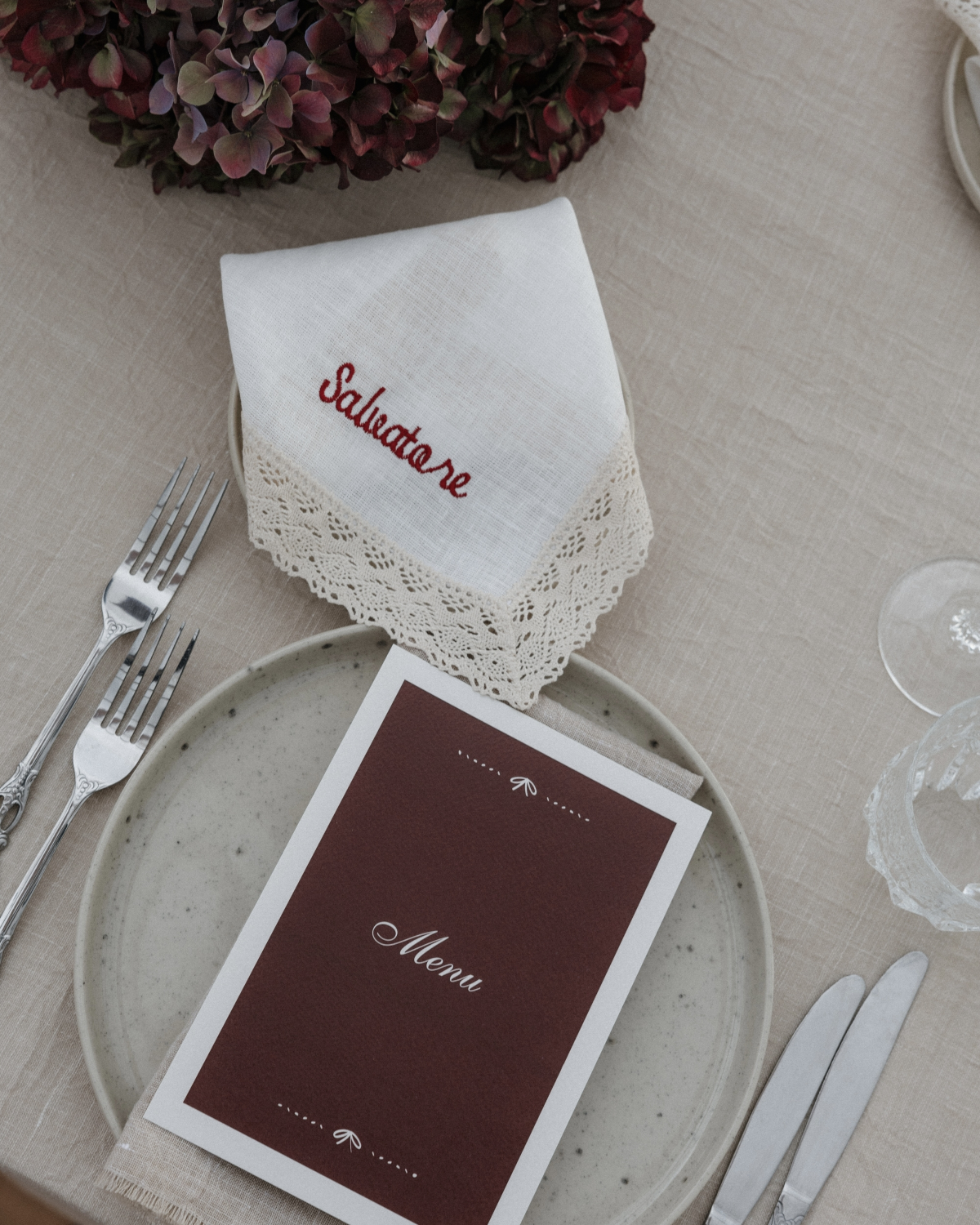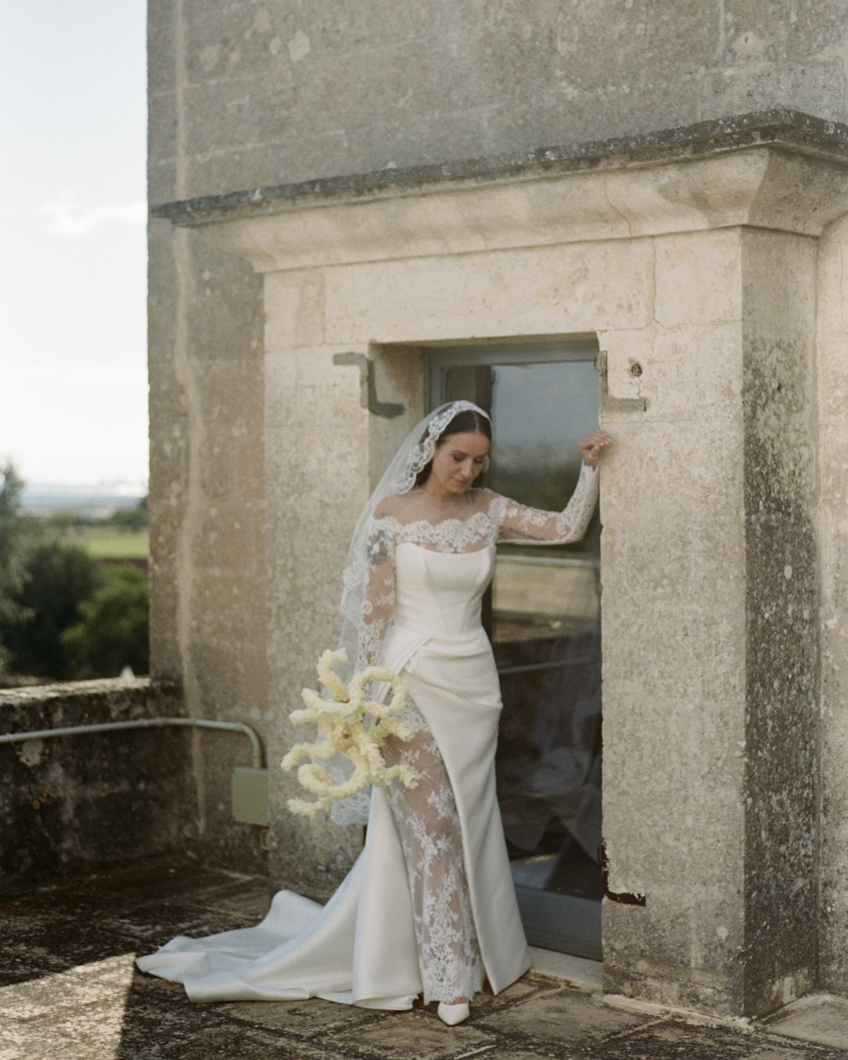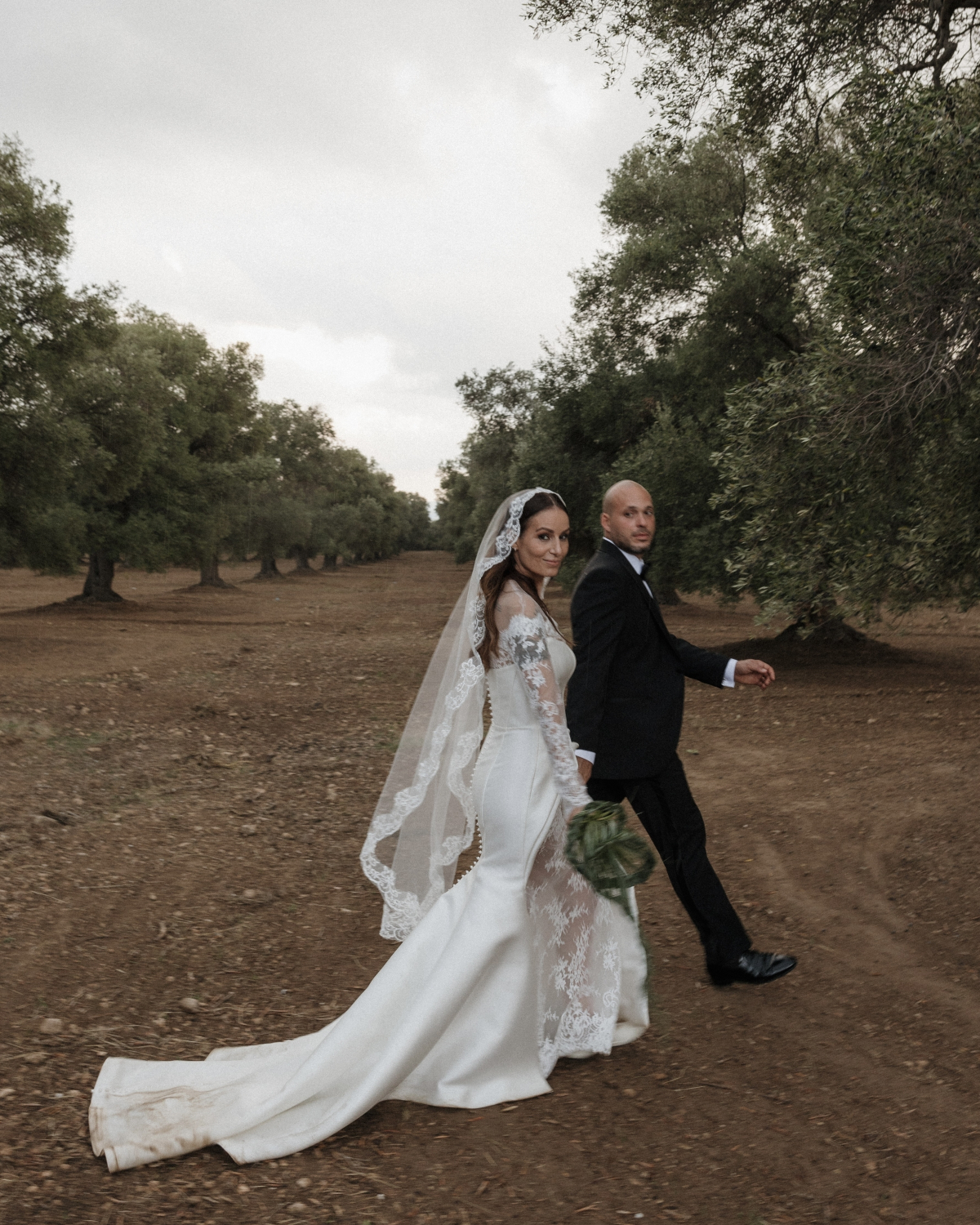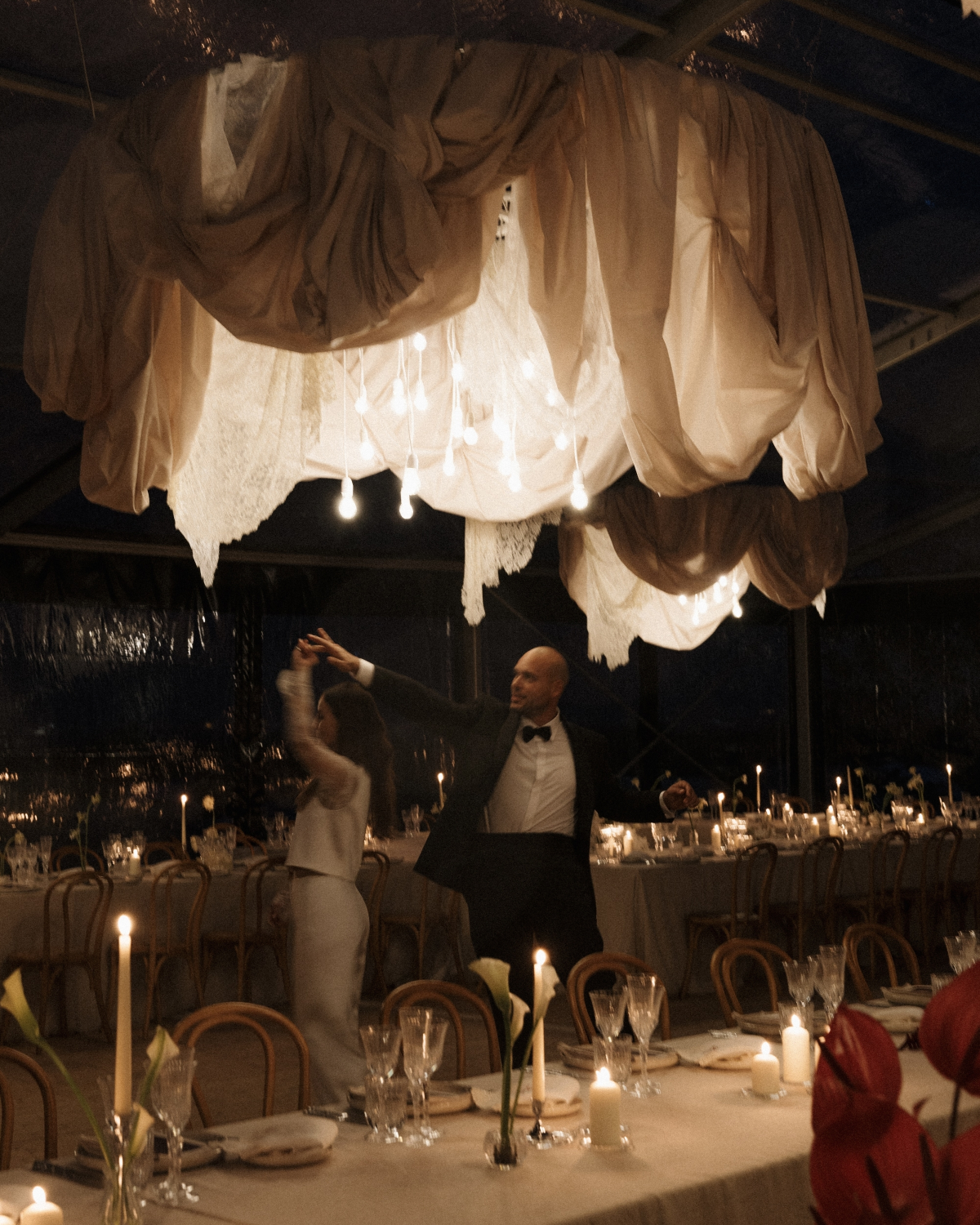 The atmosphere balanced bold creativity with warmth, amplified by bespoke lace chandeliers crafted by Dario. Rotondo Catering by Alba, our member and the wedding’s planner and caterer, orchestrated the celebration with precision and heart, seamlessly guiding guests from olive grove ceremony to joyful, food-filled moments. Sara’s bridal look echoed the setting – lace-forward, architectural, and effortlessly expressive – perfectly complemented by hair and makeup by THE WED member Tom Perdigão. The result was a wedding that felt deeply personal, visually striking, and alive with energy, where design and feeling moved together in perfect rhythm.