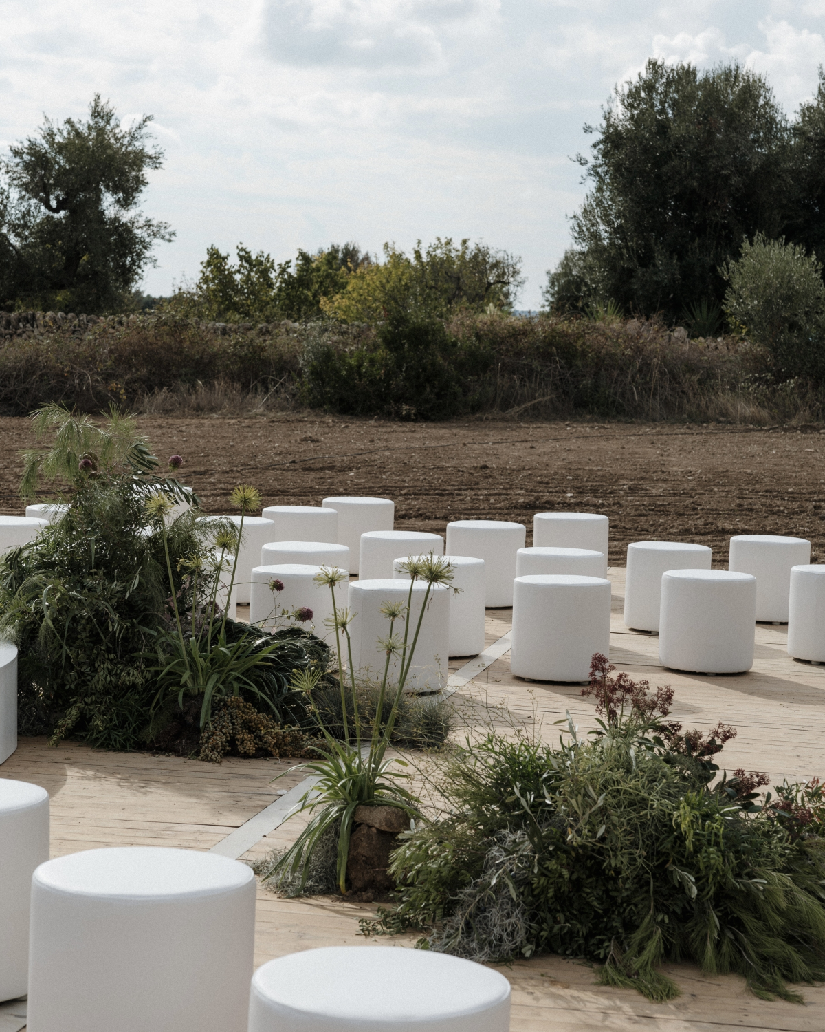 In the heart of Puglia, where ancient olive groves stretch endlessly and light filters through silvery leaves, Sara and Dario’s wedding felt less like a single day and more like a fully immersive design experience. The couple transformed the space with a vision rooted in intention, craft, and emotion. Sara – wedding florist and founder of Babel Bloom, one of our members – approached the event as a living installation: sculptural table layouts inspired by playful geometry, lush floral compositions rising organically from negative space, and oversized lace-draped structures.