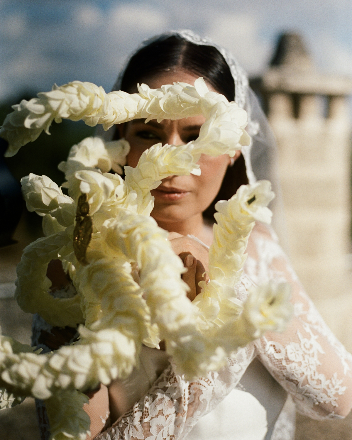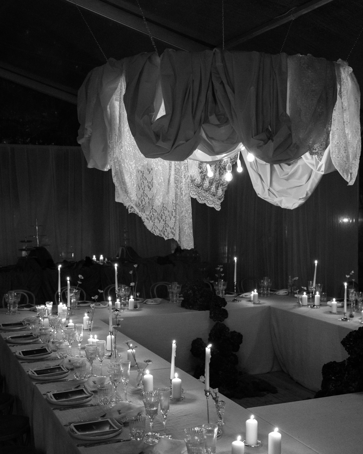 Sara’s floral arrangements were designed like bushes that seemed to sprout from the shapes—colorful, site-specific installations that harmonized with, yet contrasted against, the large chandeliers, also entirely crafted by the groom. Large, billowing hanging fabrics and beloved lace—another common thread between Portugal and Italy—were mounted on large wrought iron hoops.