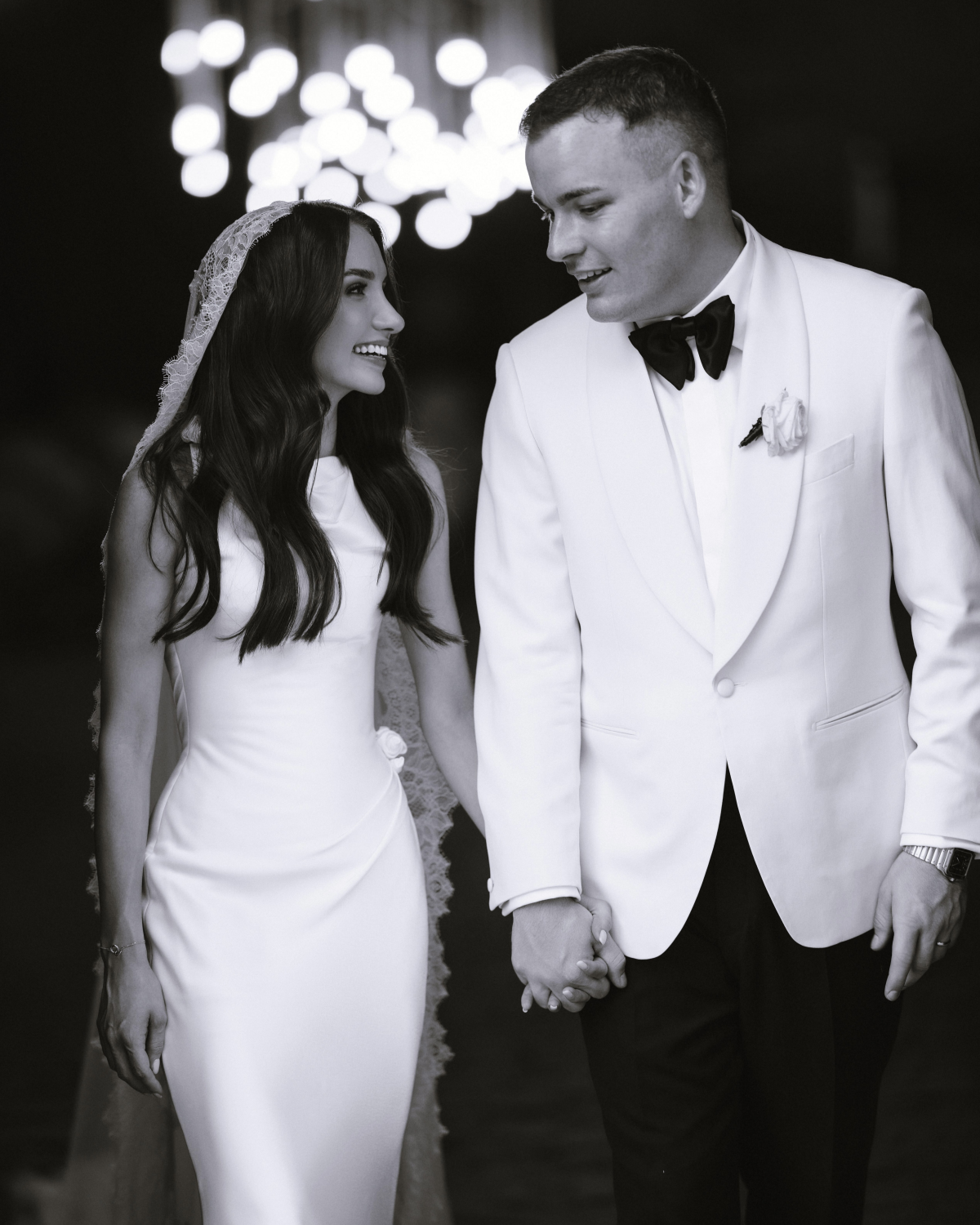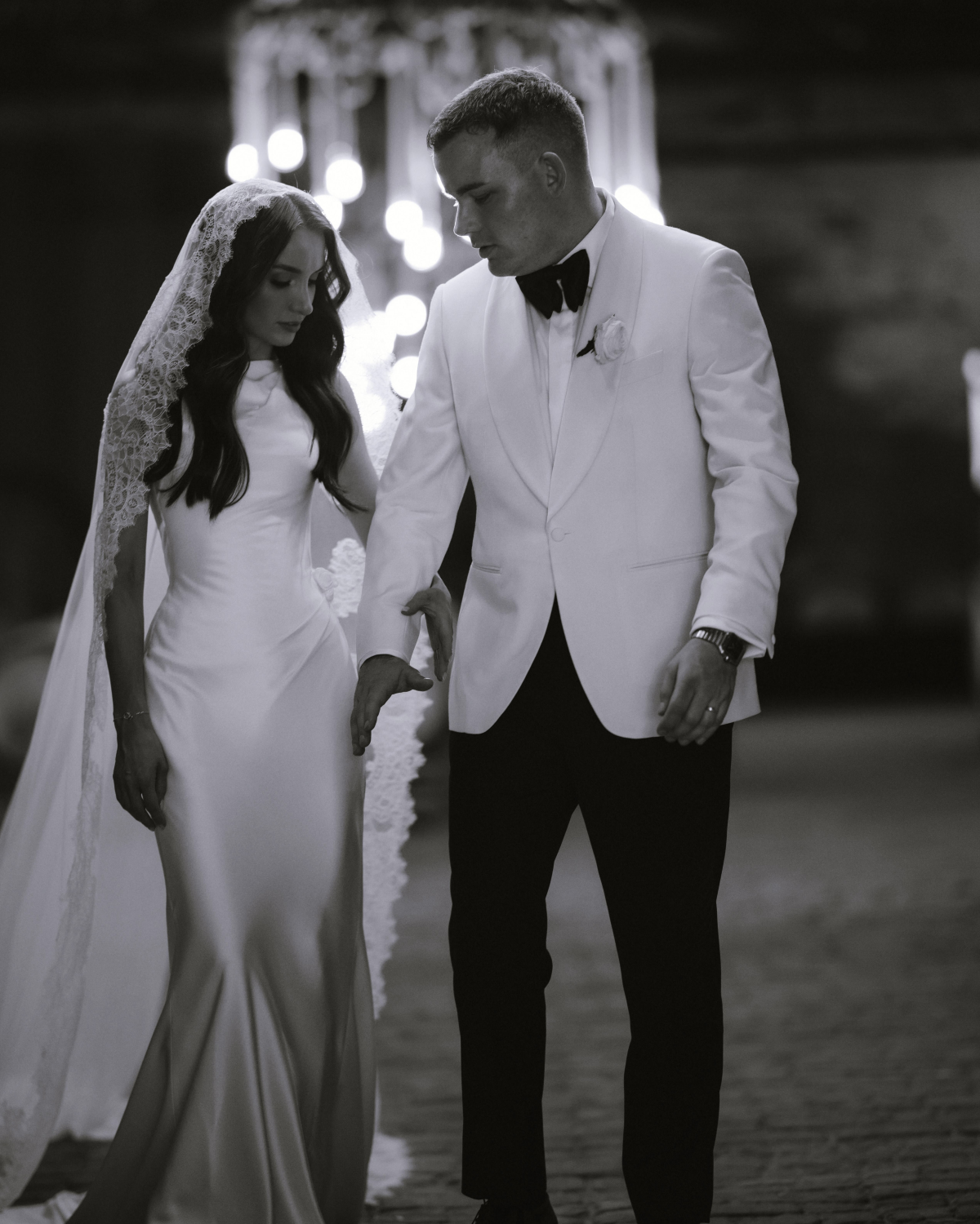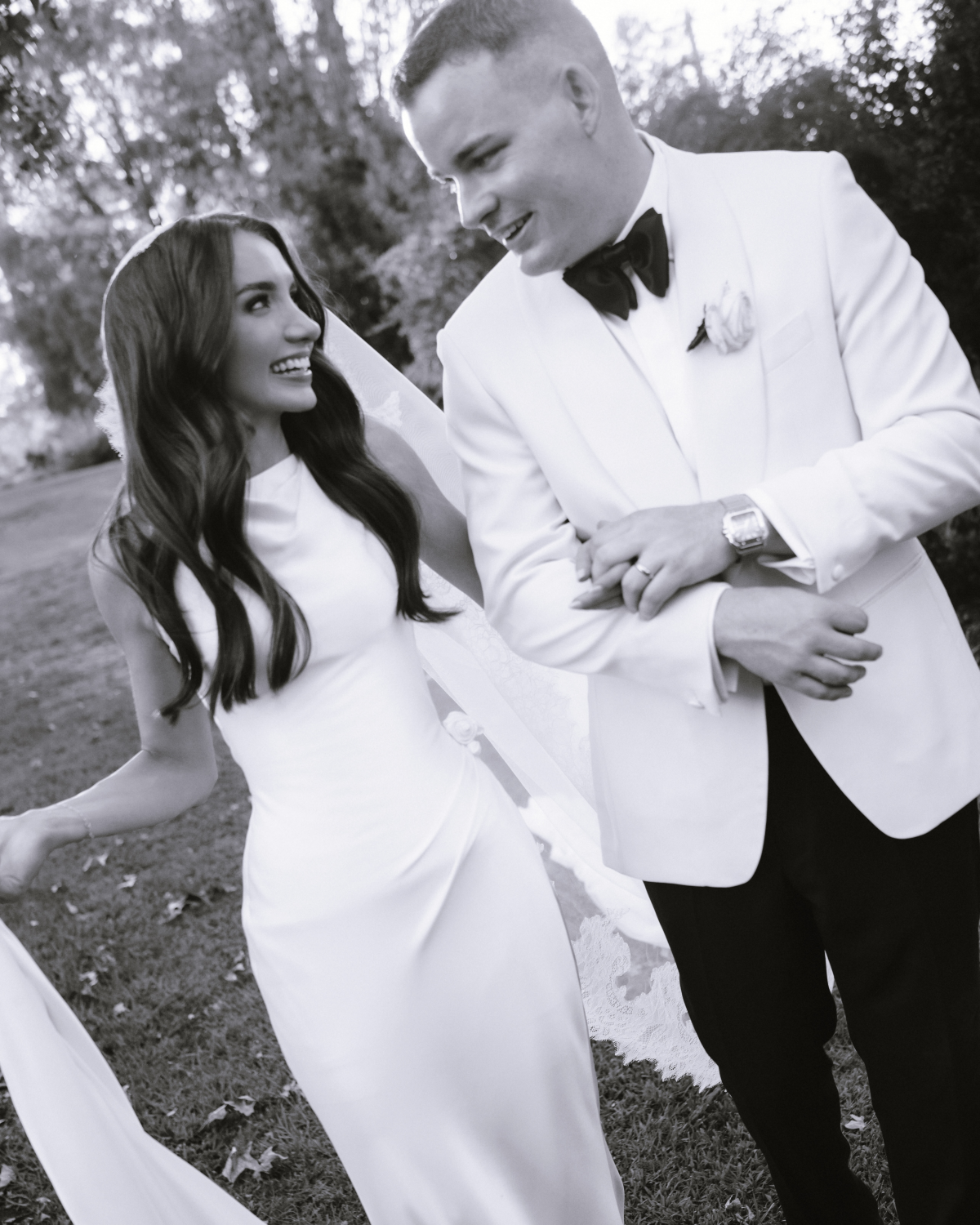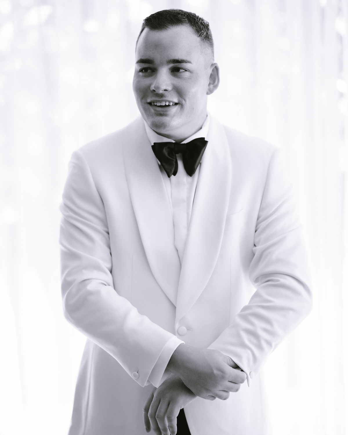 Lachie wore a cream tuxedo jacket paired with black tuxedo trousers, both meticulously tailored by Oscar Hunt Tailors. Adding a personal touch, he secretly stitched my initials inside the left breast pocket, a detail I didn’t discover until after the ceremony. He completed the look with patent black Hugo Boss shoes, a sleek black Tom Ford bow tie, and pearl cufflinks that subtly mirrored my earrings.