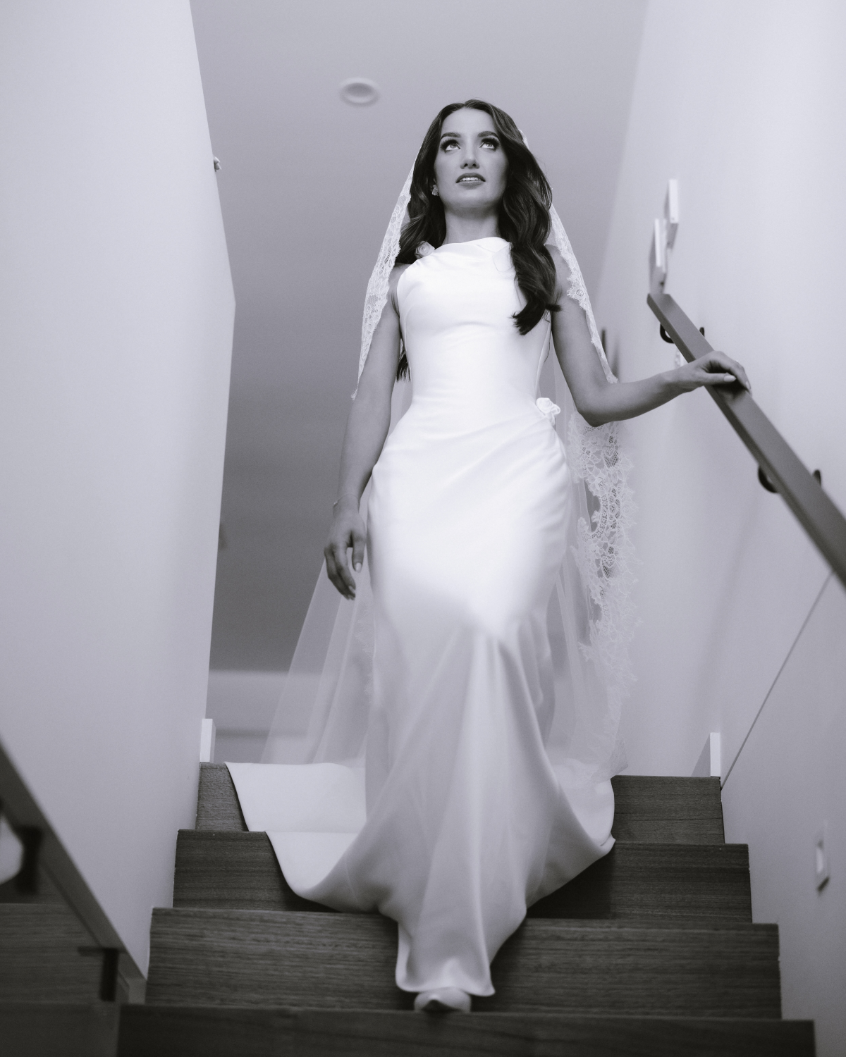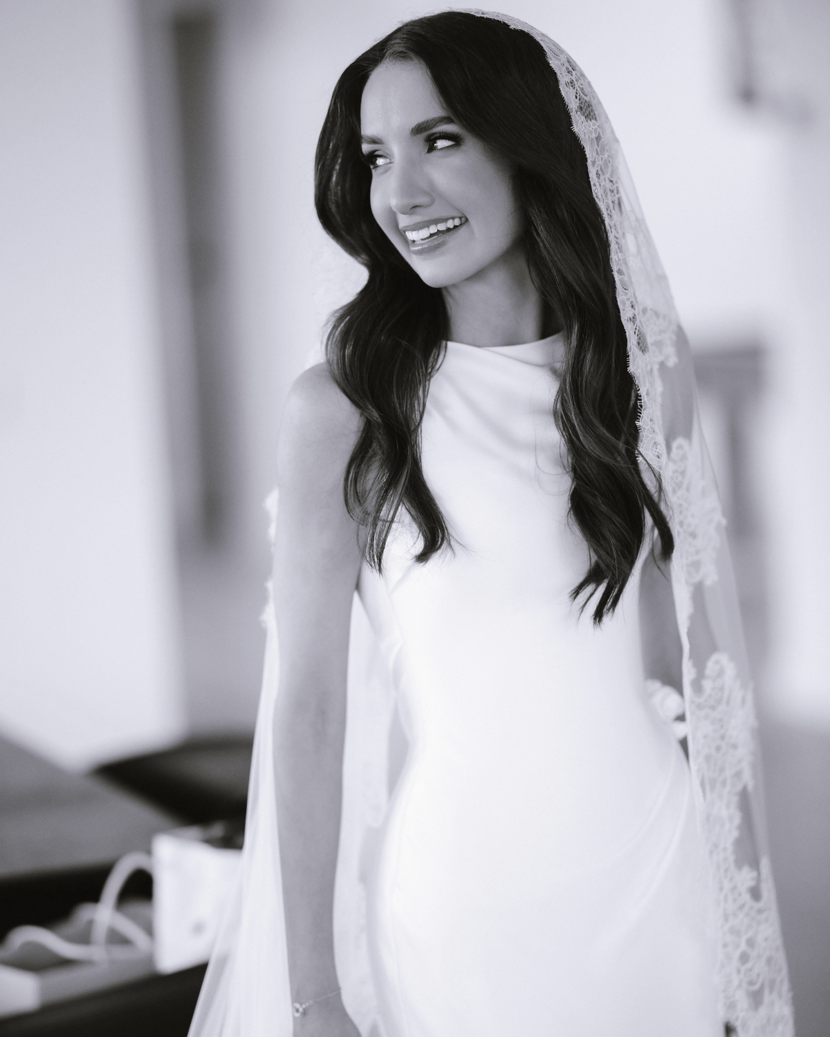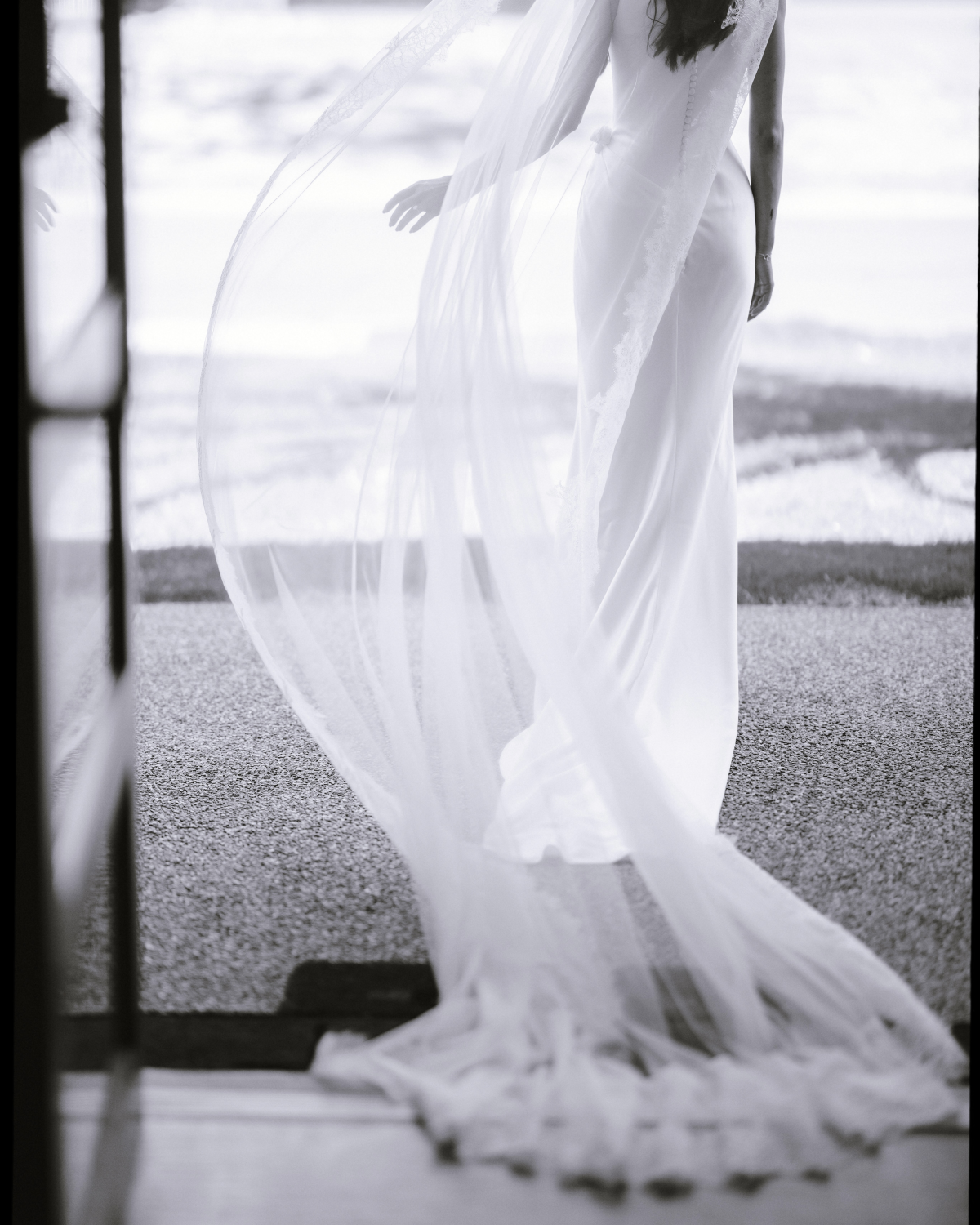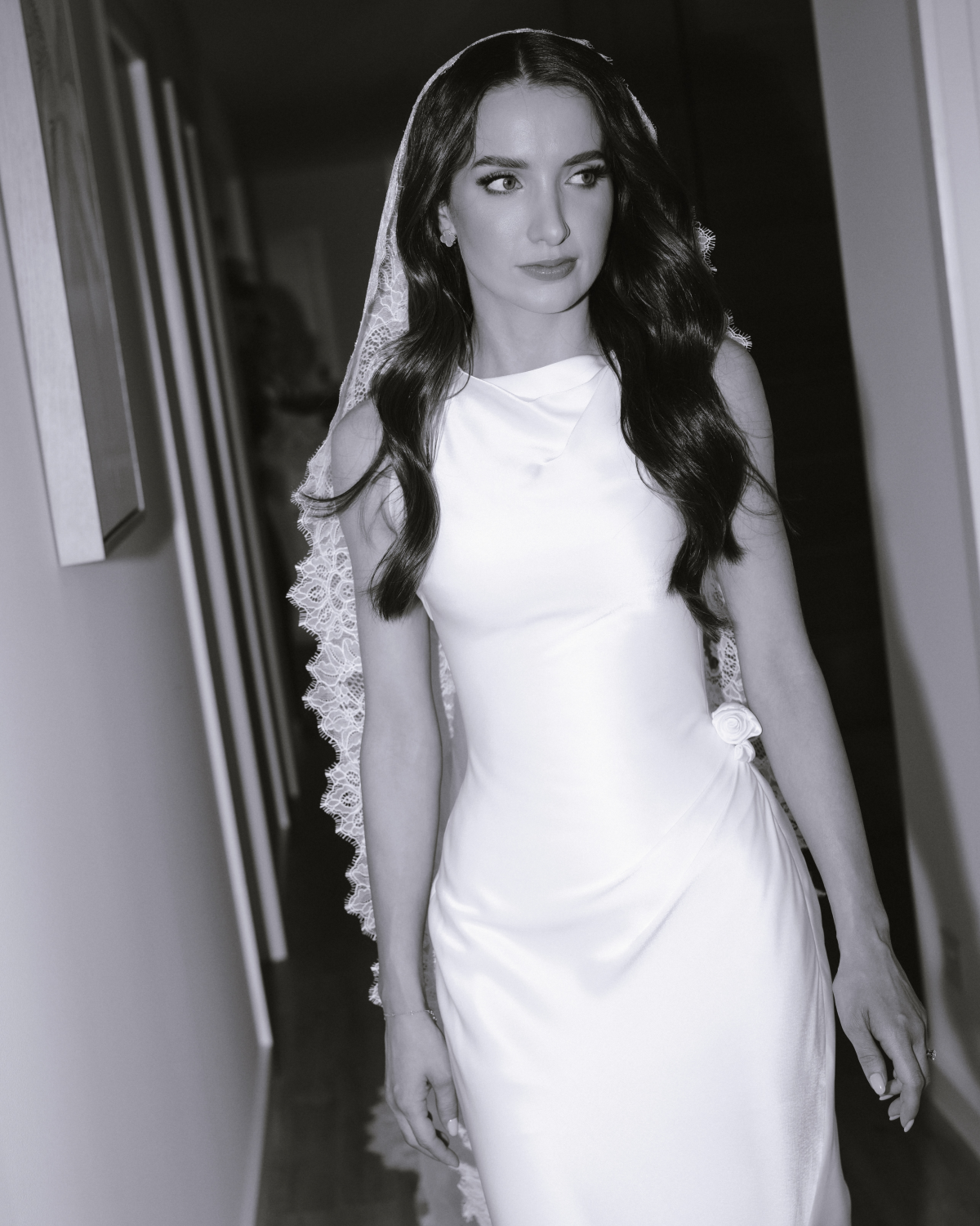 For my wedding dress, I wanted something timeless yet modern – structured but comfortable for the Australian heat. I worked with Elly Sofocli to create an asymmetrical boat-neck gown with extended corsetry and soft, hand-draped folds. The final touch was the addition of rosette details at the last fitting. My wedding date was embroidered on my veil in light blue thread, making it a deeply personal part of my ceremony look.