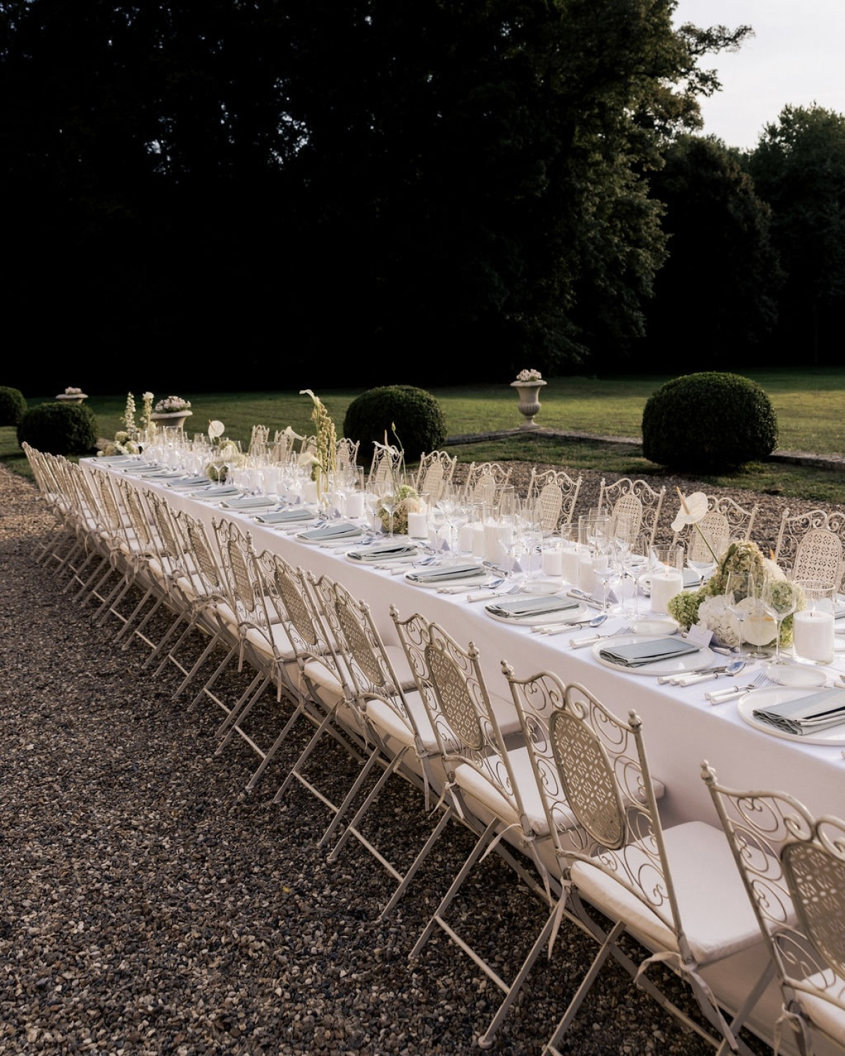 Authenticity was really important to us and factored into each decision we made while planning the wedding weekend. Keeping our personal style in mind, we wanted the wedding to feel elegant, timeless, and in harmony with the venues. The setting of Château du Champlâtreux truly wows you in every aspect, so we let it speak for itself and opted for lighter floral accents, candles, and touches of romantic drapery to complement the space.