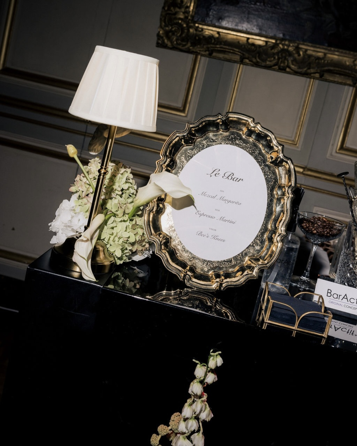 We envisioned the evening as an elevated, cocktail-style dinner with our close friends. The hotel’s existing design features deep red velvet lounges, gold detailing, and a moody bar, so we played into that atmosphere with rich red florals and custom window vinyl. Dinner took place in the glass-walled terrarium and out in the garden, where even the resident chickens added a whimsical and romantic touch. As cocktails began, a pianist joined us and turned the bar into a lively lounge for the rest of the evening. It was the perfect way to kick off our wedding weekend!