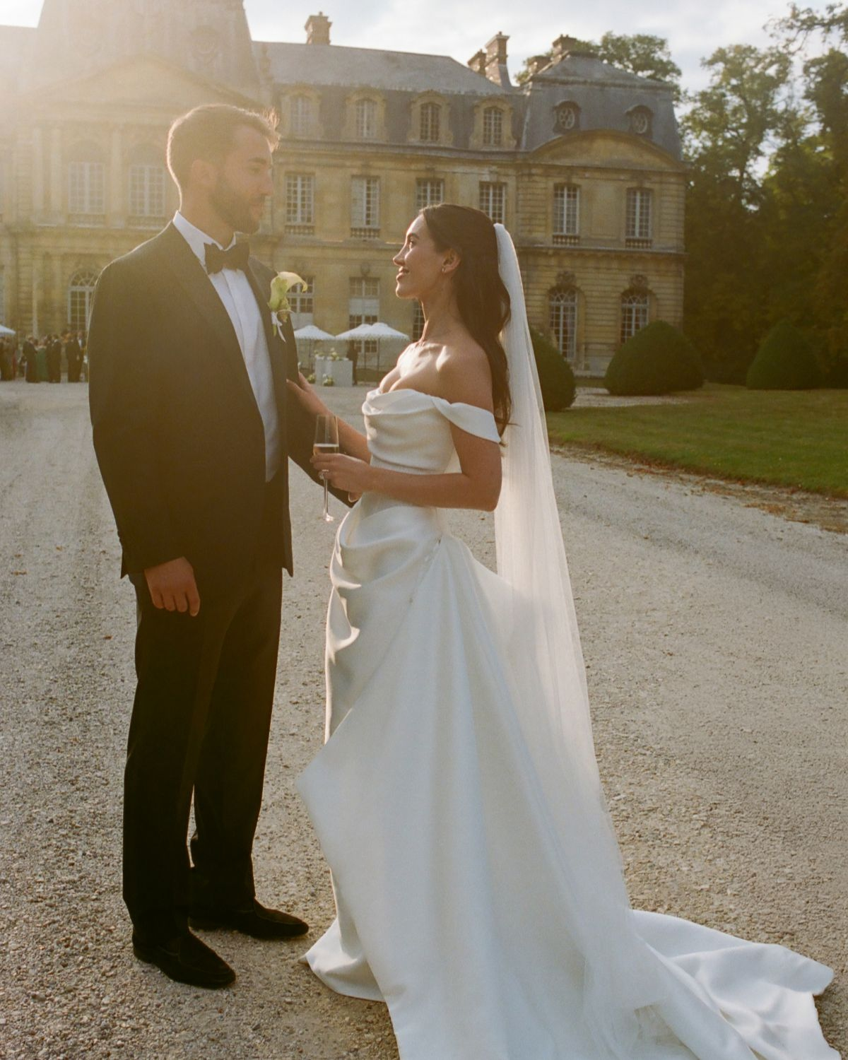 The reception was everything we had envisioned—friends and family seated for an alfresco-style dinner in the gardens, served with incredible French food. While it had been cloudy for most of the day, the sun miraculously appeared at that moment to deliver a magical sunset as we dined. As dinner drew to a close, we brought out espresso martini shots to toast with our cake: one sheet-pan tiramisu with “Just Married” dusted in French on top!