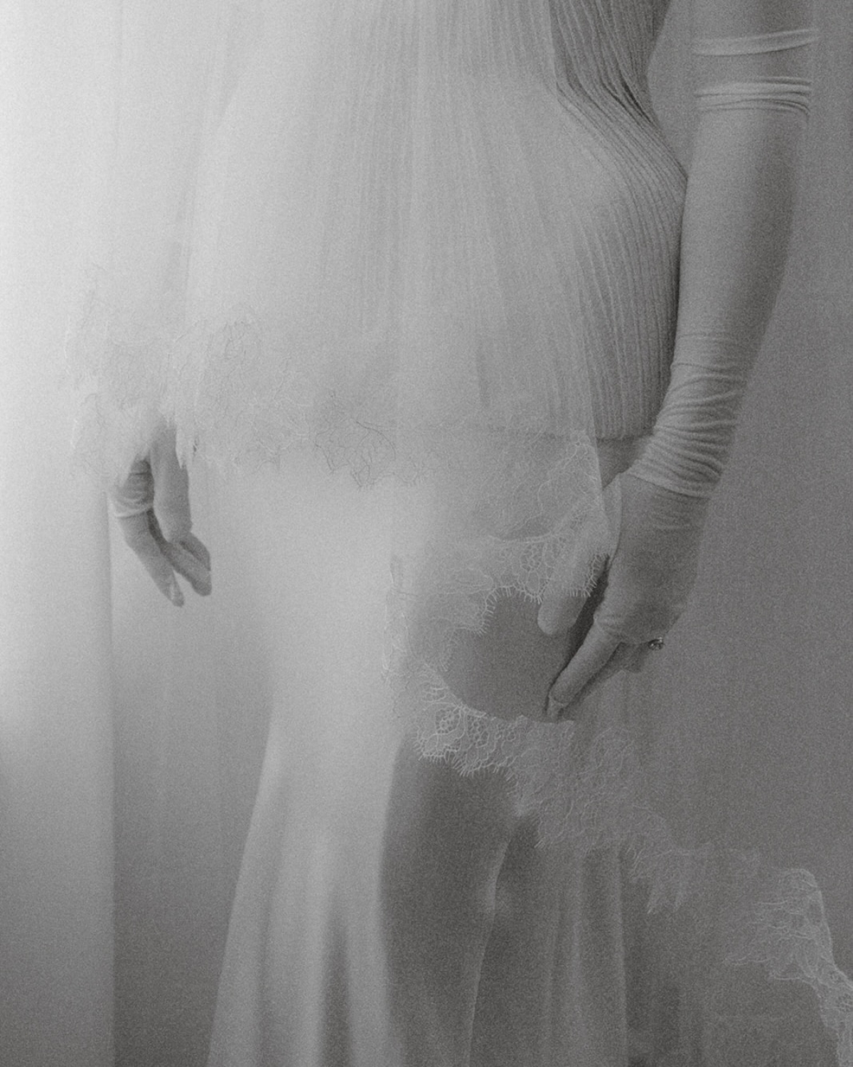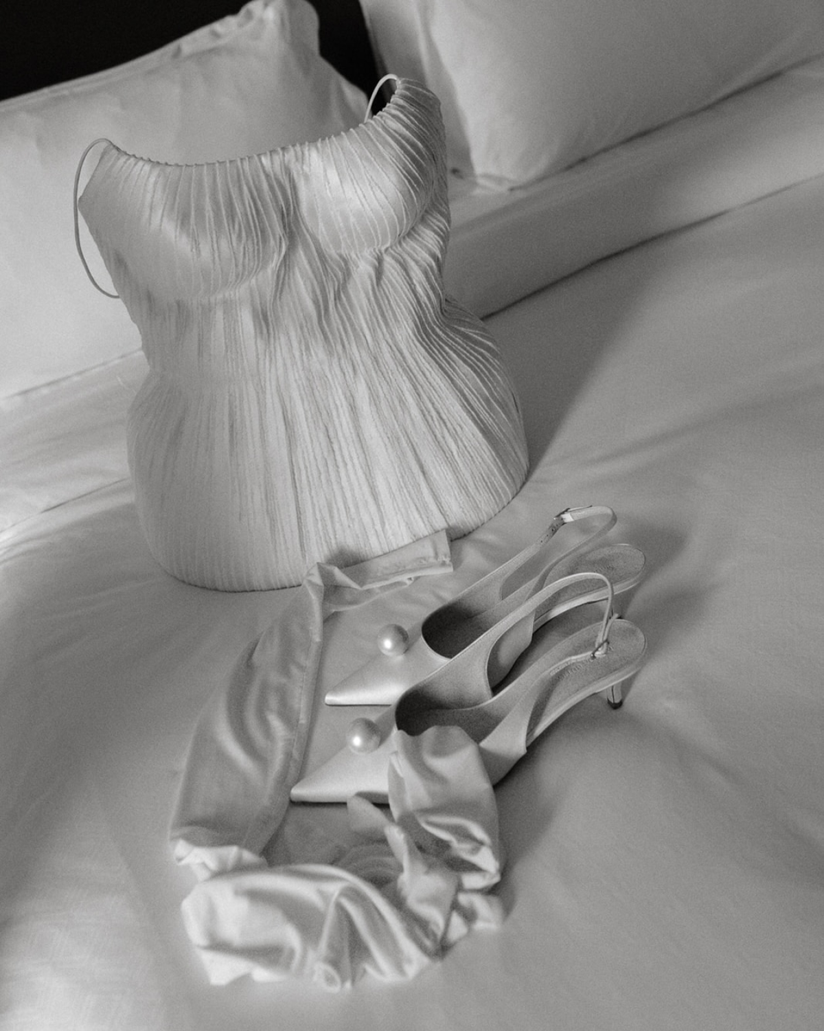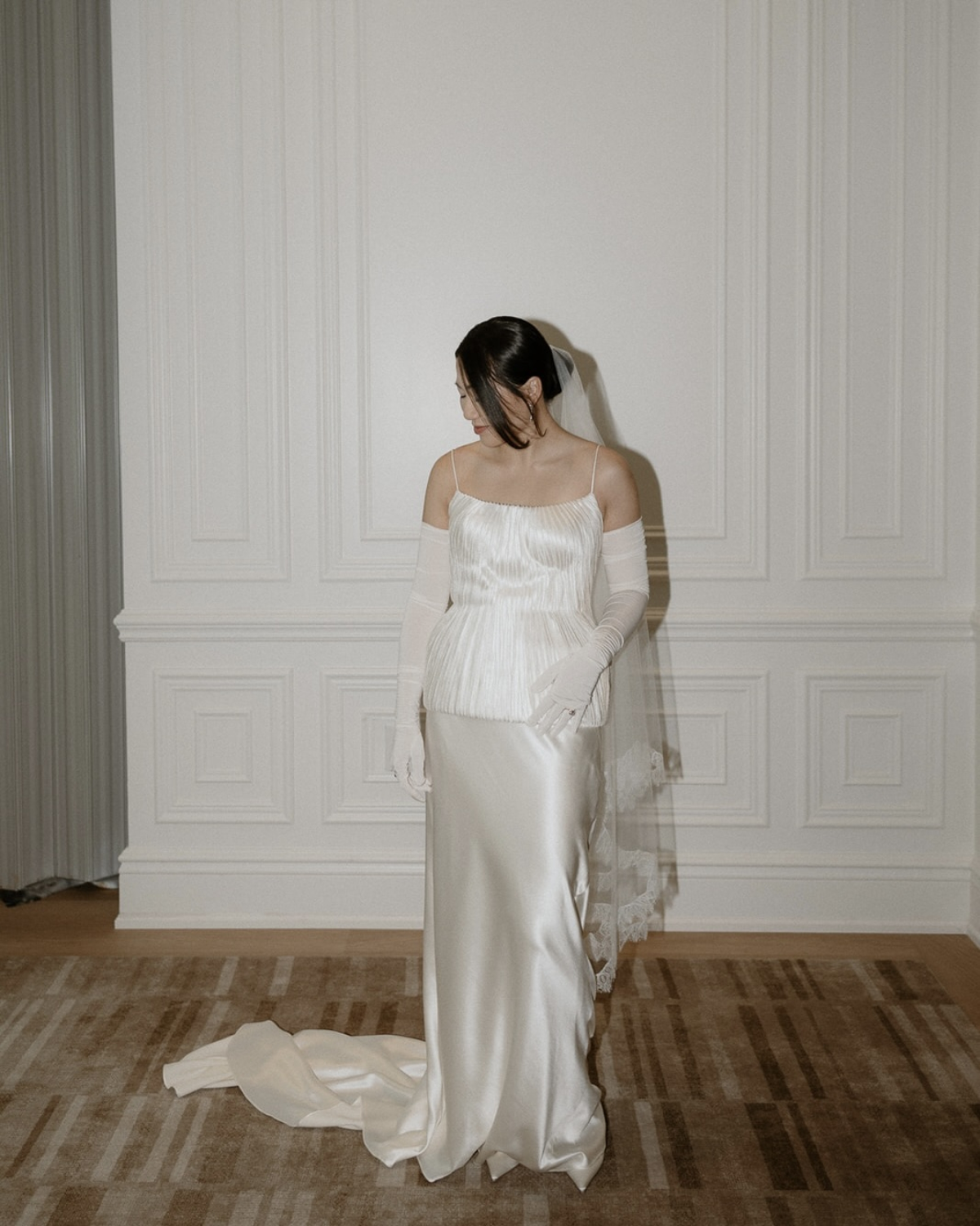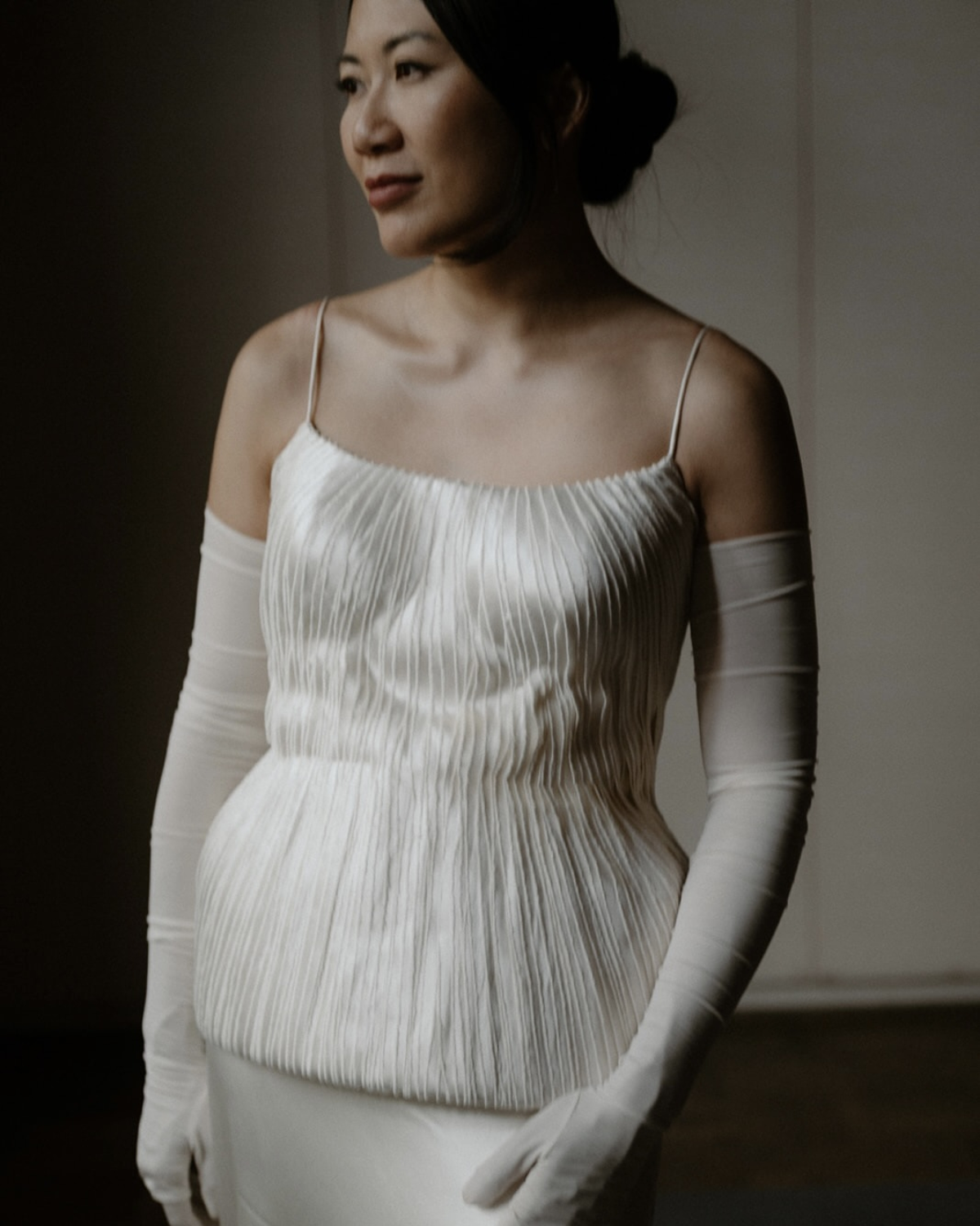 My ceremony look was inspired by the off-white tones and Gothic elements of the church, which had a striking yet clean feel. I chose a structured bustier and skirt by Danielle Frankel, made of hand-frayed silk wool with a beautiful pearl sheen, and paired it with opera-length gloves for a hint of vintage drama. I built the overall look around the bustier, where the lampshade shape felt whimsical and fresh. I loved my dress so much that I wanted to wear it throughout the entire wedding day, so I focused on changing its feel through accessories.