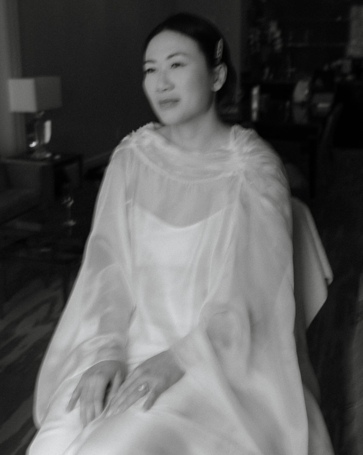 I added a silk tulle shawl pinned with a vintage gold brooch. The soft draping around my shoulders and the long train made me feel like the queen of the evening. For jewelry, I kept it simple. I wore graduated diamond drop earrings, and my mom gifted me my favorite piece from her collection—a sugar-loaf–cut sapphire ring with diamonds that she custom-designed when she was my age. These pieces are now family heirlooms that I hope to pass on one day.