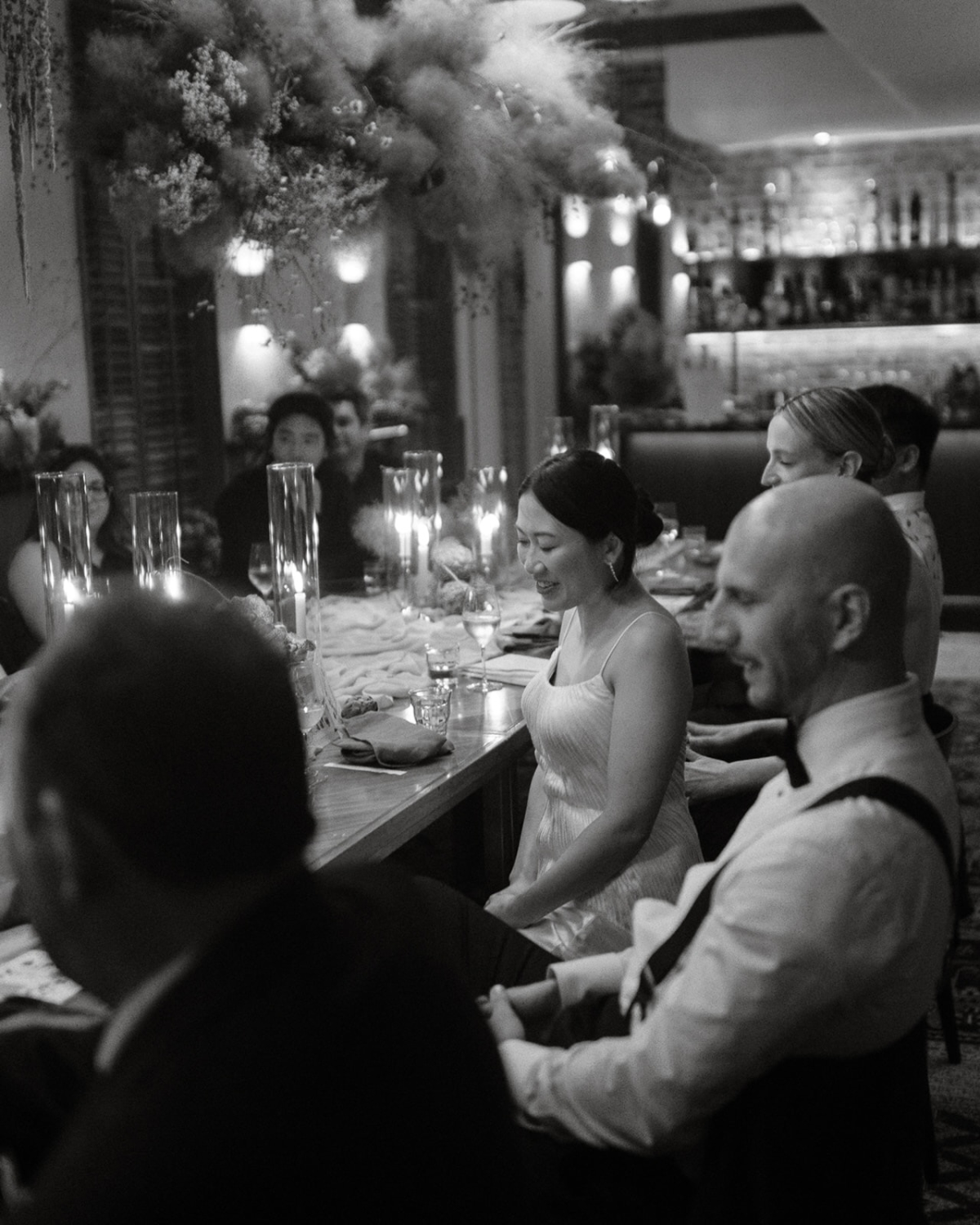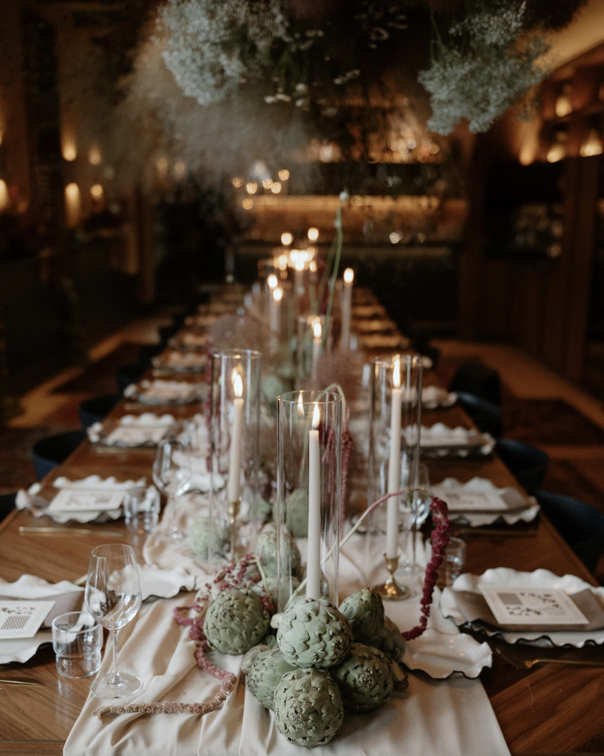 Adeline and Peja’s ceremony unfolded beneath white stone vaults, where Gothic architecture and Old World elegance subtly reflected the couple’s roots. Guests then transitioned into a moody, candlelit reception, held in a richly layered space of dark wood, oriental rugs, and low lighting that naturally encouraged intimacy and conversation. Rather than leaning on tradition, the design focused on texture and tone: sculptural floral arrangements in rusty, muted hues, unexpected details like artichokes lining the church steps, and a cloud-like installation hovering above the dinner table. Adeline’s bridal look echoed the atmosphere perfectly – an architectural Danielle Frankel bustier paired with a silk skirt, styled with opera-length gloves and heirloom jewelry. With just eighteen guests gathered around an eleven-course family-style dinner, the day felt immersive, thoughtful, and effortlessly refined. Captured by THE WED member Jennifer Moher, every moment reflects a wedding designed not to impress, but to be felt.