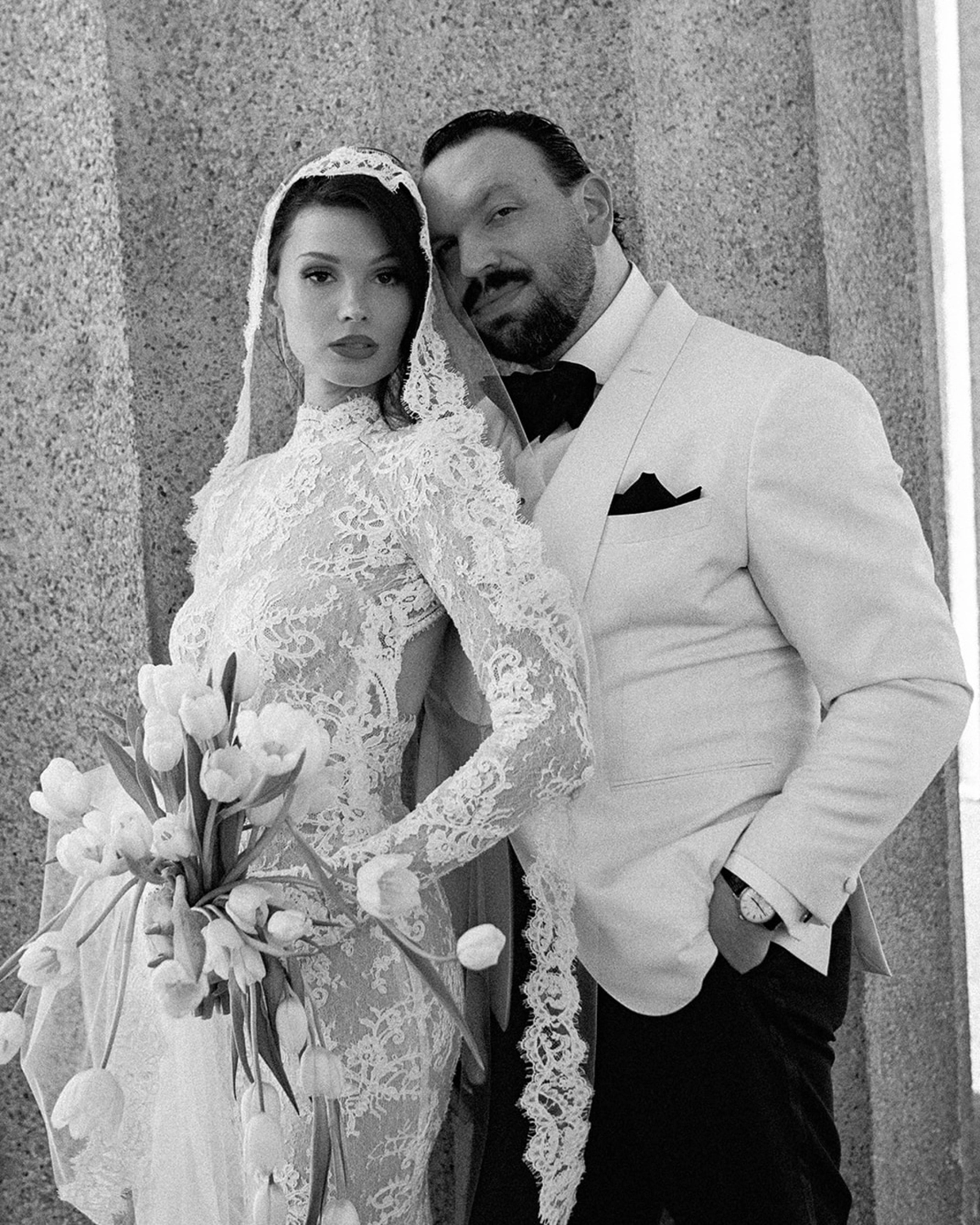 Spending years modeling in the bridal world gave me a deep appreciation for how silhouette, shape, and texture can create feeling and mood. I really wanted to capture the timelessness and reverence I felt when pulling inspiration from old family photographs. I knew my dress by Dana Harel would be the one before even trying it on. Jill Andrews, who also created the most magnificent mantilla veil that cascaded like water, molded the dress to my body as if she was a sculptor.