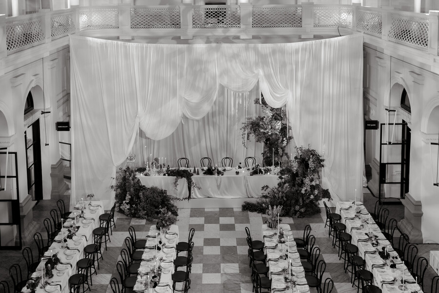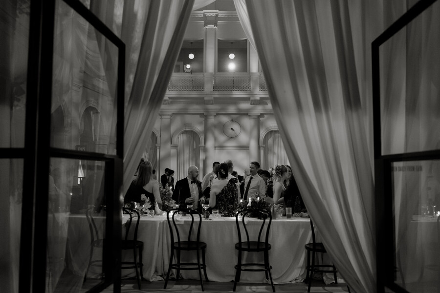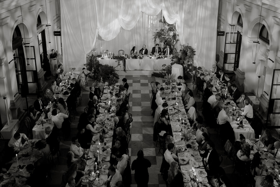 Our reception was held at Como The Treasury, and it couldn’t have been a better choice. Located just meters from St. George’s Cathedral, it remains one of my favorite buildings in Perth. The main hall provided the perfect backdrop—soaring ceilings with glass panels showcasing the night sky, a beautiful mezzanine on the second floor, warm ambient lighting, and white stone and marble details—all seamlessly aligning with the elegance of our ceremony. Walking into the reception and seeing Charlotte take it all in for the first time is a memory I will cherish forever.