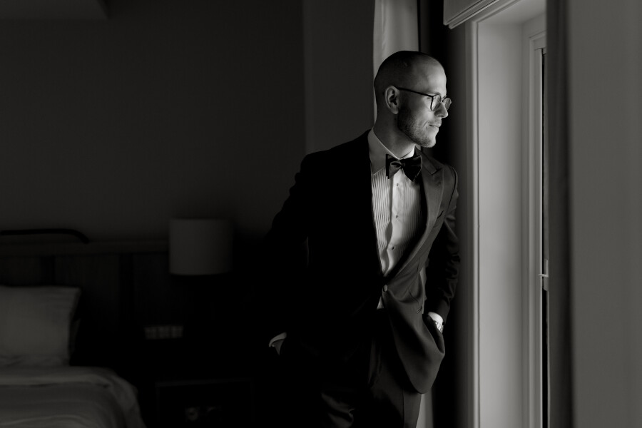 I always wanted a style that felt timeless and truly matched the overall vibe of the wedding. After trying on several suit styles, I ultimately chose a classic tuxedo with subtle alterations and unique features to make it my own. The suit was custom-made by the incredible team at Oscar Hunt, and I couldn't have asked for a more perfect fit.