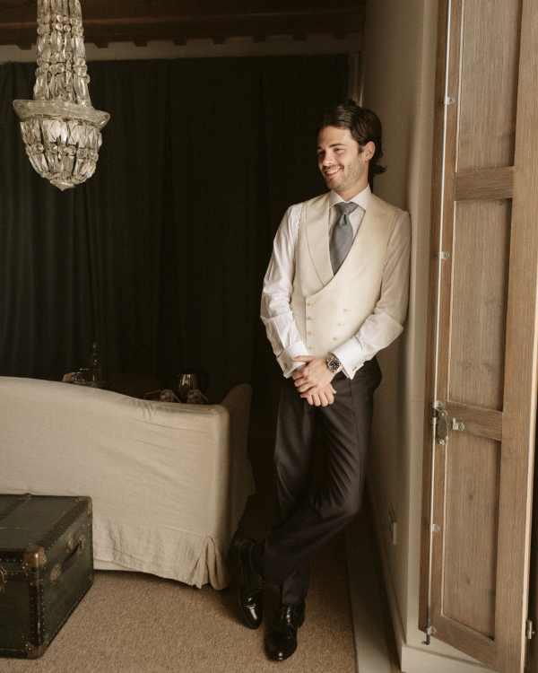 Max had his suit made at Santa Eulalia, in Barcelona. It was a quick decision; he knew from the beginning that he didn't want a tailcoat and that he wanted a very dark blue suit. The shoes were from Lotusse. The cufflinks were very special because they belonged to his late grandfather, and he wore the watch that my parents gifted him for the engagement.