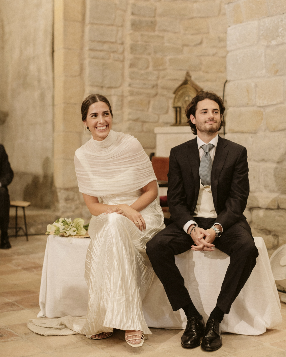 Laura and Max’s wedding was a celebration of love that felt both personal and intimate, yet bursting with fun. Surrounded by family and friends from every corner of the globe, they gathered in the picturesque region of Empordà, near Barcelona, to share in their joy. The ceremony was held in a charming village church, its modest beauty perfectly complemented by the floral arrangements of calla lilies and white anthuriums, exuding a sense of minimalism, simplicity, and elegance. As the sun began to set on this laid-back summer evening, guests made their way to a beautifully restored 19th-century farmhouse. Its old-world charm, complete with an outdoor patio bathed in warm twilight, was the perfect backdrop for an unforgettable reception. Laura was a vision of timeless beauty, wearing a pleated silk bridal gown by Danielle Frankel, paired with a flowing chiffon cape by The Muse Collective. A heartwarming, elegant wedding captured beautifully by wedding photographers Dos Mas En La Mesa.