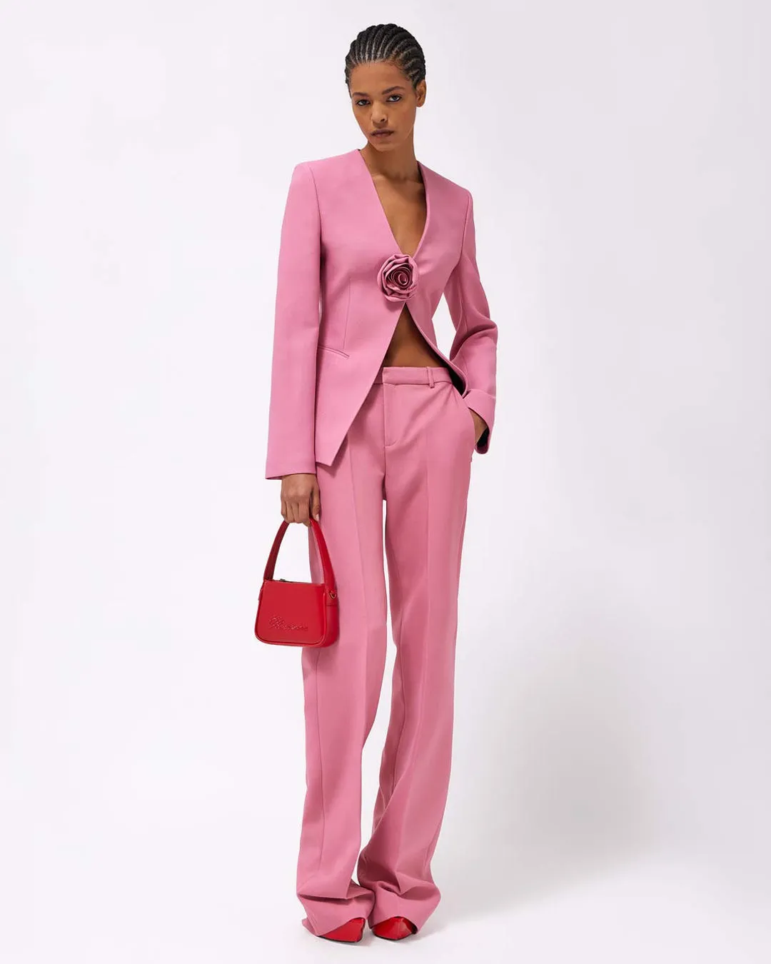 Blumarine Jacket with Rose Decoration, $666, and Straight Pants, $396
