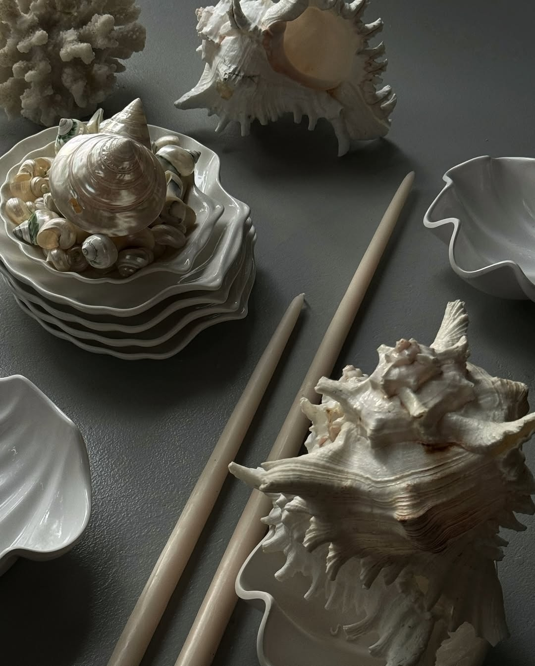 Sculptural coral-shaped and beachwood-inspired candle holders bring a refined, organic touch to coastal tablescapes, evoking the raw beauty of the sea without feeling overly themed. Coral candelabras mimic the delicate branches of a reef, casting intricate shadows as candlelight flickers through their sculptural forms, while driftwood-style holders add an earthy, sun-worn elegance, as if effortlessly washed ashore. For a more delicate touch, opt for a luminious finish with pearlescent shells or pearl beads anchoring the base of the candles in organic formations. Whether crafted from bleached ceramic, aged metals, or natural wood, these pieces ground the table in nature’s artistry.