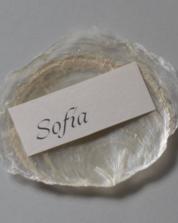 For a naturally elegant touch, shell name cards bring a refined, ocean-inspired element to the table. Whether using delicate oyster shells, pearlescent clamshells, or smooth scallops, each guest’s name can be hand-painted in soft calligraphy, gold leaf, or an etched engraving, blending personalization with coastal charm. The organic shapes and iridescent hues make each place setting feel bespoke, while the shells themselves double as a beautiful keepsake.