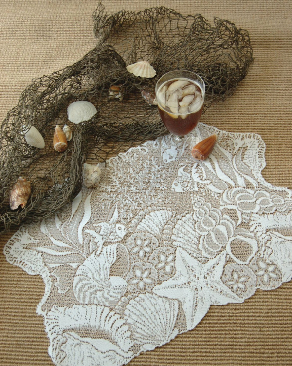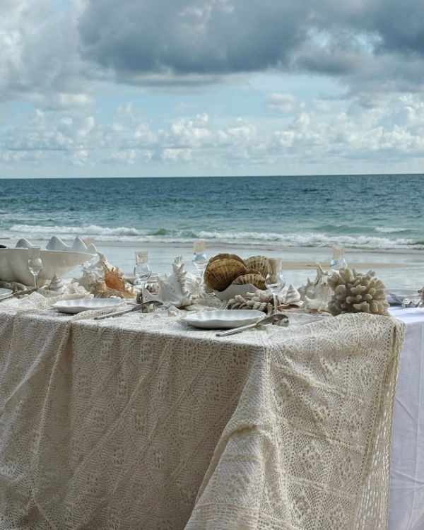 Adding a woven, net-like quality to your tablescape instantly brings a beachy, ethereal touch with a hint of vintage charm. Crochet-style placemats and delicately woven tablecloths mimic the intricate beauty of fishing nets, but in an elevated, romantic way—soft, airy, and effortlessly draped over tables. The open-weave texture allows candlelight to filter through, creating an almost dreamlike glow, while hand-knit doilies, macramé runners, or breezy lace overlays introduce an organic, seafoam-kissed elegance. Whether layered over sandy linens or paired with shell-adorned decor, this detail feels like a quiet nod to the ocean—subtle, sophisticated, and utterly timeless.