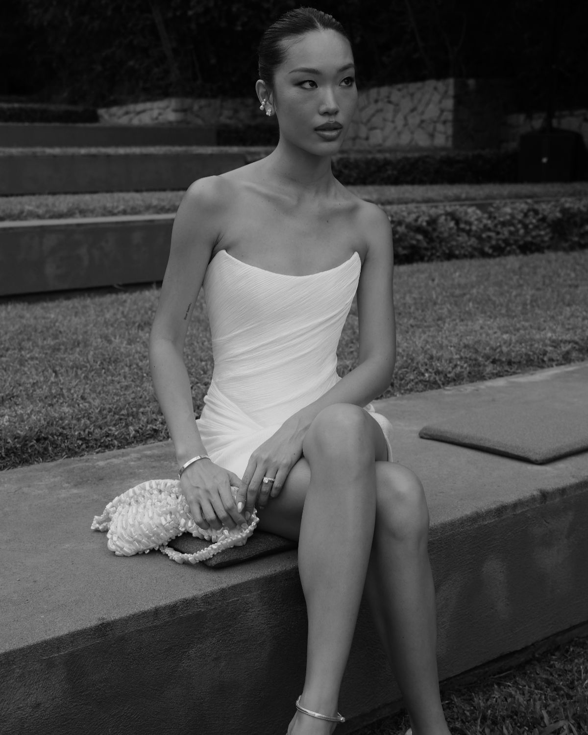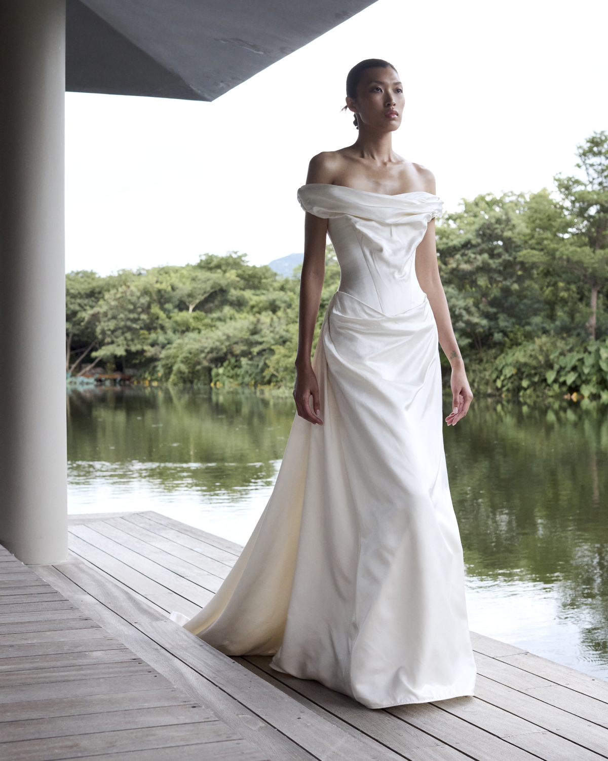 For KYHA Bride founder and designer, Kyha Scott, each collection begins not with fabric, but with a feeling—a place, a rhythm, a pulse that draws her in. 'Waterlines' is both an homage and an awakening: a journey through Vietnam’s landscapes, craftsmanship, and the artistry of water itself. Guided by curiosity and connection, Scott immersed herself in the country’s culture and its deep respect for process—learning ancient weaving techniques, tracing silk back to its origins, and distilling these discoveries into form and movement. The result is a collection that glows with quiet complexity: fluid yet architectural, grounded yet ethereal.