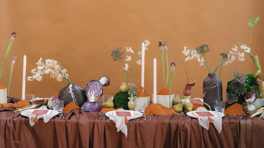 The tablescape pulses with the same creativity. Menus scatter across a dark cloth, candles glow beside ceramic risers, and vegetables take on new form as living art. It’s earthy and elevated, grounded and daring — a design that doesn’t just ask to be admired, but practically demands to be touched.