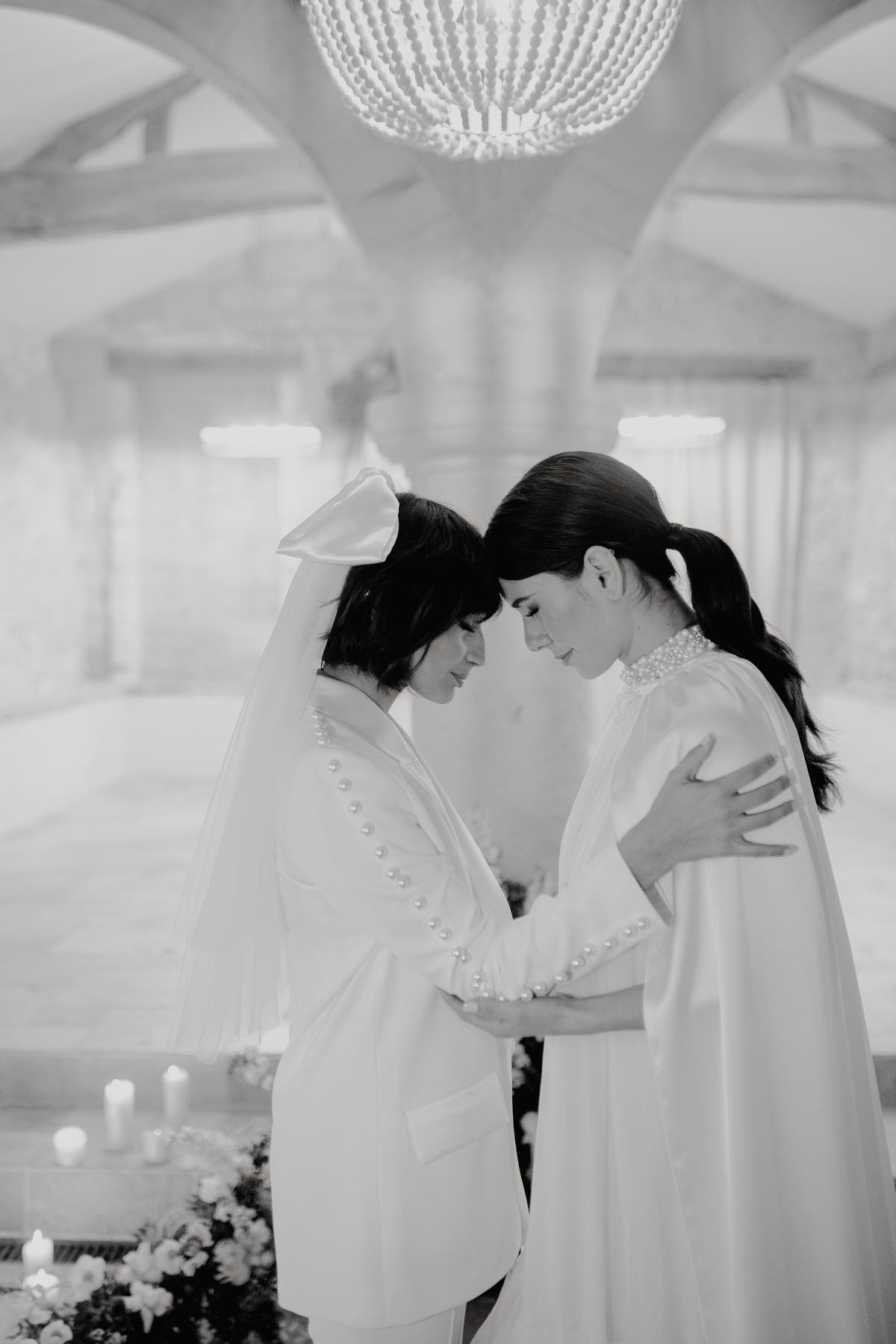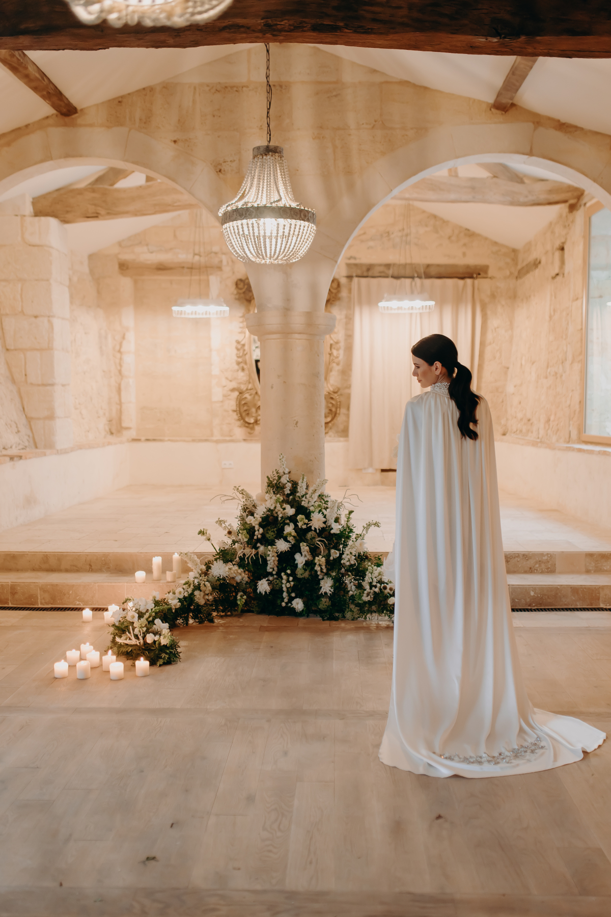 The breathtaking Chateau de Garde, nestled near the charming town of St Emilion in the South-West of France, served as a muse for this exquisite photoshoot. The aim was to transcend the conventional notions of bridal fashion and give rise to novel possibilities by pushing the limits of traditional wedding looks. The team strove to craft a delicate balance of understated elegance and opulence, infusing an air of timelessness and poise.