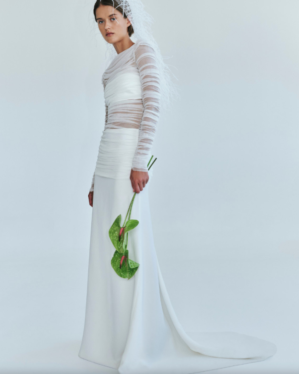 Part strap, part sleeve, fully modern. This silhouette pairs delicate spaghetti straps or structural bodices with sheer, lace-fitted sleeves that appear almost detached—giving the effect of layering without the bulk. It’s the ultimate in effortless cool: perfect for brides who love the idea of a sleeve but want something unexpected. Think lingerie-inspired elegance with an editorial panache.