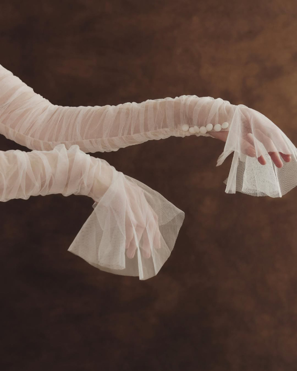These ruched long sleeves feature gentle gathering along the arm for a fitted, textured effect that’s equal parts flattering and fashion-forward. Often crafted from soft tulle or thick draped silk, they add a romantic, slightly vintage touch. Ideal for brides seeking subtle dimension with a dash of edge.