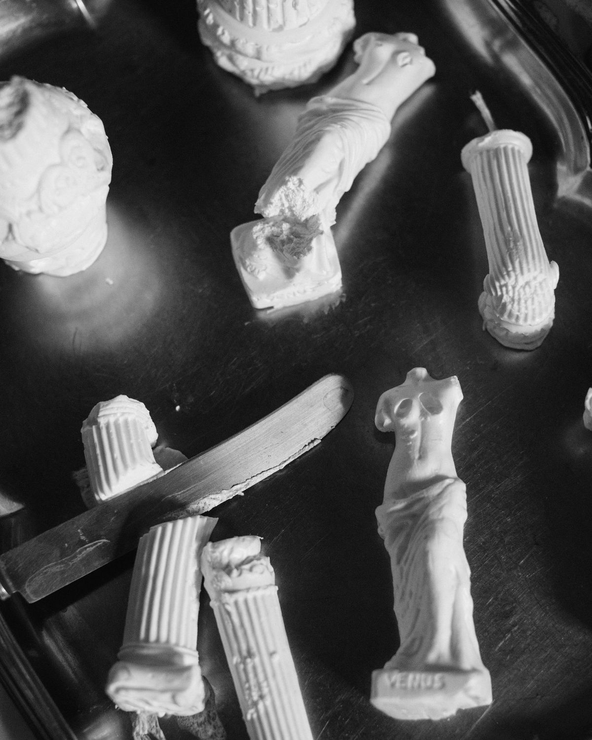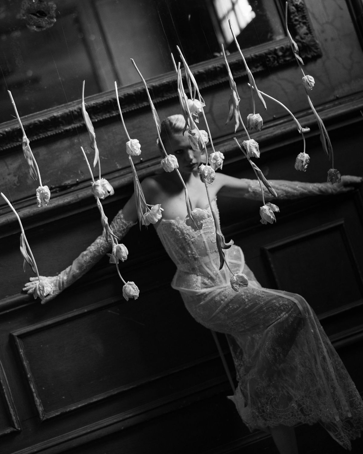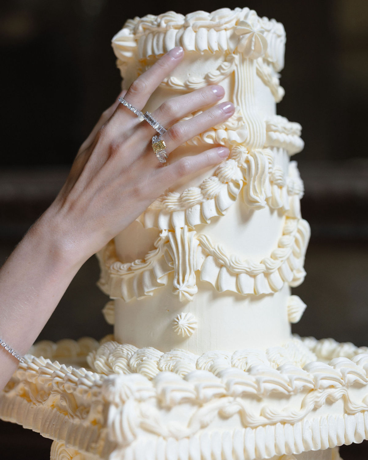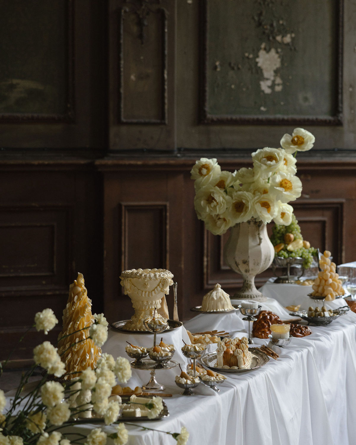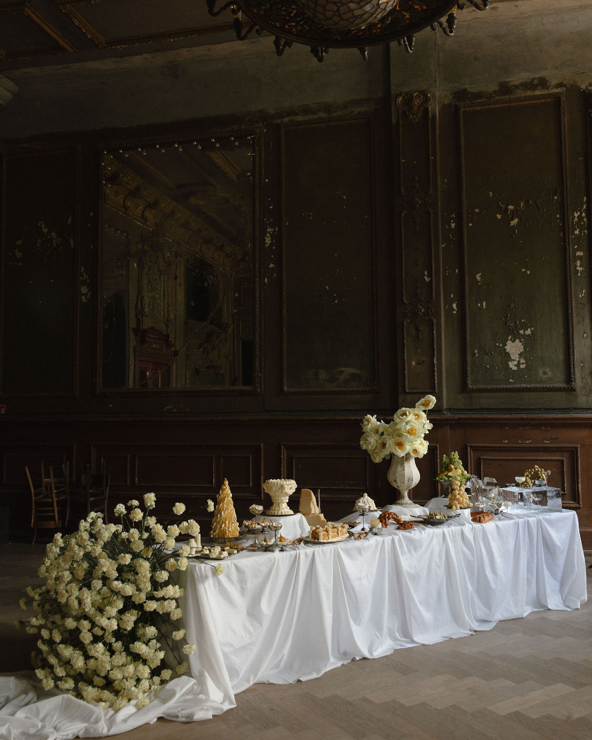 At the heart of the project is butter yellow, woven artfully through every detail, from the tablescape to the overall sensory experience. Handled with delicacy, the palette brings warmth and richness without excess, allowing the scene to feel both opulent and simple. More than mere decoration, carnations and peonies are arranged as sculpture, while the venue’s cracks and textures remain intentionally exposed. Light and space move through it all, carving moments of intimacy and depth. Each frame exists in a gentle balance between dream and reality, closeness and distance, clarity and blur. Here, love is captured not in perfection but in presence, a reminder that beauty often lives in the unpolished and the unspoken.