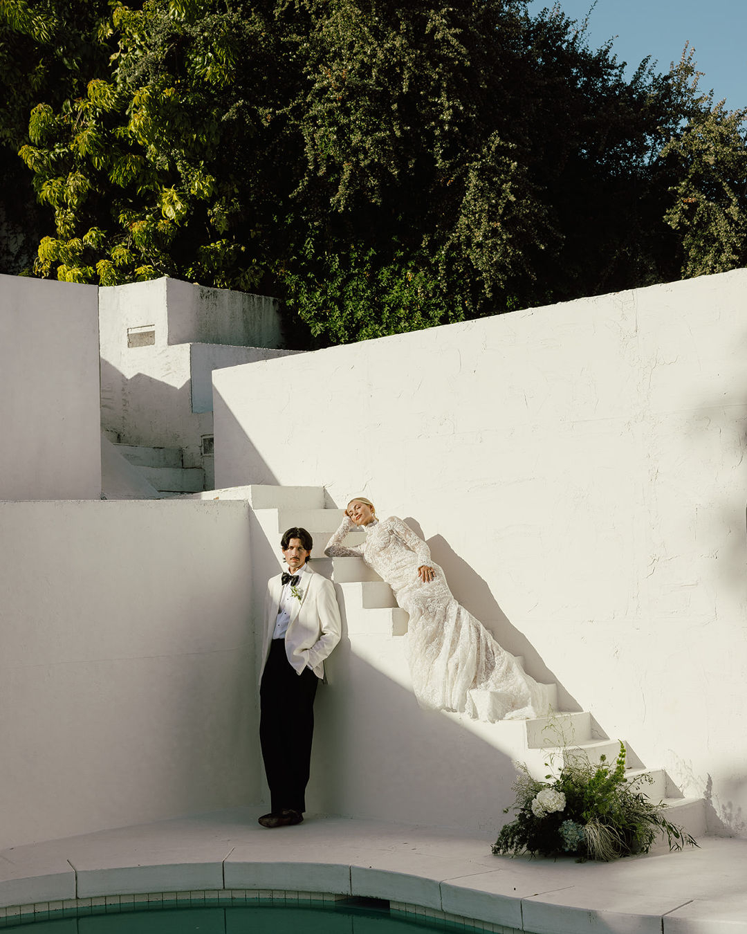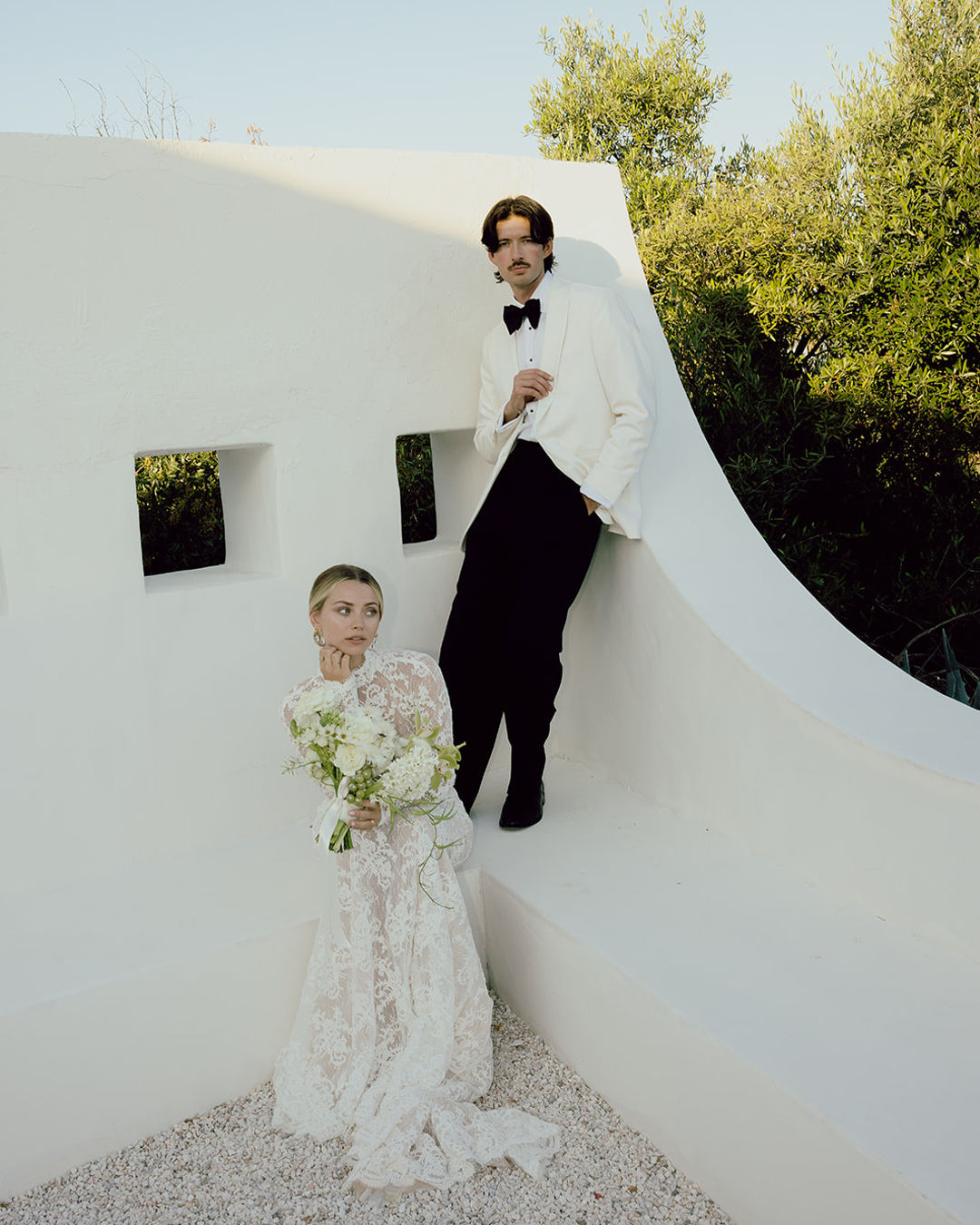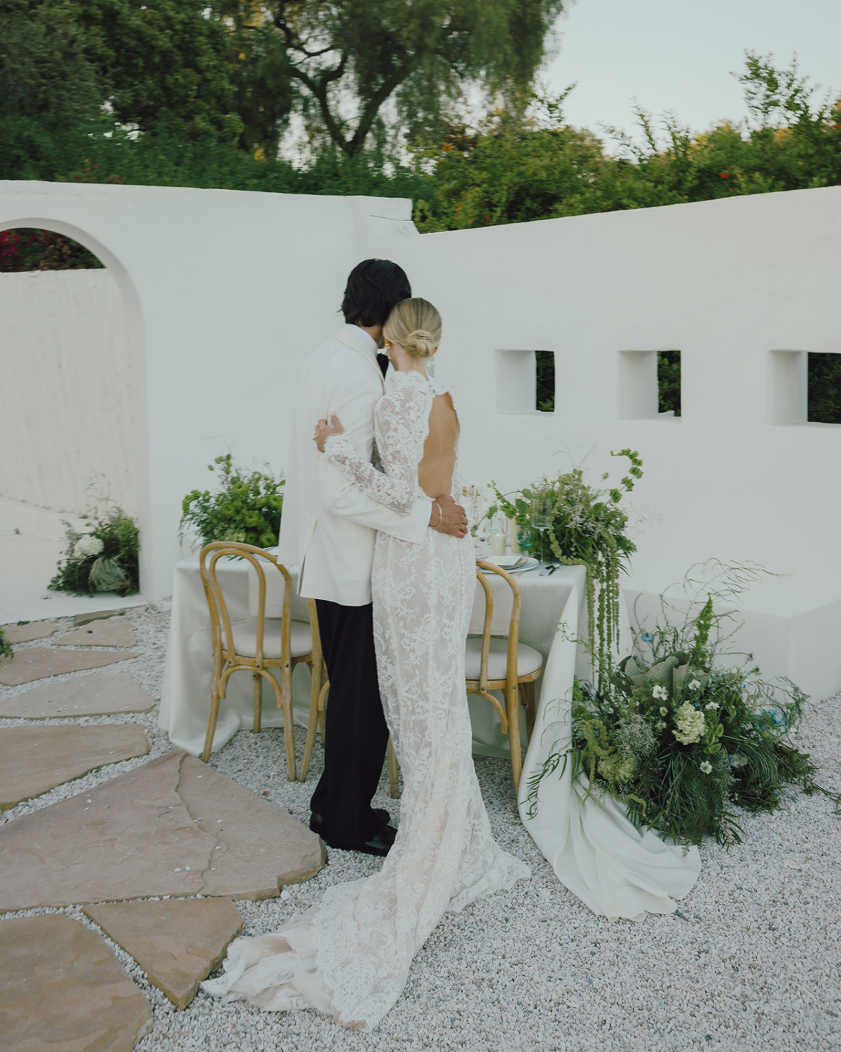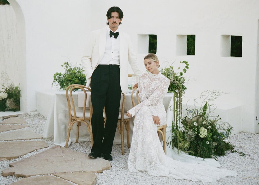 A Santorini-inspired vision meets a Californian spirit, weaving a timeless yet modern wedding story. Orchestrated by planner Moon Realm, the white-washed editorial fuses the simplicity of the venue with bold, overgrown foliage, effortlessly balancing the modern with the organic.
