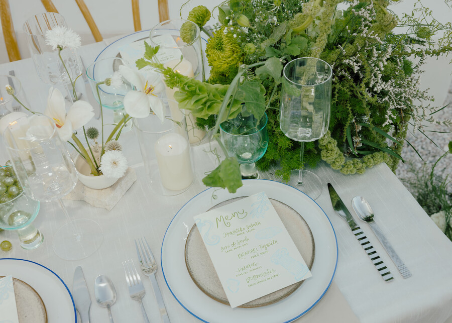 The meticulously crafted tablescape, inspired by Greek mythology, evokes the grandeur of Mount Olympus through thoughtful details: ivory and sand-hued linens, ocean blue-edged porcelain plates, sea green and clear textured glassware, and sleek chrome flatware. Crafted with purpose and heart, every element - from the lush blooms to the whimsical custom stationery - setting a poetic, ethereal ambiance where love reigns.