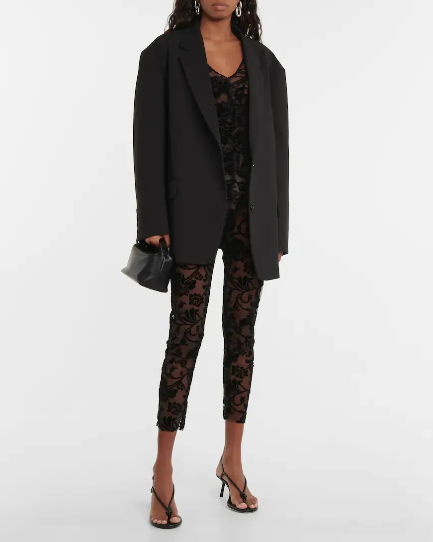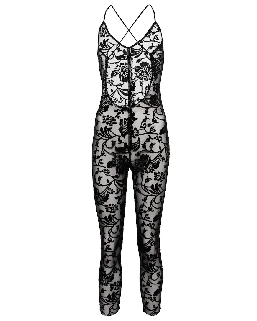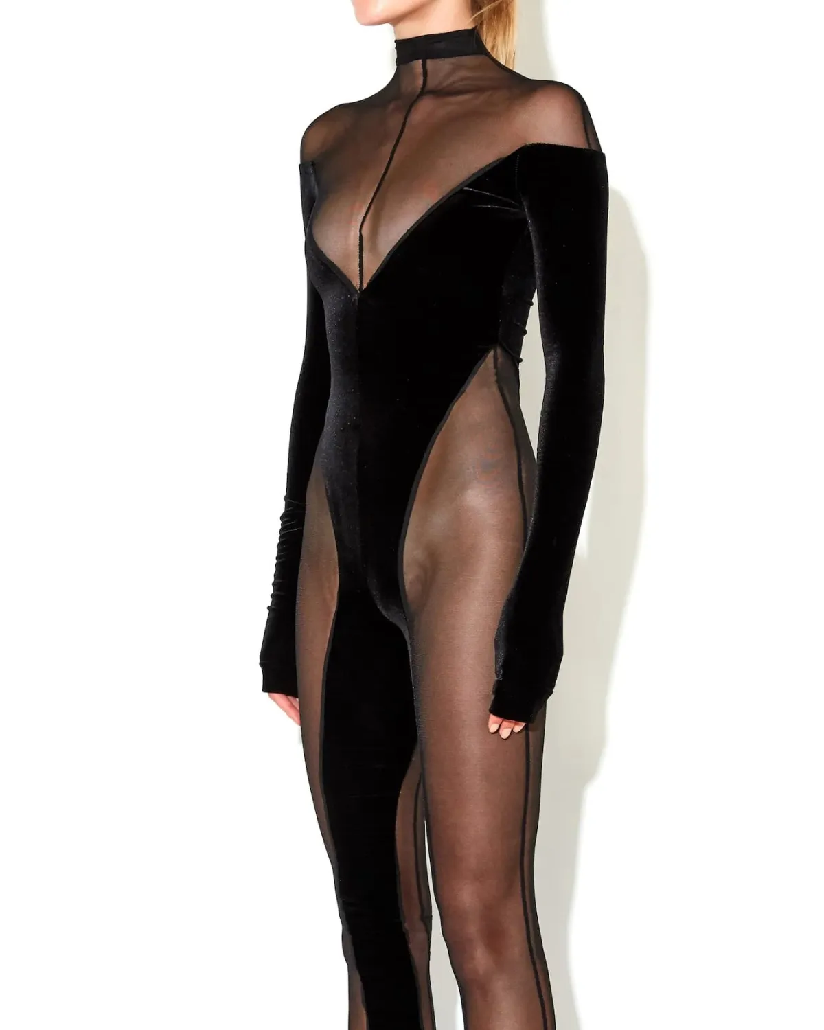 LaQuan Smith off the shoulder sheer and velvet catsuit, $700