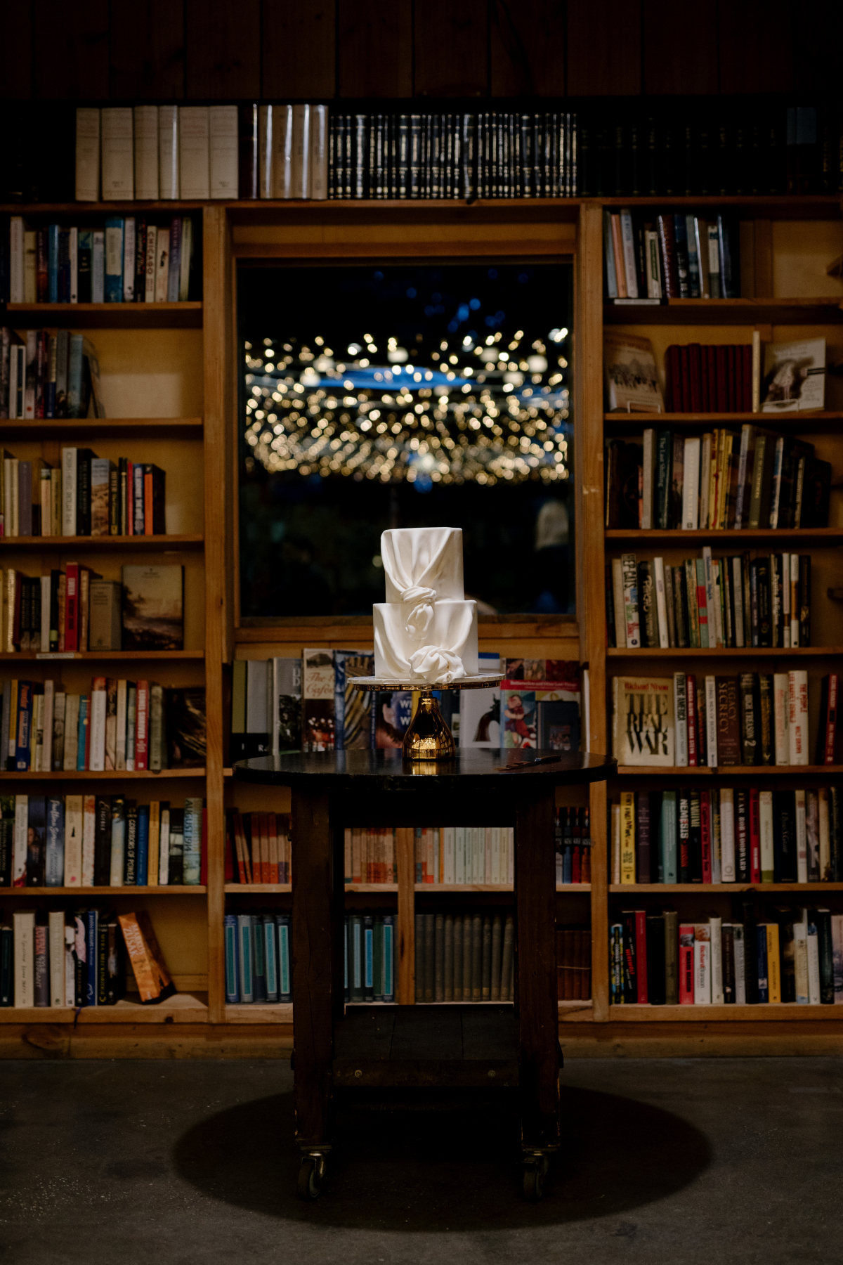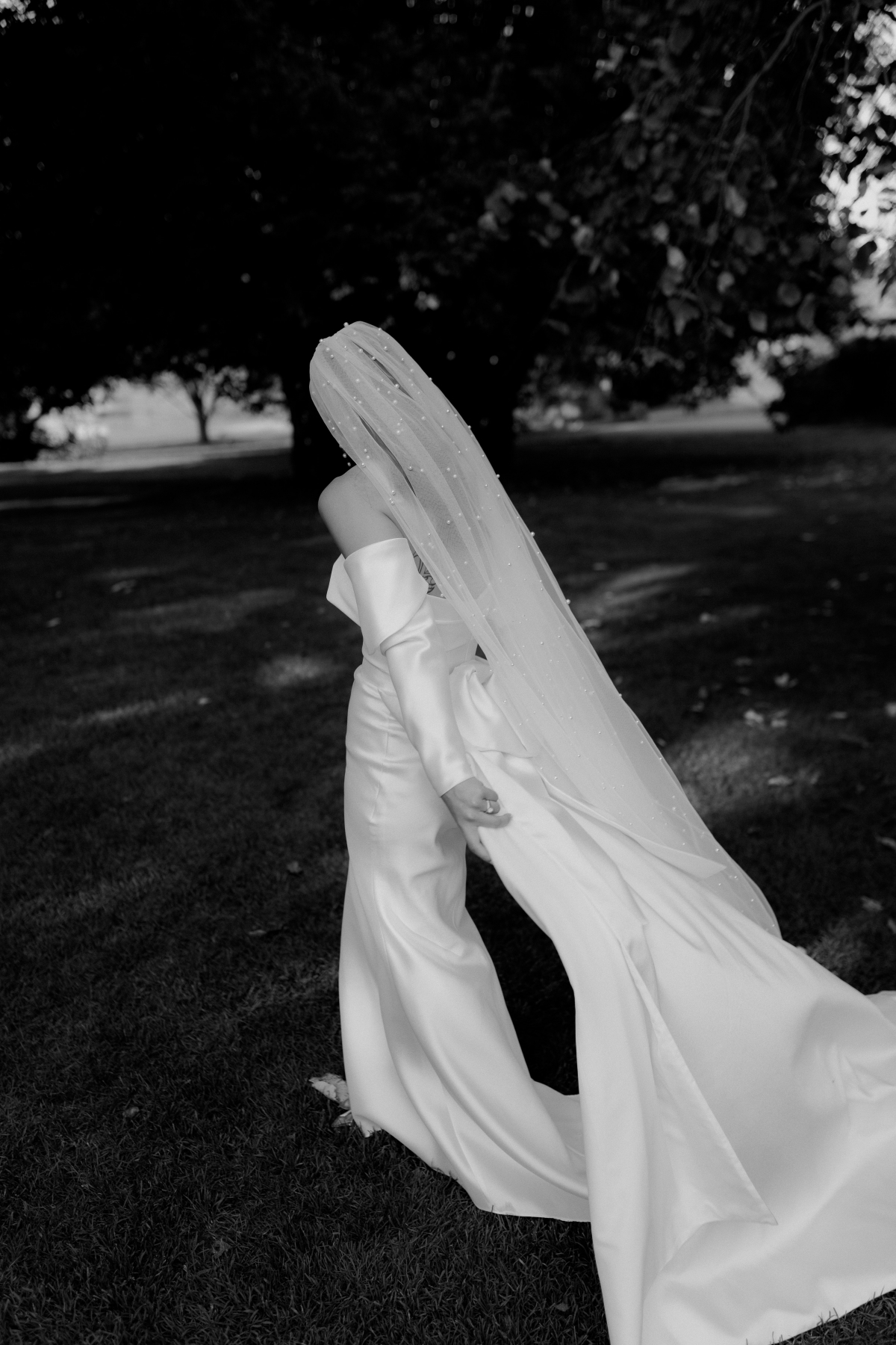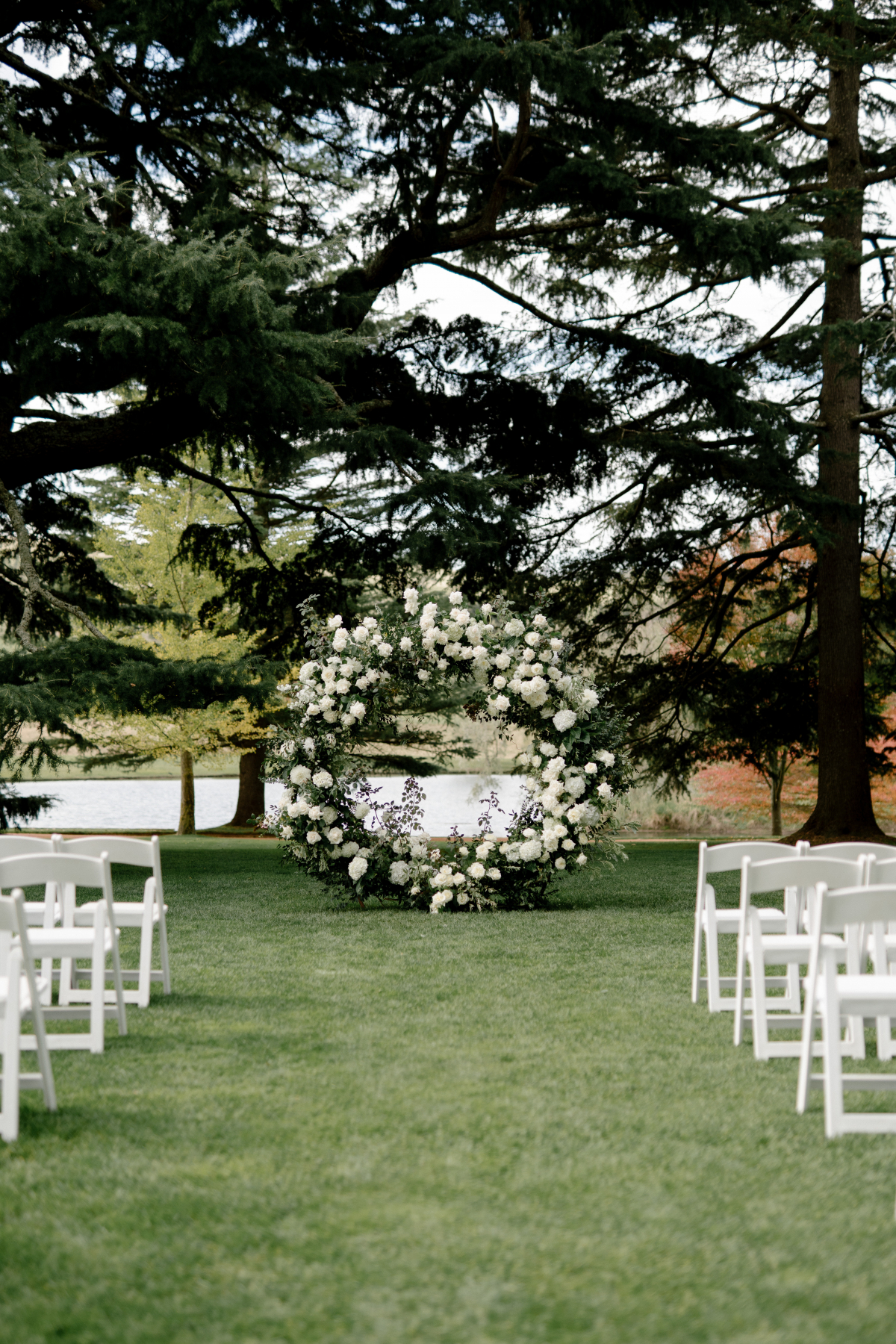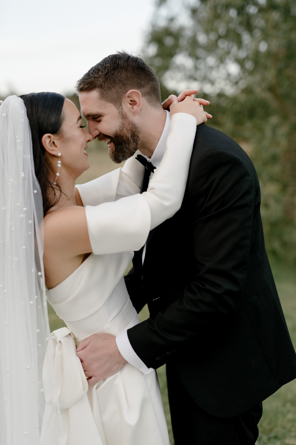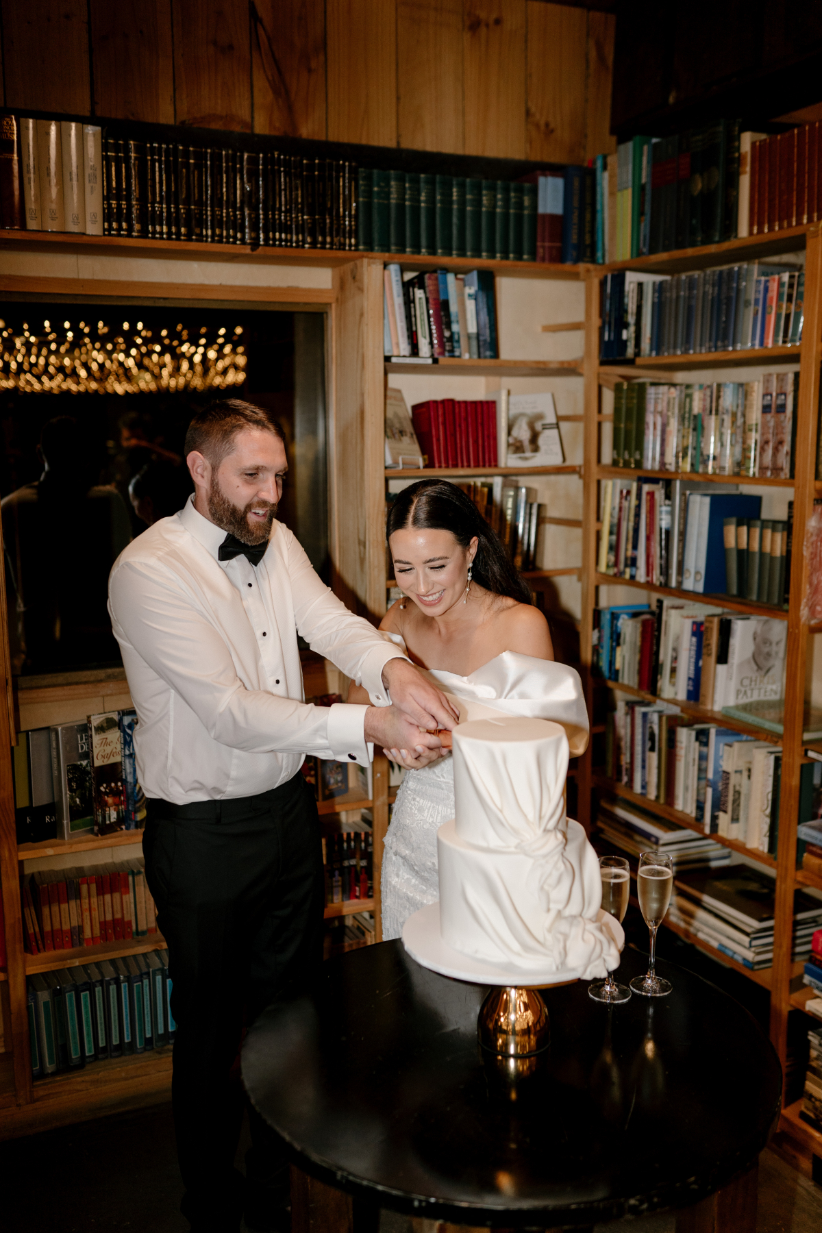 Held at the Bendooley Estate, Tessa & Lee's wedding was a beautiful blend of timeless elegance with chic and modern aesthetic. Every moment of this special day and every inch of the venue was a photographer's dream: from the serene lakeside/garden ceremony and the homestead to the countryside paddocks and the charming book barn illuminated by fairy lights. A special touch to the atmosphere was added by the red autumn leaves and floral arrangements — rambling white, ivory, and green seasonal blooms. As for style, the couple was the epitome of elegance. Tessa wore a gorgeous dress from Eva Lendel with a giant bow and dramatic skirt, offset by a fitted silhouette with custom-made sleeves. Her outfit was perfectly paired with gold shoes, a pearl veil, and long drop earrings. Lee looked just as stunning in his classic black tie suit and white shirt.