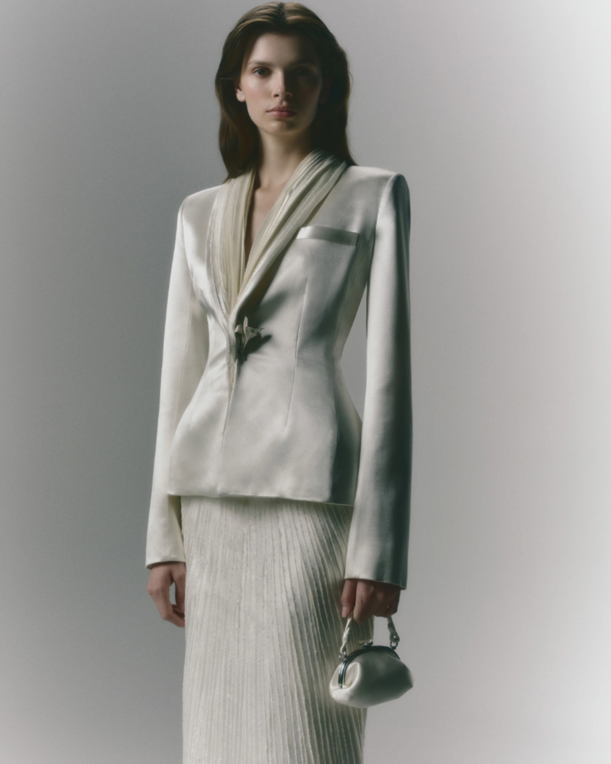 Short, sweet, and seriously stylish. A cropped jacket and matching mini skirt offers a flirty, fashion-forward take on bridal tailoring—ideal for warm-weather ceremonies or post-ceremony street strolls. Unlike the more structured pencil set, this version leans playful: think short-sleeved jackets, satin finishes, and retro-inspired cuts that nod to the ’60s. Bonus points for a bold shoe, vintage buttons, or puffed sleeves.