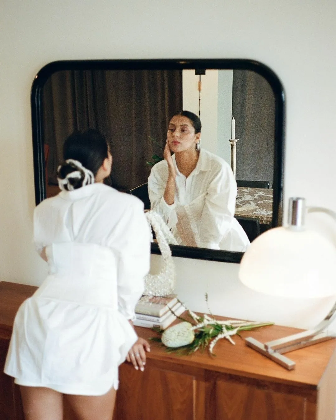 To determine what type of chignon suits you, I consider a few factors – accessories, confidence, and style. If you plan on wearing a veil or statement earrings, a low chignon with a clean part looks best. No accessories? No problem! Let your updo be the statement by pulling it up higher on your head. Ask yourself if you feel confident with all of your hair pulled back. If the answer is no, then pull out a small amount of hair to frame your face. Make sure these pieces begin at cheek or chin level and taper down no longer than two inches past your chin. Hair that is long and heavy around the face will give off 90s prom vibes, so plan a trim accordingly. Your personal style is also important when deciding the style of chignon that suits you. Ask yourself how you want to look and feel on your big day. Chic and girl next door, modern and editorial, Off duty model and effortless – the options are endless. Find three adjectives that describe how you want to feel on your special day and add those to your Pinterest search!