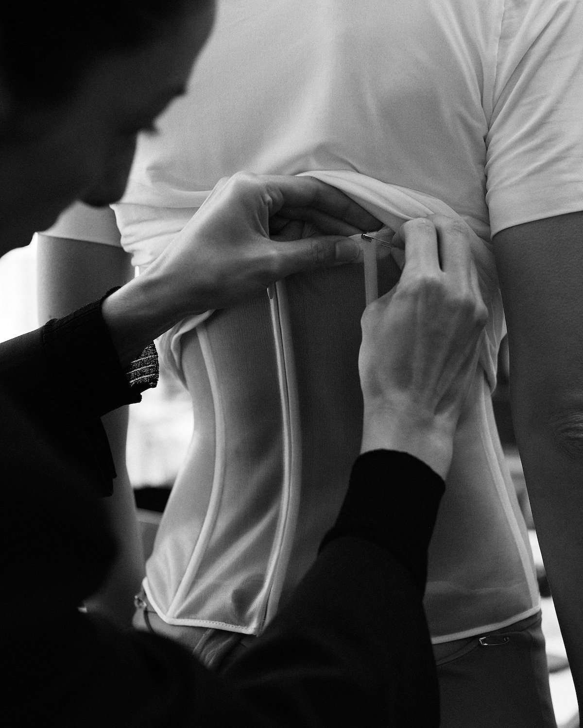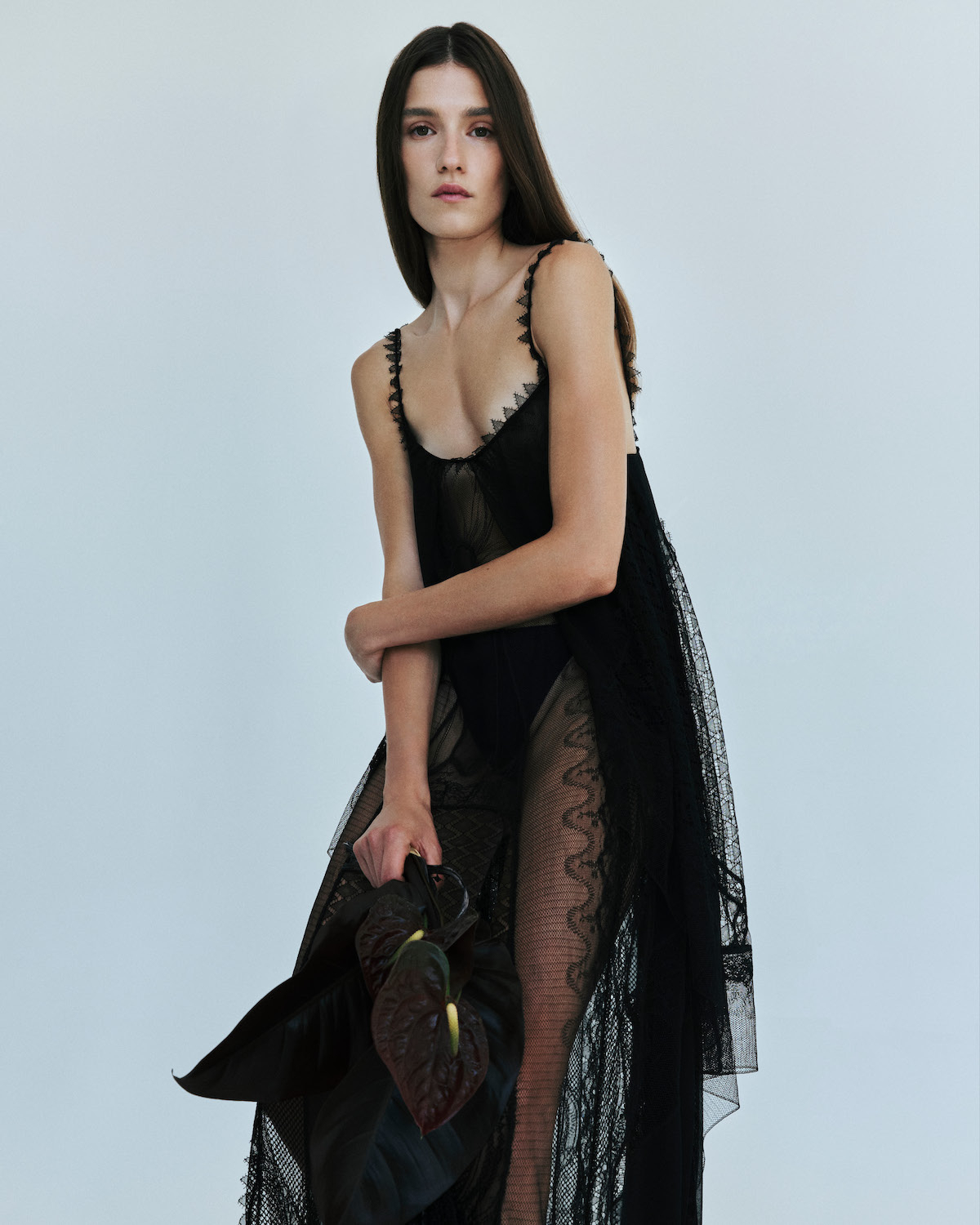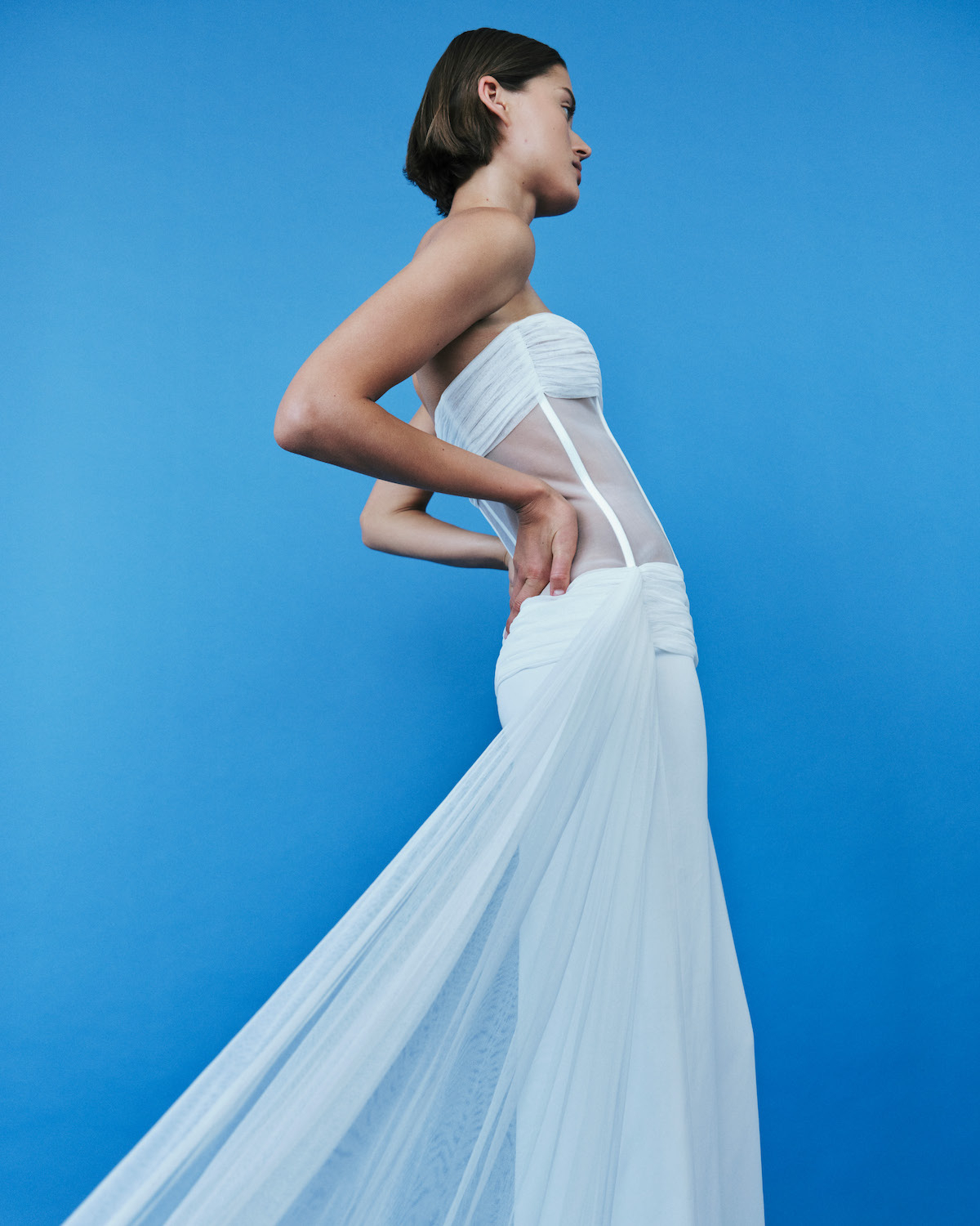 Lace is layered over a technical stretch bodysuit or offered as a mini dress. Soft, sheer tulle is used to conceal and reveal the body, or it ties at the back of a blazer in lieu of a train. Corsetry is presented in the form of sculptural silhouettes, with hand-manipulated wire creating organic shapes. A silk veil connects to a free-flowing dress, sublimating the body rather than the face.