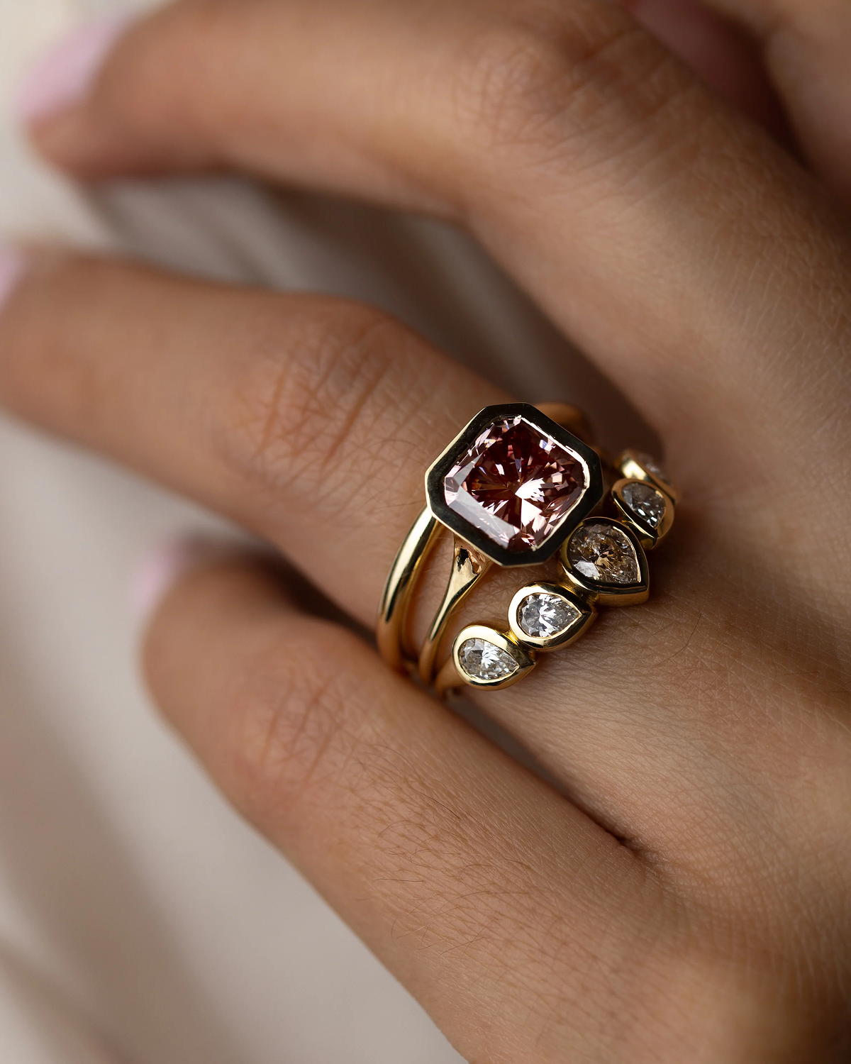 Subtle, sophisticated, and effortlessly chic, champagne diamonds are defined by their warm, earthy undertones. Their color ranges from pale honey to rich cognac, making them especially flattering against yellow gold. Champagne diamonds offer a quieter alternative to brighter stones, yet still offer something completely unique.